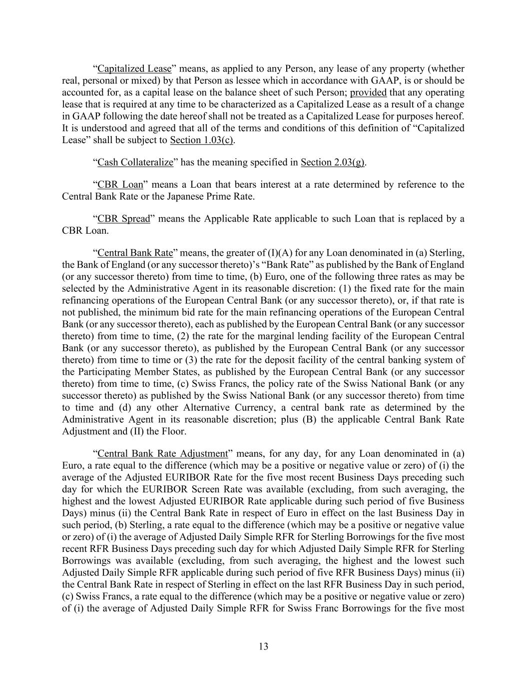 13 “Capitalized Lease” means, as applied to any Person, any lease of any property (whether real, personal or mixed) by that Person as lessee which in accordance with GAAP, is or should be accounted for, as a capital lease on the balance sheet of such Person; provided that any operating lease that is required at any time to be characterized as a Capitalized Lease as a result of a change in GAAP following the date hereof shall not be treated as a Capitalized Lease for purposes hereof. It is understood and agreed that all of the terms and conditions of this definition of “Capitalized Lease” shall be subject to Section 1.03(c). “Cash Collateralize” has the meaning specified in Section 2.03(g). “CBR Loan” means a Loan that bears interest at a rate determined by reference to the Central Bank Rate or the Japanese Prime Rate. “CBR Spread” means the Applicable Rate applicable to such Loan that is replaced by a CBR Loan. “Central Bank Rate” means, the greater of (I)(A) for any Loan denominated in (a) Sterling, the Bank of England (or any successor thereto)’s “Bank Rate” as published by the Bank of England (or any successor thereto) from time to time, (b) Euro, one of the following three rates as may be selected by the Administrative Agent in its reasonable discretion: (1) the fixed rate for the main refinancing operations of the European Central Bank (or any successor thereto), or, if that rate is not published, the minimum bid rate for the main refinancing operations of the European Central Bank (or any successor thereto), each as published by the European Central Bank (or any successor thereto) from time to time, (2) the rate for the marginal lending facility of the European Central Bank (or any successor thereto), as published by the European Central Bank (or any successor thereto) from time to time or (3) the rate for the deposit facility of the central banking system of the Participating Member States, as published by the European Central Bank (or any successor thereto) from time to time, (c) Swiss Francs, the policy rate of the Swiss National Bank (or any successor thereto) as published by the Swiss National Bank (or any successor thereto) from time to time and (d) any other Alternative Currency, a central bank rate as determined by the Administrative Agent in its reasonable discretion; plus (B) the applicable Central Bank Rate Adjustment and (II) the Floor. “Central Bank Rate Adjustment” means, for any day, for any Loan denominated in (a) Euro, a rate equal to the difference (which may be a positive or negative value or zero) of (i) the average of the Adjusted EURIBOR Rate for the five most recent Business Days preceding such day for which the EURIBOR Screen Rate was available (excluding, from such averaging, the highest and the lowest Adjusted EURIBOR Rate applicable during such period of five Business Days) minus (ii) the Central Bank Rate in respect of Euro in effect on the last Business Day in such period, (b) Sterling, a rate equal to the difference (which may be a positive or negative value or zero) of (i) the average of Adjusted Daily Simple RFR for Sterling Borrowings for the five most recent RFR Business Days preceding such day for which Adjusted Daily Simple RFR for Sterling Borrowings was available (excluding, from such averaging, the highest and the lowest such Adjusted Daily Simple RFR applicable during such period of five RFR Business Days) minus (ii) the Central Bank Rate in respect of Sterling in effect on the last RFR Business Day in such period, (c) Swiss Francs, a rate equal to the difference (which may be a positive or negative value or zero) of (i) the average of Adjusted Daily Simple RFR for Swiss Franc Borrowings for the five most