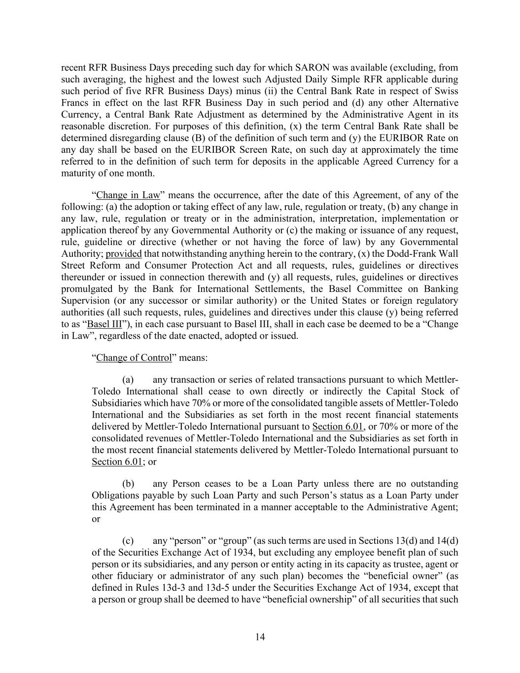 14 recent RFR Business Days preceding such day for which SARON was available (excluding, from such averaging, the highest and the lowest such Adjusted Daily Simple RFR applicable during such period of five RFR Business Days) minus (ii) the Central Bank Rate in respect of Swiss Francs in effect on the last RFR Business Day in such period and (d) any other Alternative Currency, a Central Bank Rate Adjustment as determined by the Administrative Agent in its reasonable discretion. For purposes of this definition, (x) the term Central Bank Rate shall be determined disregarding clause (B) of the definition of such term and (y) the EURIBOR Rate on any day shall be based on the EURIBOR Screen Rate, on such day at approximately the time referred to in the definition of such term for deposits in the applicable Agreed Currency for a maturity of one month. “Change in Law” means the occurrence, after the date of this Agreement, of any of the following: (a) the adoption or taking effect of any law, rule, regulation or treaty, (b) any change in any law, rule, regulation or treaty or in the administration, interpretation, implementation or application thereof by any Governmental Authority or (c) the making or issuance of any request, rule, guideline or directive (whether or not having the force of law) by any Governmental Authority; provided that notwithstanding anything herein to the contrary, (x) the Dodd-Frank Wall Street Reform and Consumer Protection Act and all requests, rules, guidelines or directives thereunder or issued in connection therewith and (y) all requests, rules, guidelines or directives promulgated by the Bank for International Settlements, the Basel Committee on Banking Supervision (or any successor or similar authority) or the United States or foreign regulatory authorities (all such requests, rules, guidelines and directives under this clause (y) being referred to as “Basel III”), in each case pursuant to Basel III, shall in each case be deemed to be a “Change in Law”, regardless of the date enacted, adopted or issued. “Change of Control” means: (a) any transaction or series of related transactions pursuant to which Mettler- Toledo International shall cease to own directly or indirectly the Capital Stock of Subsidiaries which have 70% or more of the consolidated tangible assets of Mettler-Toledo International and the Subsidiaries as set forth in the most recent financial statements delivered by Mettler-Toledo International pursuant to Section 6.01, or 70% or more of the consolidated revenues of Mettler-Toledo International and the Subsidiaries as set forth in the most recent financial statements delivered by Mettler-Toledo International pursuant to Section 6.01; or (b) any Person ceases to be a Loan Party unless there are no outstanding Obligations payable by such Loan Party and such Person’s status as a Loan Party under this Agreement has been terminated in a manner acceptable to the Administrative Agent; or (c) any “person” or “group” (as such terms are used in Sections 13(d) and 14(d) of the Securities Exchange Act of 1934, but excluding any employee benefit plan of such person or its subsidiaries, and any person or entity acting in its capacity as trustee, agent or other fiduciary or administrator of any such plan) becomes the “beneficial owner” (as defined in Rules 13d-3 and 13d-5 under the Securities Exchange Act of 1934, except that a person or group shall be deemed to have “beneficial ownership” of all securities that such