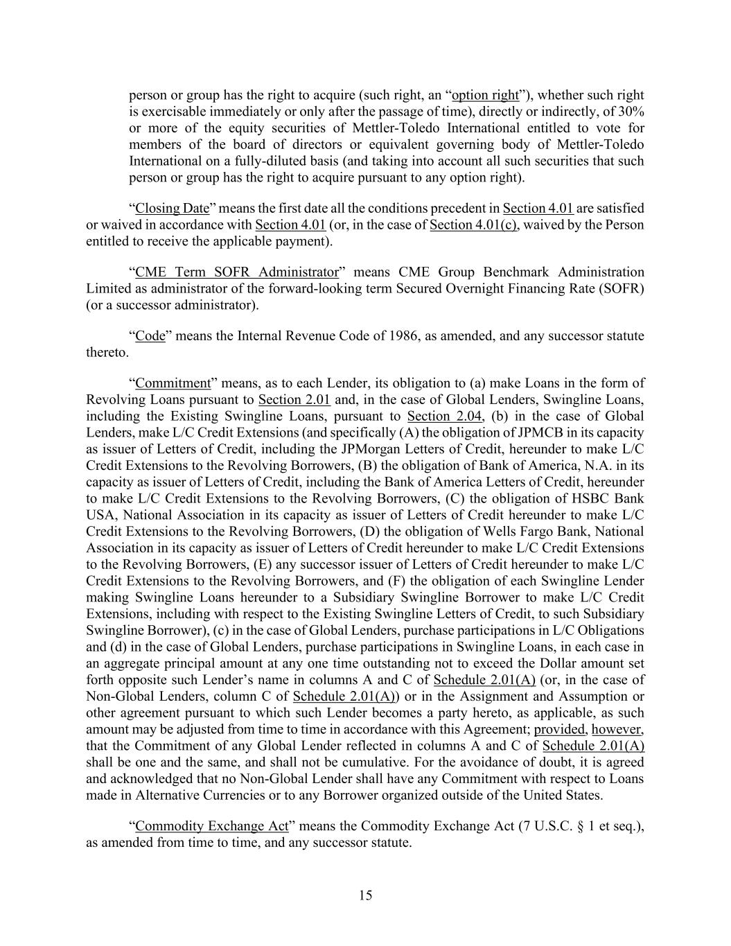 15 person or group has the right to acquire (such right, an “option right”), whether such right is exercisable immediately or only after the passage of time), directly or indirectly, of 30% or more of the equity securities of Mettler-Toledo International entitled to vote for members of the board of directors or equivalent governing body of Mettler-Toledo International on a fully-diluted basis (and taking into account all such securities that such person or group has the right to acquire pursuant to any option right). “Closing Date” means the first date all the conditions precedent in Section 4.01 are satisfied or waived in accordance with Section 4.01 (or, in the case of Section 4.01(c), waived by the Person entitled to receive the applicable payment). “CME Term SOFR Administrator” means CME Group Benchmark Administration Limited as administrator of the forward-looking term Secured Overnight Financing Rate (SOFR) (or a successor administrator). “Code” means the Internal Revenue Code of 1986, as amended, and any successor statute thereto. “Commitment” means, as to each Lender, its obligation to (a) make Loans in the form of Revolving Loans pursuant to Section 2.01 and, in the case of Global Lenders, Swingline Loans, including the Existing Swingline Loans, pursuant to Section 2.04, (b) in the case of Global Lenders, make L/C Credit Extensions (and specifically (A) the obligation of JPMCB in its capacity as issuer of Letters of Credit, including the JPMorgan Letters of Credit, hereunder to make L/C Credit Extensions to the Revolving Borrowers, (B) the obligation of Bank of America, N.A. in its capacity as issuer of Letters of Credit, including the Bank of America Letters of Credit, hereunder to make L/C Credit Extensions to the Revolving Borrowers, (C) the obligation of HSBC Bank USA, National Association in its capacity as issuer of Letters of Credit hereunder to make L/C Credit Extensions to the Revolving Borrowers, (D) the obligation of Wells Fargo Bank, National Association in its capacity as issuer of Letters of Credit hereunder to make L/C Credit Extensions to the Revolving Borrowers, (E) any successor issuer of Letters of Credit hereunder to make L/C Credit Extensions to the Revolving Borrowers, and (F) the obligation of each Swingline Lender making Swingline Loans hereunder to a Subsidiary Swingline Borrower to make L/C Credit Extensions, including with respect to the Existing Swingline Letters of Credit, to such Subsidiary Swingline Borrower), (c) in the case of Global Lenders, purchase participations in L/C Obligations and (d) in the case of Global Lenders, purchase participations in Swingline Loans, in each case in an aggregate principal amount at any one time outstanding not to exceed the Dollar amount set forth opposite such Lender’s name in columns A and C of Schedule 2.01(A) (or, in the case of Non-Global Lenders, column C of Schedule 2.01(A)) or in the Assignment and Assumption or other agreement pursuant to which such Lender becomes a party hereto, as applicable, as such amount may be adjusted from time to time in accordance with this Agreement; provided, however, that the Commitment of any Global Lender reflected in columns A and C of Schedule 2.01(A) shall be one and the same, and shall not be cumulative. For the avoidance of doubt, it is agreed and acknowledged that no Non-Global Lender shall have any Commitment with respect to Loans made in Alternative Currencies or to any Borrower organized outside of the United States. “Commodity Exchange Act” means the Commodity Exchange Act (7 U.S.C. § 1 et seq.), as amended from time to time, and any successor statute.