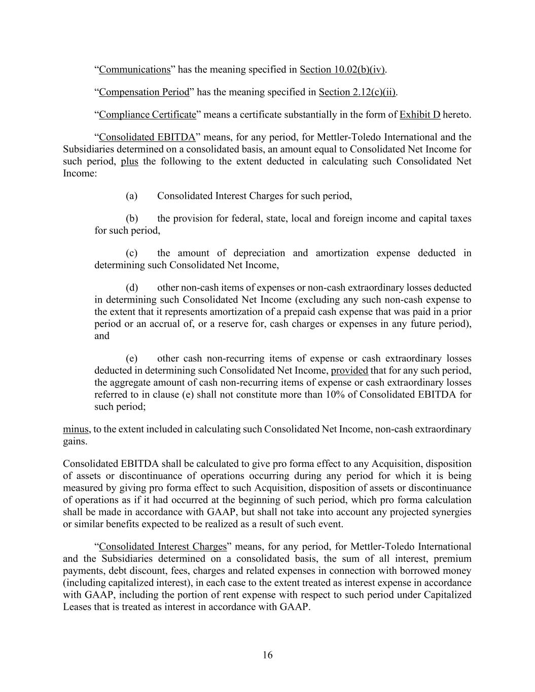 16 “Communications” has the meaning specified in Section 10.02(b)(iv). “Compensation Period” has the meaning specified in Section 2.12(c)(ii). “Compliance Certificate” means a certificate substantially in the form of Exhibit D hereto. “Consolidated EBITDA” means, for any period, for Mettler-Toledo International and the Subsidiaries determined on a consolidated basis, an amount equal to Consolidated Net Income for such period, plus the following to the extent deducted in calculating such Consolidated Net Income: (a) Consolidated Interest Charges for such period, (b) the provision for federal, state, local and foreign income and capital taxes for such period, (c) the amount of depreciation and amortization expense deducted in determining such Consolidated Net Income, (d) other non-cash items of expenses or non-cash extraordinary losses deducted in determining such Consolidated Net Income (excluding any such non-cash expense to the extent that it represents amortization of a prepaid cash expense that was paid in a prior period or an accrual of, or a reserve for, cash charges or expenses in any future period), and (e) other cash non-recurring items of expense or cash extraordinary losses deducted in determining such Consolidated Net Income, provided that for any such period, the aggregate amount of cash non-recurring items of expense or cash extraordinary losses referred to in clause (e) shall not constitute more than 10% of Consolidated EBITDA for such period; minus, to the extent included in calculating such Consolidated Net Income, non-cash extraordinary gains. Consolidated EBITDA shall be calculated to give pro forma effect to any Acquisition, disposition of assets or discontinuance of operations occurring during any period for which it is being measured by giving pro forma effect to such Acquisition, disposition of assets or discontinuance of operations as if it had occurred at the beginning of such period, which pro forma calculation shall be made in accordance with GAAP, but shall not take into account any projected synergies or similar benefits expected to be realized as a result of such event. “Consolidated Interest Charges” means, for any period, for Mettler-Toledo International and the Subsidiaries determined on a consolidated basis, the sum of all interest, premium payments, debt discount, fees, charges and related expenses in connection with borrowed money (including capitalized interest), in each case to the extent treated as interest expense in accordance with GAAP, including the portion of rent expense with respect to such period under Capitalized Leases that is treated as interest in accordance with GAAP.
