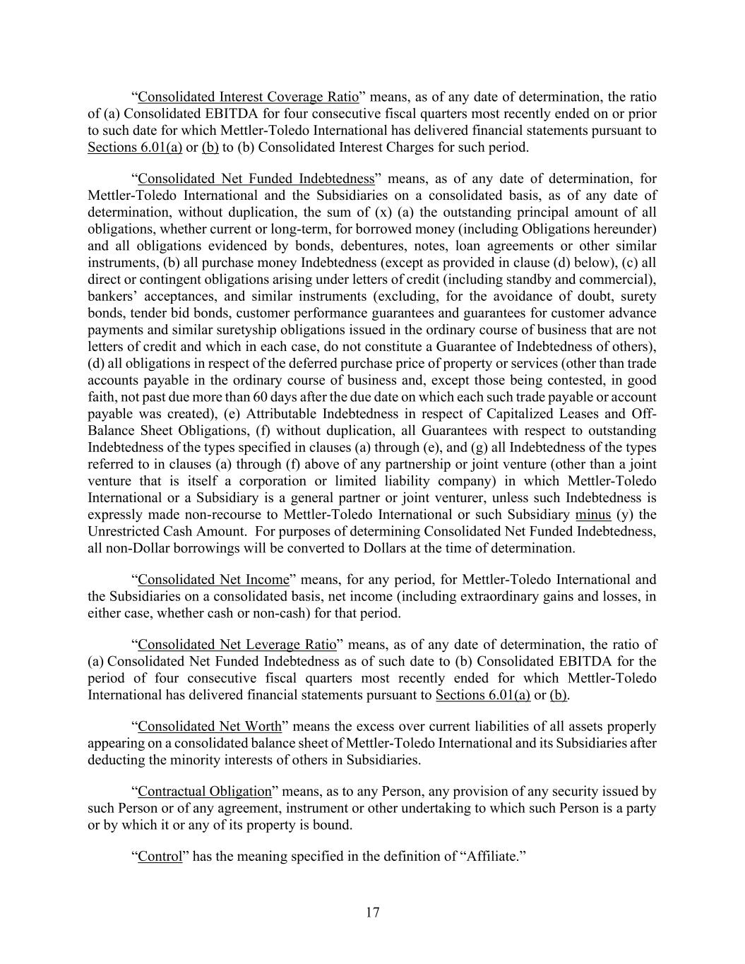 17 “Consolidated Interest Coverage Ratio” means, as of any date of determination, the ratio of (a) Consolidated EBITDA for four consecutive fiscal quarters most recently ended on or prior to such date for which Mettler-Toledo International has delivered financial statements pursuant to Sections 6.01(a) or (b) to (b) Consolidated Interest Charges for such period. “Consolidated Net Funded Indebtedness” means, as of any date of determination, for Mettler-Toledo International and the Subsidiaries on a consolidated basis, as of any date of determination, without duplication, the sum of (x) (a) the outstanding principal amount of all obligations, whether current or long-term, for borrowed money (including Obligations hereunder) and all obligations evidenced by bonds, debentures, notes, loan agreements or other similar instruments, (b) all purchase money Indebtedness (except as provided in clause (d) below), (c) all direct or contingent obligations arising under letters of credit (including standby and commercial), bankers’ acceptances, and similar instruments (excluding, for the avoidance of doubt, surety bonds, tender bid bonds, customer performance guarantees and guarantees for customer advance payments and similar suretyship obligations issued in the ordinary course of business that are not letters of credit and which in each case, do not constitute a Guarantee of Indebtedness of others), (d) all obligations in respect of the deferred purchase price of property or services (other than trade accounts payable in the ordinary course of business and, except those being contested, in good faith, not past due more than 60 days after the due date on which each such trade payable or account payable was created), (e) Attributable Indebtedness in respect of Capitalized Leases and Off- Balance Sheet Obligations, (f) without duplication, all Guarantees with respect to outstanding Indebtedness of the types specified in clauses (a) through (e), and (g) all Indebtedness of the types referred to in clauses (a) through (f) above of any partnership or joint venture (other than a joint venture that is itself a corporation or limited liability company) in which Mettler-Toledo International or a Subsidiary is a general partner or joint venturer, unless such Indebtedness is expressly made non-recourse to Mettler-Toledo International or such Subsidiary minus (y) the Unrestricted Cash Amount. For purposes of determining Consolidated Net Funded Indebtedness, all non-Dollar borrowings will be converted to Dollars at the time of determination. “Consolidated Net Income” means, for any period, for Mettler-Toledo International and the Subsidiaries on a consolidated basis, net income (including extraordinary gains and losses, in either case, whether cash or non-cash) for that period. “Consolidated Net Leverage Ratio” means, as of any date of determination, the ratio of (a) Consolidated Net Funded Indebtedness as of such date to (b) Consolidated EBITDA for the period of four consecutive fiscal quarters most recently ended for which Mettler-Toledo International has delivered financial statements pursuant to Sections 6.01(a) or (b). “Consolidated Net Worth” means the excess over current liabilities of all assets properly appearing on a consolidated balance sheet of Mettler-Toledo International and its Subsidiaries after deducting the minority interests of others in Subsidiaries. “Contractual Obligation” means, as to any Person, any provision of any security issued by such Person or of any agreement, instrument or other undertaking to which such Person is a party or by which it or any of its property is bound. “Control” has the meaning specified in the definition of “Affiliate.”