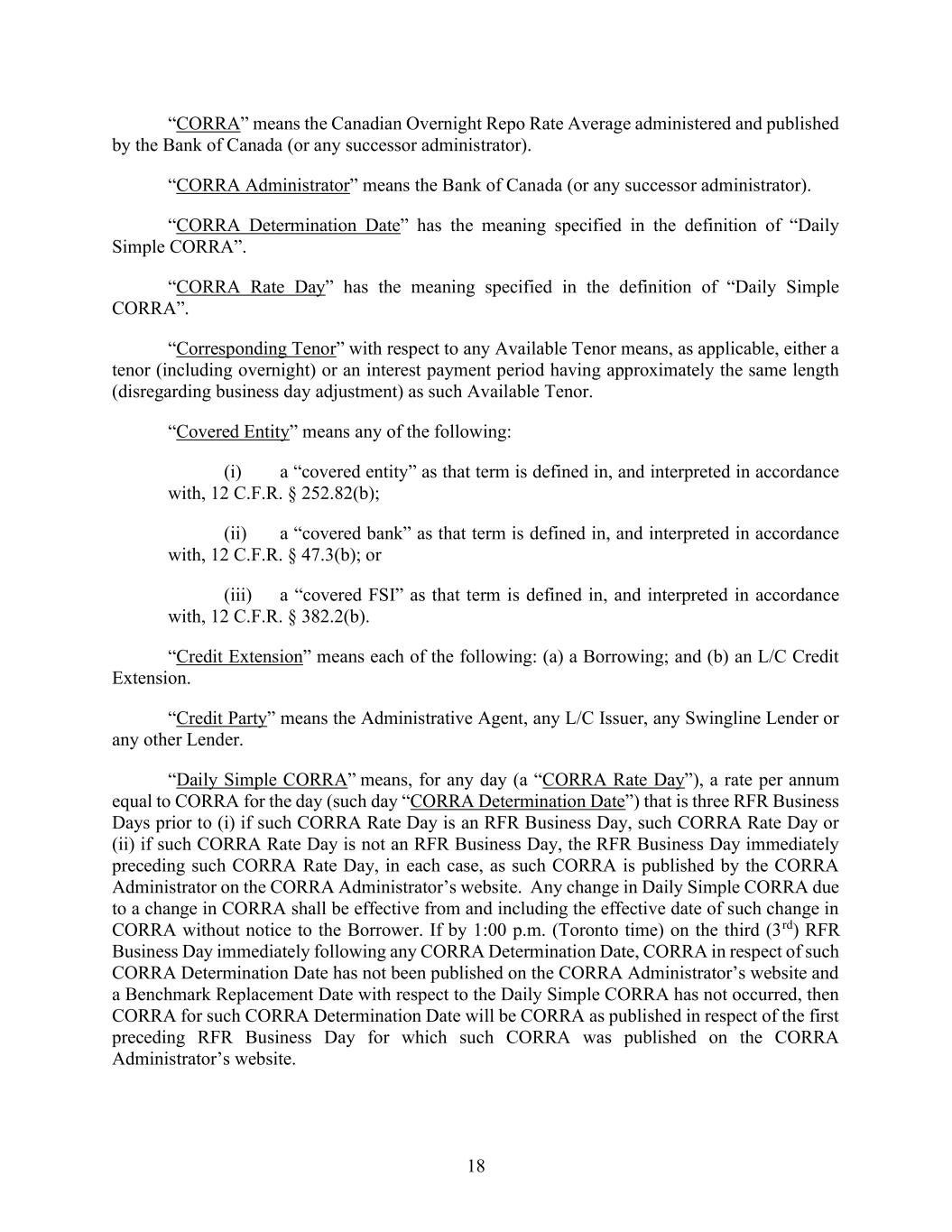 18 “CORRA” means the Canadian Overnight Repo Rate Average administered and published by the Bank of Canada (or any successor administrator). “CORRA Administrator” means the Bank of Canada (or any successor administrator). “CORRA Determination Date” has the meaning specified in the definition of “Daily Simple CORRA”. “CORRA Rate Day” has the meaning specified in the definition of “Daily Simple CORRA”. “Corresponding Tenor” with respect to any Available Tenor means, as applicable, either a tenor (including overnight) or an interest payment period having approximately the same length (disregarding business day adjustment) as such Available Tenor. “Covered Entity” means any of the following: (i) a “covered entity” as that term is defined in, and interpreted in accordance with, 12 C.F.R. § 252.82(b); (ii) a “covered bank” as that term is defined in, and interpreted in accordance with, 12 C.F.R. § 47.3(b); or (iii) a “covered FSI” as that term is defined in, and interpreted in accordance with, 12 C.F.R. § 382.2(b). “Credit Extension” means each of the following: (a) a Borrowing; and (b) an L/C Credit Extension. “Credit Party” means the Administrative Agent, any L/C Issuer, any Swingline Lender or any other Lender. “Daily Simple CORRA” means, for any day (a “CORRA Rate Day”), a rate per annum equal to CORRA for the day (such day “CORRA Determination Date”) that is three RFR Business Days prior to (i) if such CORRA Rate Day is an RFR Business Day, such CORRA Rate Day or (ii) if such CORRA Rate Day is not an RFR Business Day, the RFR Business Day immediately preceding such CORRA Rate Day, in each case, as such CORRA is published by the CORRA Administrator on the CORRA Administrator’s website. Any change in Daily Simple CORRA due to a change in CORRA shall be effective from and including the effective date of such change in CORRA without notice to the Borrower. If by 1:00 p.m. (Toronto time) on the third (3rd) RFR Business Day immediately following any CORRA Determination Date, CORRA in respect of such CORRA Determination Date has not been published on the CORRA Administrator’s website and a Benchmark Replacement Date with respect to the Daily Simple CORRA has not occurred, then CORRA for such CORRA Determination Date will be CORRA as published in respect of the first preceding RFR Business Day for which such CORRA was published on the CORRA Administrator’s website.