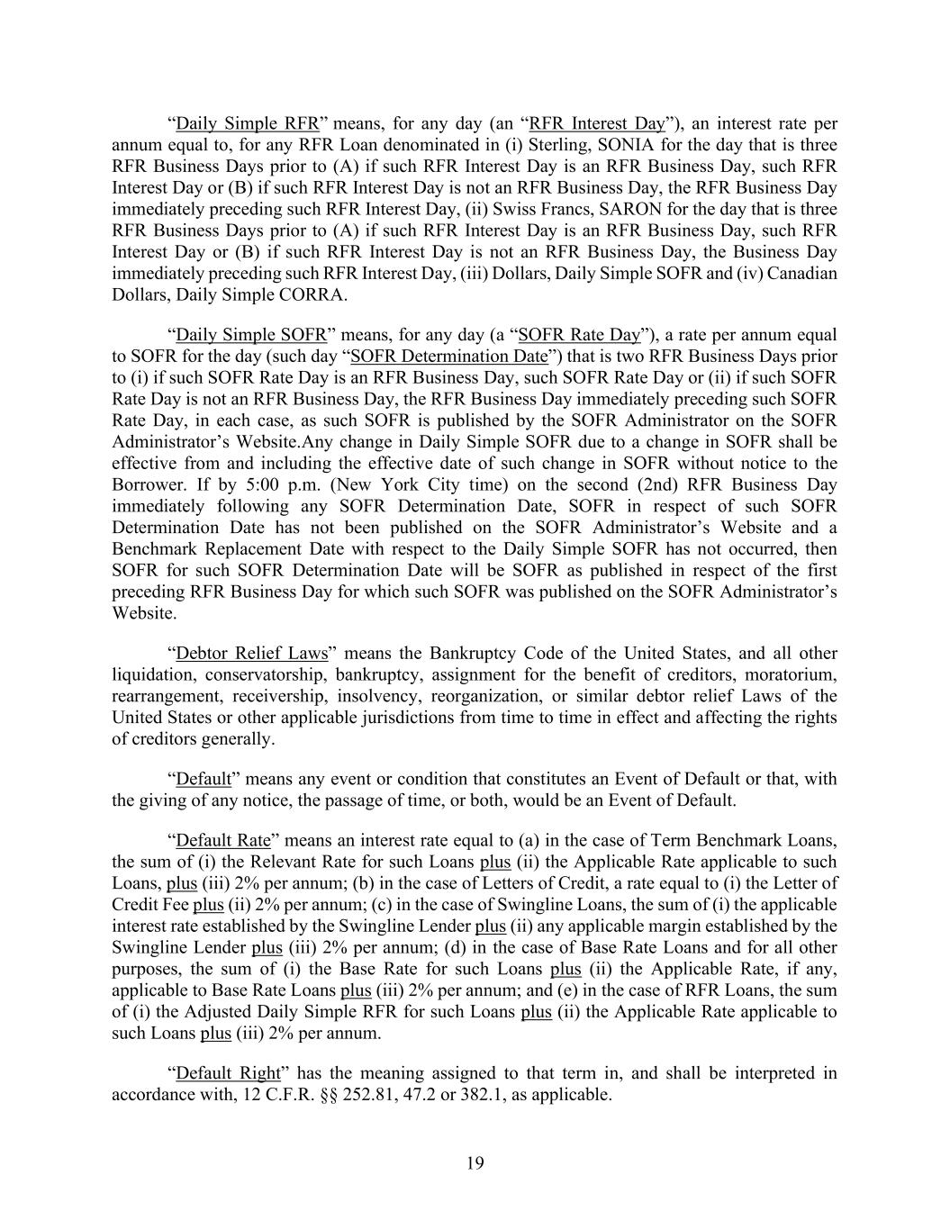 19 “Daily Simple RFR” means, for any day (an “RFR Interest Day”), an interest rate per annum equal to, for any RFR Loan denominated in (i) Sterling, SONIA for the day that is three RFR Business Days prior to (A) if such RFR Interest Day is an RFR Business Day, such RFR Interest Day or (B) if such RFR Interest Day is not an RFR Business Day, the RFR Business Day immediately preceding such RFR Interest Day, (ii) Swiss Francs, SARON for the day that is three RFR Business Days prior to (A) if such RFR Interest Day is an RFR Business Day, such RFR Interest Day or (B) if such RFR Interest Day is not an RFR Business Day, the Business Day immediately preceding such RFR Interest Day, (iii) Dollars, Daily Simple SOFR and (iv) Canadian Dollars, Daily Simple CORRA. “Daily Simple SOFR” means, for any day (a “SOFR Rate Day”), a rate per annum equal to SOFR for the day (such day “SOFR Determination Date”) that is two RFR Business Days prior to (i) if such SOFR Rate Day is an RFR Business Day, such SOFR Rate Day or (ii) if such SOFR Rate Day is not an RFR Business Day, the RFR Business Day immediately preceding such SOFR Rate Day, in each case, as such SOFR is published by the SOFR Administrator on the SOFR Administrator’s Website.Any change in Daily Simple SOFR due to a change in SOFR shall be effective from and including the effective date of such change in SOFR without notice to the Borrower. If by 5:00 p.m. (New York City time) on the second (2nd) RFR Business Day immediately following any SOFR Determination Date, SOFR in respect of such SOFR Determination Date has not been published on the SOFR Administrator’s Website and a Benchmark Replacement Date with respect to the Daily Simple SOFR has not occurred, then SOFR for such SOFR Determination Date will be SOFR as published in respect of the first preceding RFR Business Day for which such SOFR was published on the SOFR Administrator’s Website. “Debtor Relief Laws” means the Bankruptcy Code of the United States, and all other liquidation, conservatorship, bankruptcy, assignment for the benefit of creditors, moratorium, rearrangement, receivership, insolvency, reorganization, or similar debtor relief Laws of the United States or other applicable jurisdictions from time to time in effect and affecting the rights of creditors generally. “Default” means any event or condition that constitutes an Event of Default or that, with the giving of any notice, the passage of time, or both, would be an Event of Default. “Default Rate” means an interest rate equal to (a) in the case of Term Benchmark Loans, the sum of (i) the Relevant Rate for such Loans plus (ii) the Applicable Rate applicable to such Loans, plus (iii) 2% per annum; (b) in the case of Letters of Credit, a rate equal to (i) the Letter of Credit Fee plus (ii) 2% per annum; (c) in the case of Swingline Loans, the sum of (i) the applicable interest rate established by the Swingline Lender plus (ii) any applicable margin established by the Swingline Lender plus (iii) 2% per annum; (d) in the case of Base Rate Loans and for all other purposes, the sum of (i) the Base Rate for such Loans plus (ii) the Applicable Rate, if any, applicable to Base Rate Loans plus (iii) 2% per annum; and (e) in the case of RFR Loans, the sum of (i) the Adjusted Daily Simple RFR for such Loans plus (ii) the Applicable Rate applicable to such Loans plus (iii) 2% per annum. “Default Right” has the meaning assigned to that term in, and shall be interpreted in accordance with, 12 C.F.R. §§ 252.81, 47.2 or 382.1, as applicable.