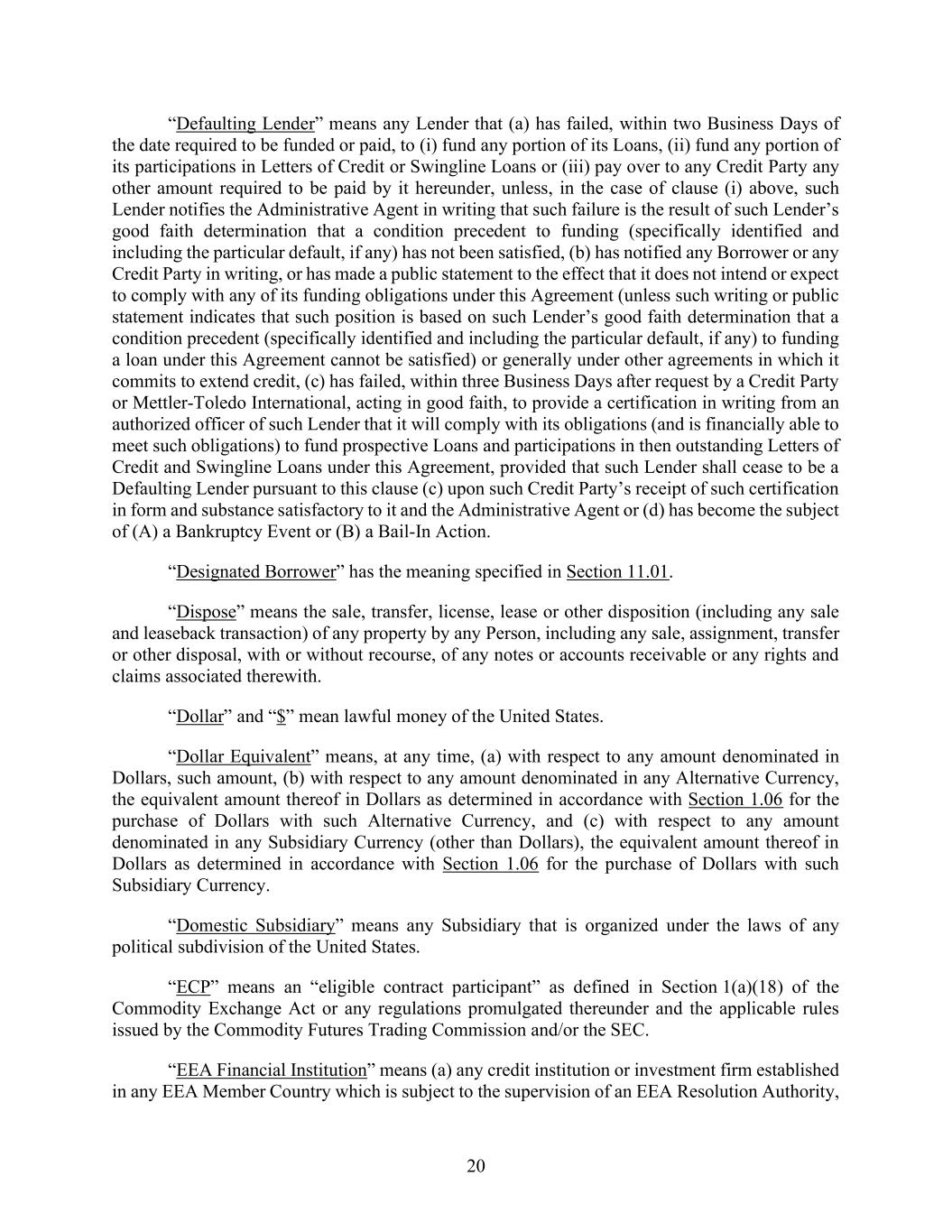 20 “Defaulting Lender” means any Lender that (a) has failed, within two Business Days of the date required to be funded or paid, to (i) fund any portion of its Loans, (ii) fund any portion of its participations in Letters of Credit or Swingline Loans or (iii) pay over to any Credit Party any other amount required to be paid by it hereunder, unless, in the case of clause (i) above, such Lender notifies the Administrative Agent in writing that such failure is the result of such Lender’s good faith determination that a condition precedent to funding (specifically identified and including the particular default, if any) has not been satisfied, (b) has notified any Borrower or any Credit Party in writing, or has made a public statement to the effect that it does not intend or expect to comply with any of its funding obligations under this Agreement (unless such writing or public statement indicates that such position is based on such Lender’s good faith determination that a condition precedent (specifically identified and including the particular default, if any) to funding a loan under this Agreement cannot be satisfied) or generally under other agreements in which it commits to extend credit, (c) has failed, within three Business Days after request by a Credit Party or Mettler-Toledo International, acting in good faith, to provide a certification in writing from an authorized officer of such Lender that it will comply with its obligations (and is financially able to meet such obligations) to fund prospective Loans and participations in then outstanding Letters of Credit and Swingline Loans under this Agreement, provided that such Lender shall cease to be a Defaulting Lender pursuant to this clause (c) upon such Credit Party’s receipt of such certification in form and substance satisfactory to it and the Administrative Agent or (d) has become the subject of (A) a Bankruptcy Event or (B) a Bail-In Action. “Designated Borrower” has the meaning specified in Section 11.01. “Dispose” means the sale, transfer, license, lease or other disposition (including any sale and leaseback transaction) of any property by any Person, including any sale, assignment, transfer or other disposal, with or without recourse, of any notes or accounts receivable or any rights and claims associated therewith. “Dollar” and “$” mean lawful money of the United States. “Dollar Equivalent” means, at any time, (a) with respect to any amount denominated in Dollars, such amount, (b) with respect to any amount denominated in any Alternative Currency, the equivalent amount thereof in Dollars as determined in accordance with Section 1.06 for the purchase of Dollars with such Alternative Currency, and (c) with respect to any amount denominated in any Subsidiary Currency (other than Dollars), the equivalent amount thereof in Dollars as determined in accordance with Section 1.06 for the purchase of Dollars with such Subsidiary Currency. “Domestic Subsidiary” means any Subsidiary that is organized under the laws of any political subdivision of the United States. “ECP” means an “eligible contract participant” as defined in Section 1(a)(18) of the Commodity Exchange Act or any regulations promulgated thereunder and the applicable rules issued by the Commodity Futures Trading Commission and/or the SEC. “EEA Financial Institution” means (a) any credit institution or investment firm established in any EEA Member Country which is subject to the supervision of an EEA Resolution Authority,