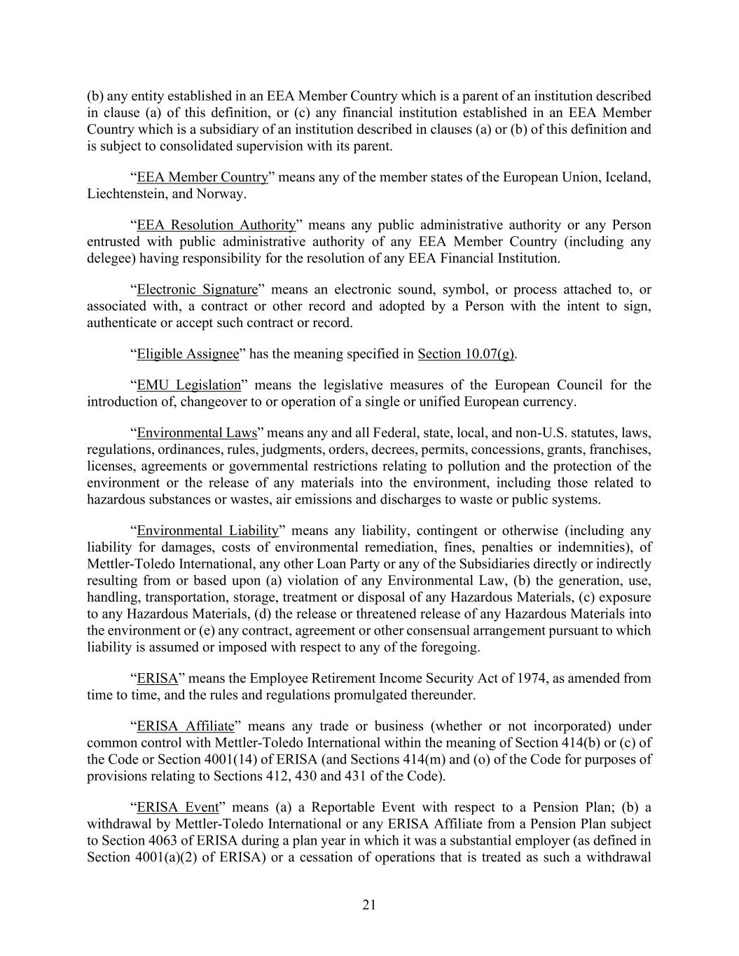 21 (b) any entity established in an EEA Member Country which is a parent of an institution described in clause (a) of this definition, or (c) any financial institution established in an EEA Member Country which is a subsidiary of an institution described in clauses (a) or (b) of this definition and is subject to consolidated supervision with its parent. “EEA Member Country” means any of the member states of the European Union, Iceland, Liechtenstein, and Norway. “EEA Resolution Authority” means any public administrative authority or any Person entrusted with public administrative authority of any EEA Member Country (including any delegee) having responsibility for the resolution of any EEA Financial Institution. “Electronic Signature” means an electronic sound, symbol, or process attached to, or associated with, a contract or other record and adopted by a Person with the intent to sign, authenticate or accept such contract or record. “Eligible Assignee” has the meaning specified in Section 10.07(g). “EMU Legislation” means the legislative measures of the European Council for the introduction of, changeover to or operation of a single or unified European currency. “Environmental Laws” means any and all Federal, state, local, and non-U.S. statutes, laws, regulations, ordinances, rules, judgments, orders, decrees, permits, concessions, grants, franchises, licenses, agreements or governmental restrictions relating to pollution and the protection of the environment or the release of any materials into the environment, including those related to hazardous substances or wastes, air emissions and discharges to waste or public systems. “Environmental Liability” means any liability, contingent or otherwise (including any liability for damages, costs of environmental remediation, fines, penalties or indemnities), of Mettler-Toledo International, any other Loan Party or any of the Subsidiaries directly or indirectly resulting from or based upon (a) violation of any Environmental Law, (b) the generation, use, handling, transportation, storage, treatment or disposal of any Hazardous Materials, (c) exposure to any Hazardous Materials, (d) the release or threatened release of any Hazardous Materials into the environment or (e) any contract, agreement or other consensual arrangement pursuant to which liability is assumed or imposed with respect to any of the foregoing. “ERISA” means the Employee Retirement Income Security Act of 1974, as amended from time to time, and the rules and regulations promulgated thereunder. “ERISA Affiliate” means any trade or business (whether or not incorporated) under common control with Mettler-Toledo International within the meaning of Section 414(b) or (c) of the Code or Section 4001(14) of ERISA (and Sections 414(m) and (o) of the Code for purposes of provisions relating to Sections 412, 430 and 431 of the Code). “ERISA Event” means (a) a Reportable Event with respect to a Pension Plan; (b) a withdrawal by Mettler-Toledo International or any ERISA Affiliate from a Pension Plan subject to Section 4063 of ERISA during a plan year in which it was a substantial employer (as defined in Section 4001(a)(2) of ERISA) or a cessation of operations that is treated as such a withdrawal