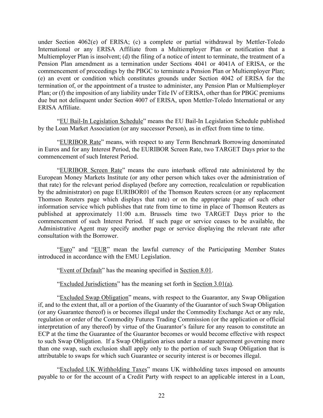 22 under Section 4062(e) of ERISA; (c) a complete or partial withdrawal by Mettler-Toledo International or any ERISA Affiliate from a Multiemployer Plan or notification that a Multiemployer Plan is insolvent; (d) the filing of a notice of intent to terminate, the treatment of a Pension Plan amendment as a termination under Sections 4041 or 4041A of ERISA, or the commencement of proceedings by the PBGC to terminate a Pension Plan or Multiemployer Plan; (e) an event or condition which constitutes grounds under Section 4042 of ERISA for the termination of, or the appointment of a trustee to administer, any Pension Plan or Multiemployer Plan; or (f) the imposition of any liability under Title IV of ERISA, other than for PBGC premiums due but not delinquent under Section 4007 of ERISA, upon Mettler-Toledo International or any ERISA Affiliate. “EU Bail-In Legislation Schedule” means the EU Bail-In Legislation Schedule published by the Loan Market Association (or any successor Person), as in effect from time to time. “EURIBOR Rate” means, with respect to any Term Benchmark Borrowing denominated in Euros and for any Interest Period, the EURIBOR Screen Rate, two TARGET Days prior to the commencement of such Interest Period. “EURIBOR Screen Rate” means the euro interbank offered rate administered by the European Money Markets Institute (or any other person which takes over the administration of that rate) for the relevant period displayed (before any correction, recalculation or republication by the administrator) on page EURIBOR01 of the Thomson Reuters screen (or any replacement Thomson Reuters page which displays that rate) or on the appropriate page of such other information service which publishes that rate from time to time in place of Thomson Reuters as published at approximately 11:00 a.m. Brussels time two TARGET Days prior to the commencement of such Interest Period. If such page or service ceases to be available, the Administrative Agent may specify another page or service displaying the relevant rate after consultation with the Borrower. “Euro” and “EUR” mean the lawful currency of the Participating Member States introduced in accordance with the EMU Legislation. “Event of Default” has the meaning specified in Section 8.01. “Excluded Jurisdictions” has the meaning set forth in Section 3.01(a). “Excluded Swap Obligation” means, with respect to the Guarantor, any Swap Obligation if, and to the extent that, all or a portion of the Guaranty of the Guarantor of such Swap Obligation (or any Guarantee thereof) is or becomes illegal under the Commodity Exchange Act or any rule, regulation or order of the Commodity Futures Trading Commission (or the application or official interpretation of any thereof) by virtue of the Guarantor’s failure for any reason to constitute an ECP at the time the Guarantee of the Guarantor becomes or would become effective with respect to such Swap Obligation. If a Swap Obligation arises under a master agreement governing more than one swap, such exclusion shall apply only to the portion of such Swap Obligation that is attributable to swaps for which such Guarantee or security interest is or becomes illegal. “Excluded UK Withholding Taxes” means UK withholding taxes imposed on amounts payable to or for the account of a Credit Party with respect to an applicable interest in a Loan,