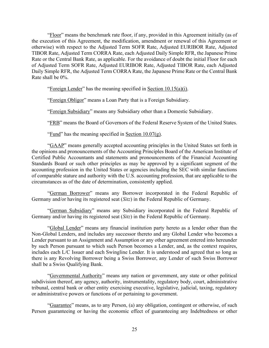 25 “Floor” means the benchmark rate floor, if any, provided in this Agreement initially (as of the execution of this Agreement, the modification, amendment or renewal of this Agreement or otherwise) with respect to the Adjusted Term SOFR Rate, Adjusted EURIBOR Rate, Adjusted TIBOR Rate, Adjusted Term CORRA Rate, each Adjusted Daily Simple RFR, the Japanese Prime Rate or the Central Bank Rate, as applicable. For the avoidance of doubt the initial Floor for each of Adjusted Term SOFR Rate, Adjusted EURIBOR Rate, Adjusted TIBOR Rate, each Adjusted Daily Simple RFR, the Adjusted Term CORRA Rate, the Japanese Prime Rate or the Central Bank Rate shall be 0%. “Foreign Lender” has the meaning specified in Section 10.15(a)(i). “Foreign Obligor” means a Loan Party that is a Foreign Subsidiary. “Foreign Subsidiary” means any Subsidiary other than a Domestic Subsidiary. “FRB” means the Board of Governors of the Federal Reserve System of the United States. “Fund” has the meaning specified in Section 10.07(g). “GAAP” means generally accepted accounting principles in the United States set forth in the opinions and pronouncements of the Accounting Principles Board of the American Institute of Certified Public Accountants and statements and pronouncements of the Financial Accounting Standards Board or such other principles as may be approved by a significant segment of the accounting profession in the United States or agencies including the SEC with similar functions of comparable stature and authority with the U.S. accounting profession, that are applicable to the circumstances as of the date of determination, consistently applied. “German Borrower” means any Borrower incorporated in the Federal Republic of Germany and/or having its registered seat (Sitz) in the Federal Republic of Germany. “German Subsidiary” means any Subsidiary incorporated in the Federal Republic of Germany and/or having its registered seat (Sitz) in the Federal Republic of Germany. “Global Lender” means any financial institution party hereto as a lender other than the Non-Global Lenders, and includes any successor thereto and any Global Lender who becomes a Lender pursuant to an Assignment and Assumption or any other agreement entered into hereunder by such Person pursuant to which such Person becomes a Lender, and, as the context requires, includes each L/C Issuer and each Swingline Lender. It is understood and agreed that so long as there is any Revolving Borrower being a Swiss Borrower, any Lender of such Swiss Borrower shall be a Swiss Qualifying Bank. “Governmental Authority” means any nation or government, any state or other political subdivision thereof, any agency, authority, instrumentality, regulatory body, court, administrative tribunal, central bank or other entity exercising executive, legislative, judicial, taxing, regulatory or administrative powers or functions of or pertaining to government. “Guarantee” means, as to any Person, (a) any obligation, contingent or otherwise, of such Person guaranteeing or having the economic effect of guaranteeing any Indebtedness or other