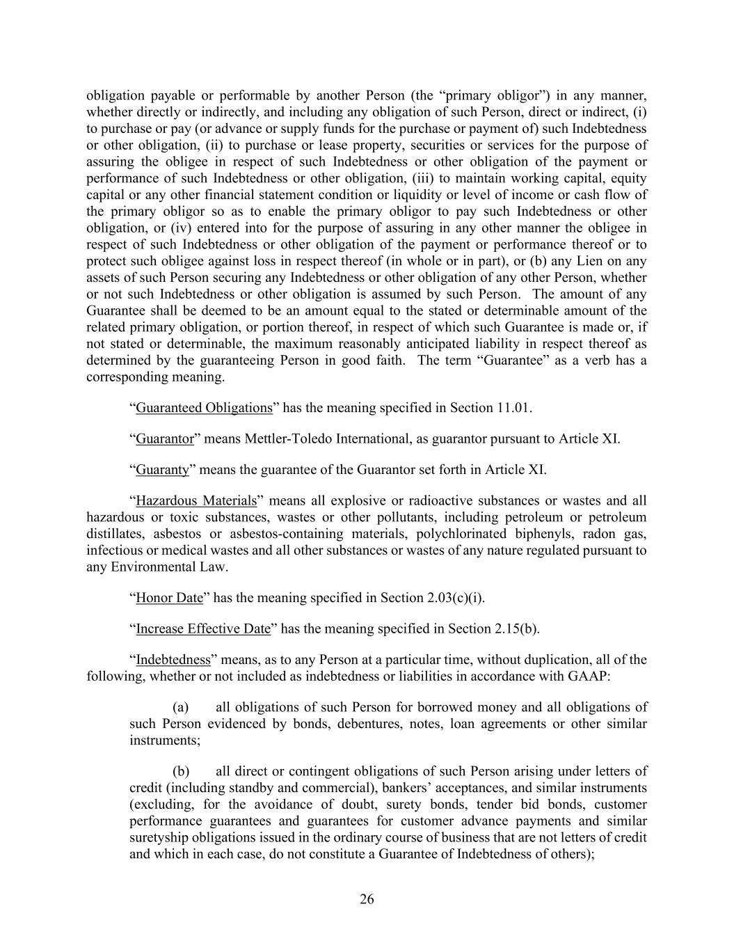 26 obligation payable or performable by another Person (the “primary obligor”) in any manner, whether directly or indirectly, and including any obligation of such Person, direct or indirect, (i) to purchase or pay (or advance or supply funds for the purchase or payment of) such Indebtedness or other obligation, (ii) to purchase or lease property, securities or services for the purpose of assuring the obligee in respect of such Indebtedness or other obligation of the payment or performance of such Indebtedness or other obligation, (iii) to maintain working capital, equity capital or any other financial statement condition or liquidity or level of income or cash flow of the primary obligor so as to enable the primary obligor to pay such Indebtedness or other obligation, or (iv) entered into for the purpose of assuring in any other manner the obligee in respect of such Indebtedness or other obligation of the payment or performance thereof or to protect such obligee against loss in respect thereof (in whole or in part), or (b) any Lien on any assets of such Person securing any Indebtedness or other obligation of any other Person, whether or not such Indebtedness or other obligation is assumed by such Person. The amount of any Guarantee shall be deemed to be an amount equal to the stated or determinable amount of the related primary obligation, or portion thereof, in respect of which such Guarantee is made or, if not stated or determinable, the maximum reasonably anticipated liability in respect thereof as determined by the guaranteeing Person in good faith. The term “Guarantee” as a verb has a corresponding meaning. “Guaranteed Obligations” has the meaning specified in Section 11.01. “Guarantor” means Mettler-Toledo International, as guarantor pursuant to Article XI. “Guaranty” means the guarantee of the Guarantor set forth in Article XI. “Hazardous Materials” means all explosive or radioactive substances or wastes and all hazardous or toxic substances, wastes or other pollutants, including petroleum or petroleum distillates, asbestos or asbestos-containing materials, polychlorinated biphenyls, radon gas, infectious or medical wastes and all other substances or wastes of any nature regulated pursuant to any Environmental Law. “Honor Date” has the meaning specified in Section 2.03(c)(i). “Increase Effective Date” has the meaning specified in Section 2.15(b). “Indebtedness” means, as to any Person at a particular time, without duplication, all of the following, whether or not included as indebtedness or liabilities in accordance with GAAP: (a) all obligations of such Person for borrowed money and all obligations of such Person evidenced by bonds, debentures, notes, loan agreements or other similar instruments; (b) all direct or contingent obligations of such Person arising under letters of credit (including standby and commercial), bankers’ acceptances, and similar instruments (excluding, for the avoidance of doubt, surety bonds, tender bid bonds, customer performance guarantees and guarantees for customer advance payments and similar suretyship obligations issued in the ordinary course of business that are not letters of credit and which in each case, do not constitute a Guarantee of Indebtedness of others);