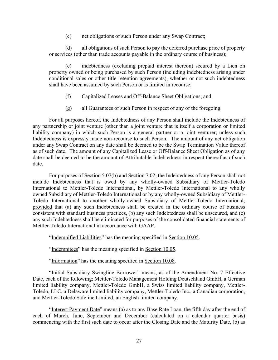 27 (c) net obligations of such Person under any Swap Contract; (d) all obligations of such Person to pay the deferred purchase price of property or services (other than trade accounts payable in the ordinary course of business); (e) indebtedness (excluding prepaid interest thereon) secured by a Lien on property owned or being purchased by such Person (including indebtedness arising under conditional sales or other title retention agreements), whether or not such indebtedness shall have been assumed by such Person or is limited in recourse; (f) Capitalized Leases and Off-Balance Sheet Obligations; and (g) all Guarantees of such Person in respect of any of the foregoing. For all purposes hereof, the Indebtedness of any Person shall include the Indebtedness of any partnership or joint venture (other than a joint venture that is itself a corporation or limited liability company) in which such Person is a general partner or a joint venturer, unless such Indebtedness is expressly made non-recourse to such Person. The amount of any net obligation under any Swap Contract on any date shall be deemed to be the Swap Termination Value thereof as of such date. The amount of any Capitalized Lease or Off-Balance Sheet Obligation as of any date shall be deemed to be the amount of Attributable Indebtedness in respect thereof as of such date. For purposes of Section 5.07(b) and Section 7.02, the Indebtedness of any Person shall not include Indebtedness that is owed by any wholly-owned Subsidiary of Mettler-Toledo International to Mettler-Toledo International, by Mettler-Toledo International to any wholly owned Subsidiary of Mettler-Toledo International or by any wholly-owned Subsidiary of Mettler- Toledo International to another wholly-owned Subsidiary of Mettler-Toledo International; provided that (a) any such Indebtedness shall be created in the ordinary course of business consistent with standard business practices, (b) any such Indebtedness shall be unsecured, and (c) any such Indebtedness shall be eliminated for purposes of the consolidated financial statements of Mettler-Toledo International in accordance with GAAP. “Indemnified Liabilities” has the meaning specified in Section 10.05. “Indemnitees” has the meaning specified in Section 10.05. “Information” has the meaning specified in Section 10.08. “Initial Subsidiary Swingline Borrower” means, as of the Amendment No. 7 Effective Date, each of the following: Mettler-Toledo Management Holding Deutschland GmbH, a German limited liability company, Mettler-Toledo GmbH, a Swiss limited liability company, Mettler- Toledo, LLC, a Delaware limited liability company, Mettler-Toledo Inc., a Canadian corporation, and Mettler-Toledo Safeline Limited, an English limited company. “Interest Payment Date” means (a) as to any Base Rate Loan, the fifth day after the end of each of March, June, September and December (calculated on a calendar quarter basis) commencing with the first such date to occur after the Closing Date and the Maturity Date, (b) as