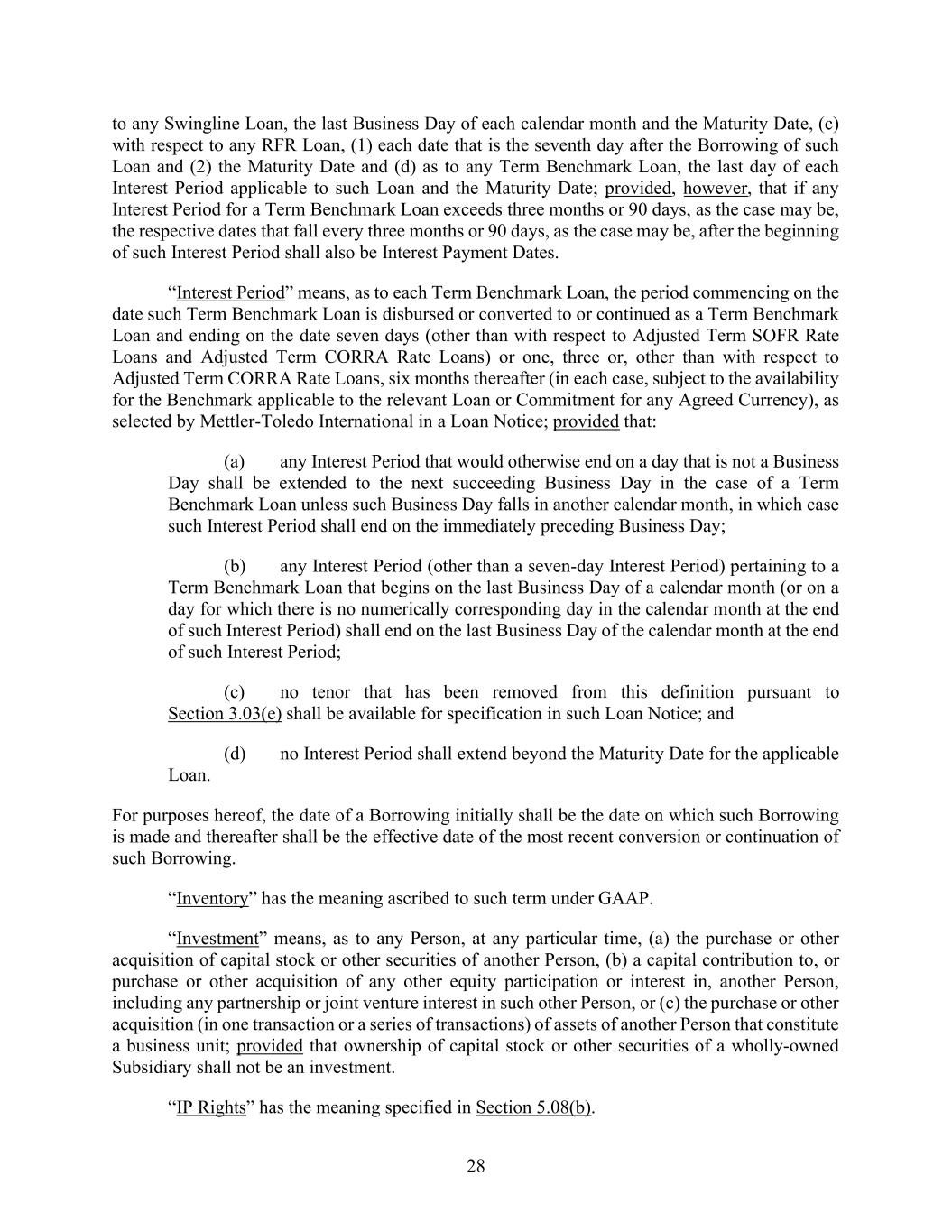 28 to any Swingline Loan, the last Business Day of each calendar month and the Maturity Date, (c) with respect to any RFR Loan, (1) each date that is the seventh day after the Borrowing of such Loan and (2) the Maturity Date and (d) as to any Term Benchmark Loan, the last day of each Interest Period applicable to such Loan and the Maturity Date; provided, however, that if any Interest Period for a Term Benchmark Loan exceeds three months or 90 days, as the case may be, the respective dates that fall every three months or 90 days, as the case may be, after the beginning of such Interest Period shall also be Interest Payment Dates. “Interest Period” means, as to each Term Benchmark Loan, the period commencing on the date such Term Benchmark Loan is disbursed or converted to or continued as a Term Benchmark Loan and ending on the date seven days (other than with respect to Adjusted Term SOFR Rate Loans and Adjusted Term CORRA Rate Loans) or one, three or, other than with respect to Adjusted Term CORRA Rate Loans, six months thereafter (in each case, subject to the availability for the Benchmark applicable to the relevant Loan or Commitment for any Agreed Currency), as selected by Mettler-Toledo International in a Loan Notice; provided that: (a) any Interest Period that would otherwise end on a day that is not a Business Day shall be extended to the next succeeding Business Day in the case of a Term Benchmark Loan unless such Business Day falls in another calendar month, in which case such Interest Period shall end on the immediately preceding Business Day; (b) any Interest Period (other than a seven-day Interest Period) pertaining to a Term Benchmark Loan that begins on the last Business Day of a calendar month (or on a day for which there is no numerically corresponding day in the calendar month at the end of such Interest Period) shall end on the last Business Day of the calendar month at the end of such Interest Period; (c) no tenor that has been removed from this definition pursuant to Section 3.03(e) shall be available for specification in such Loan Notice; and (d) no Interest Period shall extend beyond the Maturity Date for the applicable Loan. For purposes hereof, the date of a Borrowing initially shall be the date on which such Borrowing is made and thereafter shall be the effective date of the most recent conversion or continuation of such Borrowing. “Inventory” has the meaning ascribed to such term under GAAP. “Investment” means, as to any Person, at any particular time, (a) the purchase or other acquisition of capital stock or other securities of another Person, (b) a capital contribution to, or purchase or other acquisition of any other equity participation or interest in, another Person, including any partnership or joint venture interest in such other Person, or (c) the purchase or other acquisition (in one transaction or a series of transactions) of assets of another Person that constitute a business unit; provided that ownership of capital stock or other securities of a wholly-owned Subsidiary shall not be an investment. “IP Rights” has the meaning specified in Section 5.08(b).