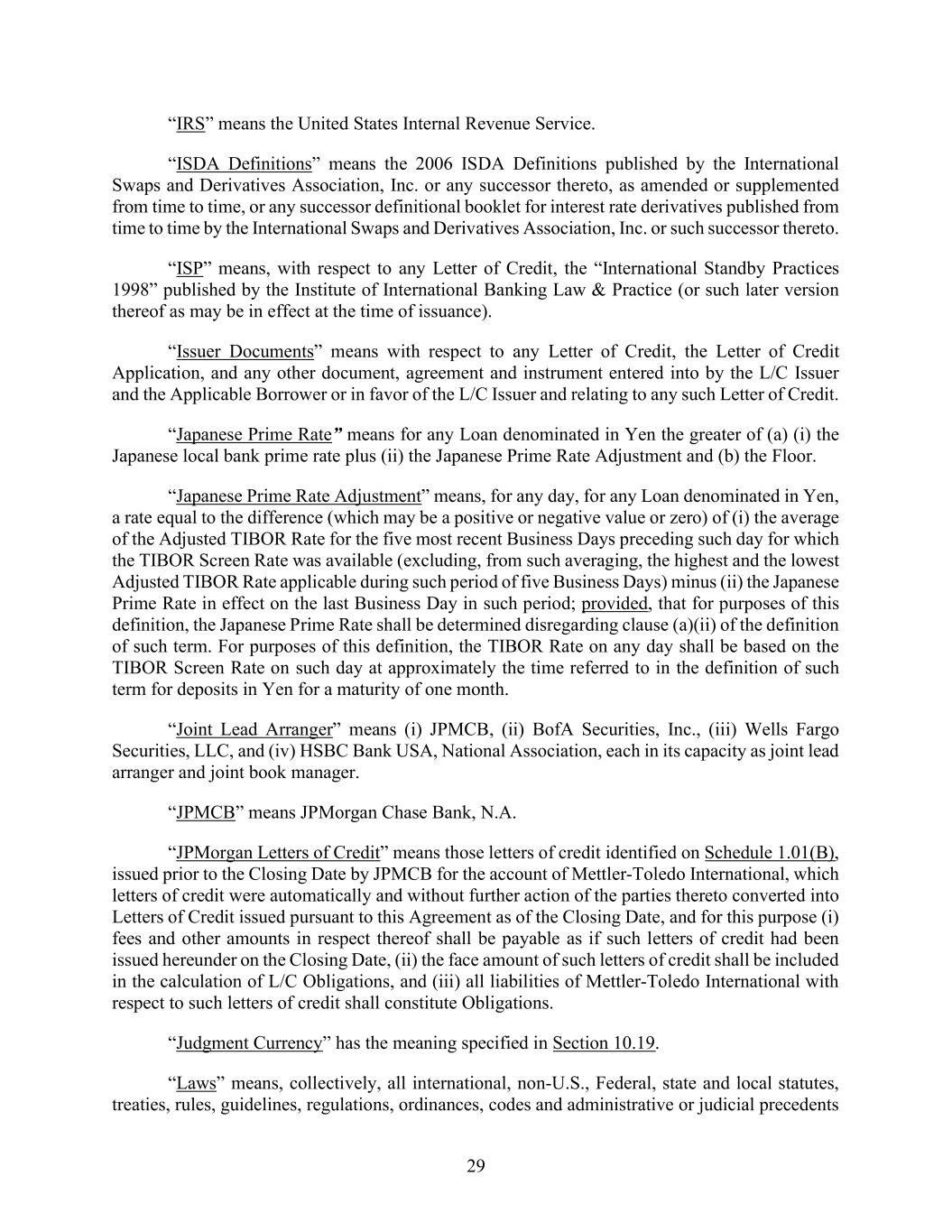 29 “IRS” means the United States Internal Revenue Service. “ISDA Definitions” means the 2006 ISDA Definitions published by the International Swaps and Derivatives Association, Inc. or any successor thereto, as amended or supplemented from time to time, or any successor definitional booklet for interest rate derivatives published from time to time by the International Swaps and Derivatives Association, Inc. or such successor thereto. “ISP” means, with respect to any Letter of Credit, the “International Standby Practices 1998” published by the Institute of International Banking Law & Practice (or such later version thereof as may be in effect at the time of issuance). “Issuer Documents” means with respect to any Letter of Credit, the Letter of Credit Application, and any other document, agreement and instrument entered into by the L/C Issuer and the Applicable Borrower or in favor of the L/C Issuer and relating to any such Letter of Credit. “Japanese Prime Rate” means for any Loan denominated in Yen the greater of (a) (i) the Japanese local bank prime rate plus (ii) the Japanese Prime Rate Adjustment and (b) the Floor. “Japanese Prime Rate Adjustment” means, for any day, for any Loan denominated in Yen, a rate equal to the difference (which may be a positive or negative value or zero) of (i) the average of the Adjusted TIBOR Rate for the five most recent Business Days preceding such day for which the TIBOR Screen Rate was available (excluding, from such averaging, the highest and the lowest Adjusted TIBOR Rate applicable during such period of five Business Days) minus (ii) the Japanese Prime Rate in effect on the last Business Day in such period; provided, that for purposes of this definition, the Japanese Prime Rate shall be determined disregarding clause (a)(ii) of the definition of such term. For purposes of this definition, the TIBOR Rate on any day shall be based on the TIBOR Screen Rate on such day at approximately the time referred to in the definition of such term for deposits in Yen for a maturity of one month. “Joint Lead Arranger” means (i) JPMCB, (ii) BofA Securities, Inc., (iii) Wells Fargo Securities, LLC, and (iv) HSBC Bank USA, National Association, each in its capacity as joint lead arranger and joint book manager. “JPMCB” means JPMorgan Chase Bank, N.A. “JPMorgan Letters of Credit” means those letters of credit identified on Schedule 1.01(B), issued prior to the Closing Date by JPMCB for the account of Mettler-Toledo International, which letters of credit were automatically and without further action of the parties thereto converted into Letters of Credit issued pursuant to this Agreement as of the Closing Date, and for this purpose (i) fees and other amounts in respect thereof shall be payable as if such letters of credit had been issued hereunder on the Closing Date, (ii) the face amount of such letters of credit shall be included in the calculation of L/C Obligations, and (iii) all liabilities of Mettler-Toledo International with respect to such letters of credit shall constitute Obligations. “Judgment Currency” has the meaning specified in Section 10.19. “Laws” means, collectively, all international, non-U.S., Federal, state and local statutes, treaties, rules, guidelines, regulations, ordinances, codes and administrative or judicial precedents