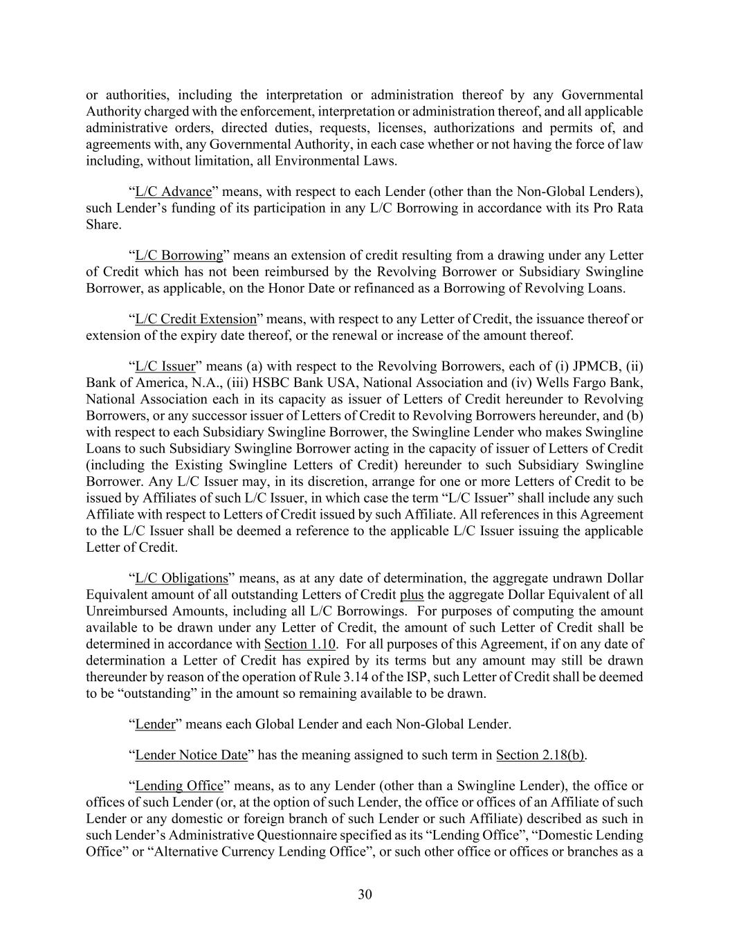 30 or authorities, including the interpretation or administration thereof by any Governmental Authority charged with the enforcement, interpretation or administration thereof, and all applicable administrative orders, directed duties, requests, licenses, authorizations and permits of, and agreements with, any Governmental Authority, in each case whether or not having the force of law including, without limitation, all Environmental Laws. “L/C Advance” means, with respect to each Lender (other than the Non-Global Lenders), such Lender’s funding of its participation in any L/C Borrowing in accordance with its Pro Rata Share. “L/C Borrowing” means an extension of credit resulting from a drawing under any Letter of Credit which has not been reimbursed by the Revolving Borrower or Subsidiary Swingline Borrower, as applicable, on the Honor Date or refinanced as a Borrowing of Revolving Loans. “L/C Credit Extension” means, with respect to any Letter of Credit, the issuance thereof or extension of the expiry date thereof, or the renewal or increase of the amount thereof. “L/C Issuer” means (a) with respect to the Revolving Borrowers, each of (i) JPMCB, (ii) Bank of America, N.A., (iii) HSBC Bank USA, National Association and (iv) Wells Fargo Bank, National Association each in its capacity as issuer of Letters of Credit hereunder to Revolving Borrowers, or any successor issuer of Letters of Credit to Revolving Borrowers hereunder, and (b) with respect to each Subsidiary Swingline Borrower, the Swingline Lender who makes Swingline Loans to such Subsidiary Swingline Borrower acting in the capacity of issuer of Letters of Credit (including the Existing Swingline Letters of Credit) hereunder to such Subsidiary Swingline Borrower. Any L/C Issuer may, in its discretion, arrange for one or more Letters of Credit to be issued by Affiliates of such L/C Issuer, in which case the term “L/C Issuer” shall include any such Affiliate with respect to Letters of Credit issued by such Affiliate. All references in this Agreement to the L/C Issuer shall be deemed a reference to the applicable L/C Issuer issuing the applicable Letter of Credit. “L/C Obligations” means, as at any date of determination, the aggregate undrawn Dollar Equivalent amount of all outstanding Letters of Credit plus the aggregate Dollar Equivalent of all Unreimbursed Amounts, including all L/C Borrowings. For purposes of computing the amount available to be drawn under any Letter of Credit, the amount of such Letter of Credit shall be determined in accordance with Section 1.10. For all purposes of this Agreement, if on any date of determination a Letter of Credit has expired by its terms but any amount may still be drawn thereunder by reason of the operation of Rule 3.14 of the ISP, such Letter of Credit shall be deemed to be “outstanding” in the amount so remaining available to be drawn. “Lender” means each Global Lender and each Non-Global Lender. “Lender Notice Date” has the meaning assigned to such term in Section 2.18(b). “Lending Office” means, as to any Lender (other than a Swingline Lender), the office or offices of such Lender (or, at the option of such Lender, the office or offices of an Affiliate of such Lender or any domestic or foreign branch of such Lender or such Affiliate) described as such in such Lender’s Administrative Questionnaire specified as its “Lending Office”, “Domestic Lending Office” or “Alternative Currency Lending Office”, or such other office or offices or branches as a
