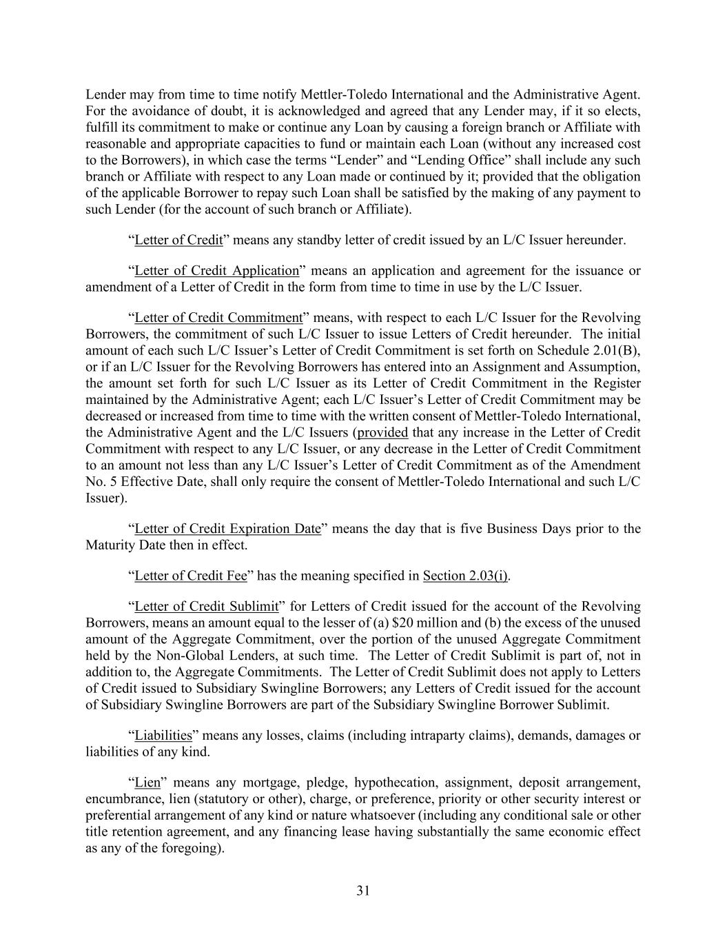 31 Lender may from time to time notify Mettler-Toledo International and the Administrative Agent. For the avoidance of doubt, it is acknowledged and agreed that any Lender may, if it so elects, fulfill its commitment to make or continue any Loan by causing a foreign branch or Affiliate with reasonable and appropriate capacities to fund or maintain each Loan (without any increased cost to the Borrowers), in which case the terms “Lender” and “Lending Office” shall include any such branch or Affiliate with respect to any Loan made or continued by it; provided that the obligation of the applicable Borrower to repay such Loan shall be satisfied by the making of any payment to such Lender (for the account of such branch or Affiliate). “Letter of Credit” means any standby letter of credit issued by an L/C Issuer hereunder. “Letter of Credit Application” means an application and agreement for the issuance or amendment of a Letter of Credit in the form from time to time in use by the L/C Issuer. “Letter of Credit Commitment” means, with respect to each L/C Issuer for the Revolving Borrowers, the commitment of such L/C Issuer to issue Letters of Credit hereunder. The initial amount of each such L/C Issuer’s Letter of Credit Commitment is set forth on Schedule 2.01(B), or if an L/C Issuer for the Revolving Borrowers has entered into an Assignment and Assumption, the amount set forth for such L/C Issuer as its Letter of Credit Commitment in the Register maintained by the Administrative Agent; each L/C Issuer’s Letter of Credit Commitment may be decreased or increased from time to time with the written consent of Mettler-Toledo International, the Administrative Agent and the L/C Issuers (provided that any increase in the Letter of Credit Commitment with respect to any L/C Issuer, or any decrease in the Letter of Credit Commitment to an amount not less than any L/C Issuer’s Letter of Credit Commitment as of the Amendment No. 5 Effective Date, shall only require the consent of Mettler-Toledo International and such L/C Issuer). “Letter of Credit Expiration Date” means the day that is five Business Days prior to the Maturity Date then in effect. “Letter of Credit Fee” has the meaning specified in Section 2.03(i). “Letter of Credit Sublimit” for Letters of Credit issued for the account of the Revolving Borrowers, means an amount equal to the lesser of (a) $20 million and (b) the excess of the unused amount of the Aggregate Commitment, over the portion of the unused Aggregate Commitment held by the Non-Global Lenders, at such time. The Letter of Credit Sublimit is part of, not in addition to, the Aggregate Commitments. The Letter of Credit Sublimit does not apply to Letters of Credit issued to Subsidiary Swingline Borrowers; any Letters of Credit issued for the account of Subsidiary Swingline Borrowers are part of the Subsidiary Swingline Borrower Sublimit. “Liabilities” means any losses, claims (including intraparty claims), demands, damages or liabilities of any kind. “Lien” means any mortgage, pledge, hypothecation, assignment, deposit arrangement, encumbrance, lien (statutory or other), charge, or preference, priority or other security interest or preferential arrangement of any kind or nature whatsoever (including any conditional sale or other title retention agreement, and any financing lease having substantially the same economic effect as any of the foregoing).