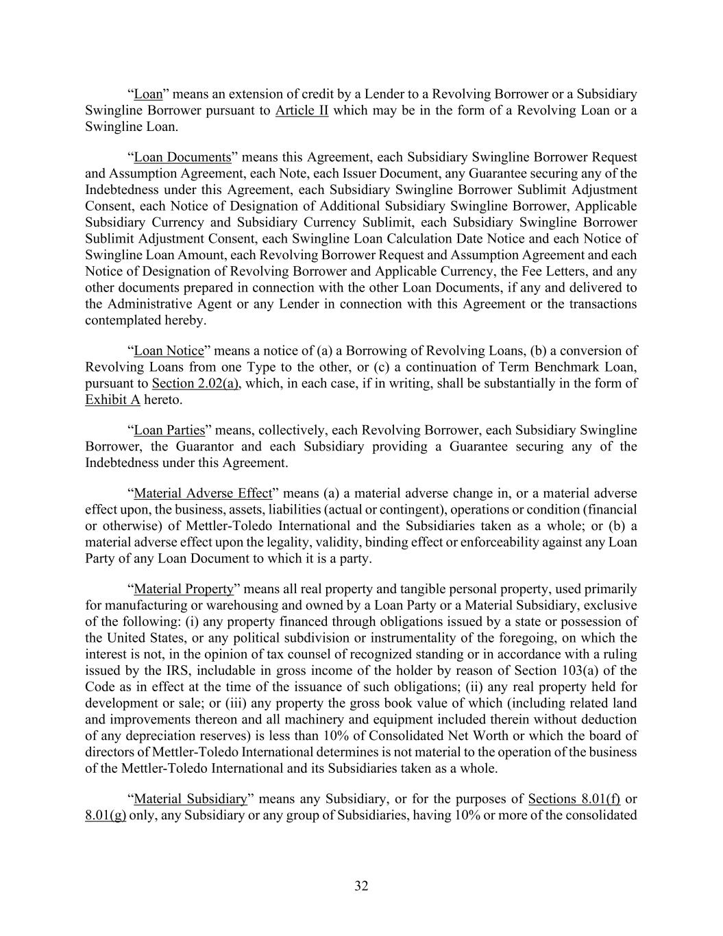 32 “Loan” means an extension of credit by a Lender to a Revolving Borrower or a Subsidiary Swingline Borrower pursuant to Article II which may be in the form of a Revolving Loan or a Swingline Loan. “Loan Documents” means this Agreement, each Subsidiary Swingline Borrower Request and Assumption Agreement, each Note, each Issuer Document, any Guarantee securing any of the Indebtedness under this Agreement, each Subsidiary Swingline Borrower Sublimit Adjustment Consent, each Notice of Designation of Additional Subsidiary Swingline Borrower, Applicable Subsidiary Currency and Subsidiary Currency Sublimit, each Subsidiary Swingline Borrower Sublimit Adjustment Consent, each Swingline Loan Calculation Date Notice and each Notice of Swingline Loan Amount, each Revolving Borrower Request and Assumption Agreement and each Notice of Designation of Revolving Borrower and Applicable Currency, the Fee Letters, and any other documents prepared in connection with the other Loan Documents, if any and delivered to the Administrative Agent or any Lender in connection with this Agreement or the transactions contemplated hereby. “Loan Notice” means a notice of (a) a Borrowing of Revolving Loans, (b) a conversion of Revolving Loans from one Type to the other, or (c) a continuation of Term Benchmark Loan, pursuant to Section 2.02(a), which, in each case, if in writing, shall be substantially in the form of Exhibit A hereto. “Loan Parties” means, collectively, each Revolving Borrower, each Subsidiary Swingline Borrower, the Guarantor and each Subsidiary providing a Guarantee securing any of the Indebtedness under this Agreement. “Material Adverse Effect” means (a) a material adverse change in, or a material adverse effect upon, the business, assets, liabilities (actual or contingent), operations or condition (financial or otherwise) of Mettler-Toledo International and the Subsidiaries taken as a whole; or (b) a material adverse effect upon the legality, validity, binding effect or enforceability against any Loan Party of any Loan Document to which it is a party. “Material Property” means all real property and tangible personal property, used primarily for manufacturing or warehousing and owned by a Loan Party or a Material Subsidiary, exclusive of the following: (i) any property financed through obligations issued by a state or possession of the United States, or any political subdivision or instrumentality of the foregoing, on which the interest is not, in the opinion of tax counsel of recognized standing or in accordance with a ruling issued by the IRS, includable in gross income of the holder by reason of Section 103(a) of the Code as in effect at the time of the issuance of such obligations; (ii) any real property held for development or sale; or (iii) any property the gross book value of which (including related land and improvements thereon and all machinery and equipment included therein without deduction of any depreciation reserves) is less than 10% of Consolidated Net Worth or which the board of directors of Mettler-Toledo International determines is not material to the operation of the business of the Mettler-Toledo International and its Subsidiaries taken as a whole. “Material Subsidiary” means any Subsidiary, or for the purposes of Sections 8.01(f) or 8.01(g) only, any Subsidiary or any group of Subsidiaries, having 10% or more of the consolidated