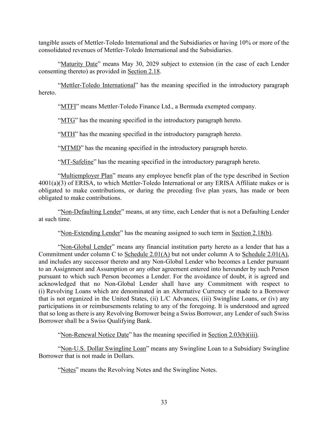 33 tangible assets of Mettler-Toledo International and the Subsidiaries or having 10% or more of the consolidated revenues of Mettler-Toledo International and the Subsidiaries. “Maturity Date” means May 30, 2029 subject to extension (in the case of each Lender consenting thereto) as provided in Section 2.18. “Mettler-Toledo International” has the meaning specified in the introductory paragraph hereto. “MTFI” means Mettler-Toledo Finance Ltd., a Bermuda exempted company. “MTG” has the meaning specified in the introductory paragraph hereto. “MTH” has the meaning specified in the introductory paragraph hereto. “MTMD” has the meaning specified in the introductory paragraph hereto. “MT-Safeline” has the meaning specified in the introductory paragraph hereto. “Multiemployer Plan” means any employee benefit plan of the type described in Section 4001(a)(3) of ERISA, to which Mettler-Toledo International or any ERISA Affiliate makes or is obligated to make contributions, or during the preceding five plan years, has made or been obligated to make contributions. “Non-Defaulting Lender” means, at any time, each Lender that is not a Defaulting Lender at such time. “Non-Extending Lender” has the meaning assigned to such term in Section 2.18(b). “Non-Global Lender” means any financial institution party hereto as a lender that has a Commitment under column C to Schedule 2.01(A) but not under column A to Schedule 2.01(A), and includes any successor thereto and any Non-Global Lender who becomes a Lender pursuant to an Assignment and Assumption or any other agreement entered into hereunder by such Person pursuant to which such Person becomes a Lender. For the avoidance of doubt, it is agreed and acknowledged that no Non-Global Lender shall have any Commitment with respect to (i) Revolving Loans which are denominated in an Alternative Currency or made to a Borrower that is not organized in the United States, (ii) L/C Advances, (iii) Swingline Loans, or (iv) any participations in or reimbursements relating to any of the foregoing. It is understood and agreed that so long as there is any Revolving Borrower being a Swiss Borrower, any Lender of such Swiss Borrower shall be a Swiss Qualifying Bank. “Non-Renewal Notice Date” has the meaning specified in Section 2.03(b)(iii). “Non-U.S. Dollar Swingline Loan” means any Swingline Loan to a Subsidiary Swingline Borrower that is not made in Dollars. “Notes” means the Revolving Notes and the Swingline Notes.