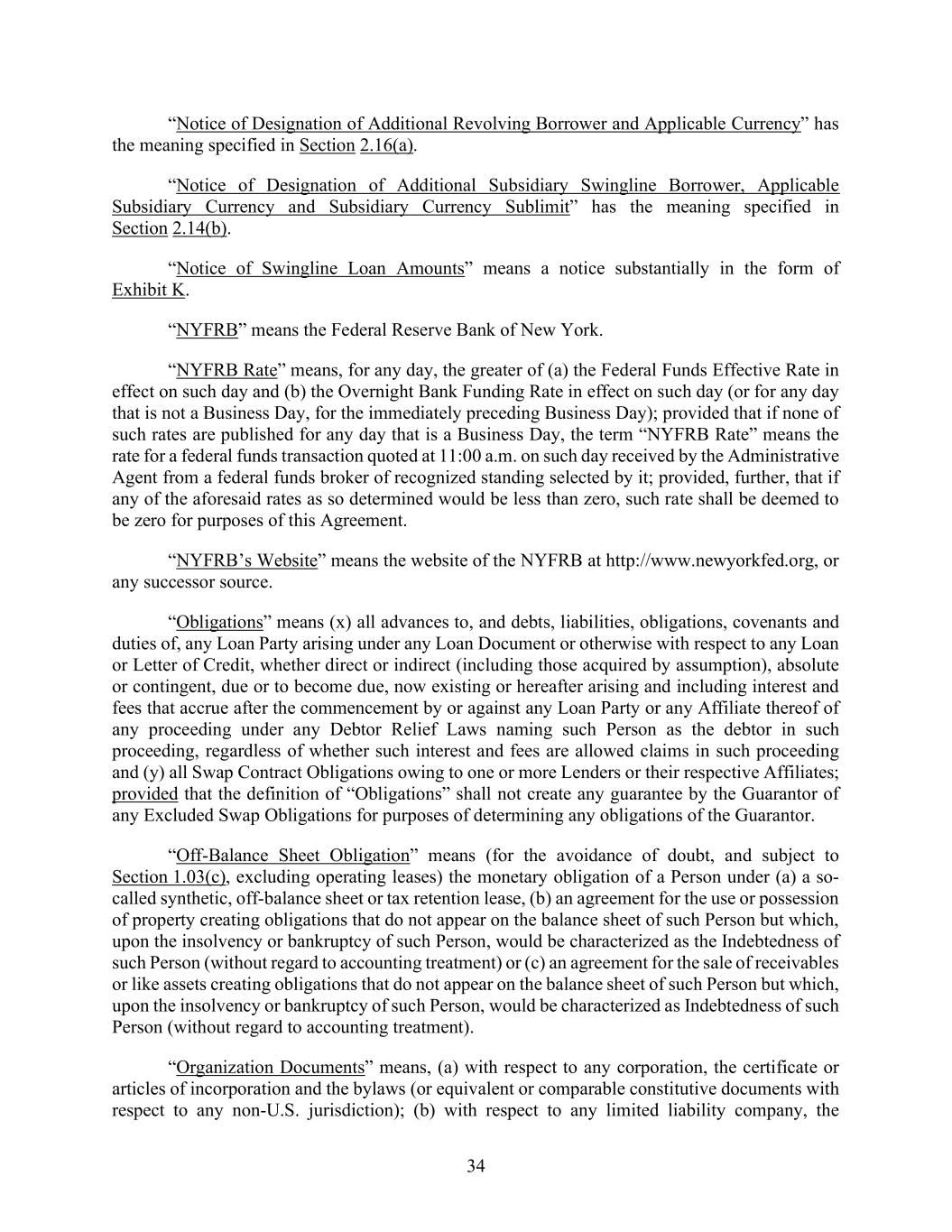 34 “Notice of Designation of Additional Revolving Borrower and Applicable Currency” has the meaning specified in Section 2.16(a). “Notice of Designation of Additional Subsidiary Swingline Borrower, Applicable Subsidiary Currency and Subsidiary Currency Sublimit” has the meaning specified in Section 2.14(b). “Notice of Swingline Loan Amounts” means a notice substantially in the form of Exhibit K. “NYFRB” means the Federal Reserve Bank of New York. “NYFRB Rate” means, for any day, the greater of (a) the Federal Funds Effective Rate in effect on such day and (b) the Overnight Bank Funding Rate in effect on such day (or for any day that is not a Business Day, for the immediately preceding Business Day); provided that if none of such rates are published for any day that is a Business Day, the term “NYFRB Rate” means the rate for a federal funds transaction quoted at 11:00 a.m. on such day received by the Administrative Agent from a federal funds broker of recognized standing selected by it; provided, further, that if any of the aforesaid rates as so determined would be less than zero, such rate shall be deemed to be zero for purposes of this Agreement. “NYFRB’s Website” means the website of the NYFRB at http://www.newyorkfed.org, or any successor source. “Obligations” means (x) all advances to, and debts, liabilities, obligations, covenants and duties of, any Loan Party arising under any Loan Document or otherwise with respect to any Loan or Letter of Credit, whether direct or indirect (including those acquired by assumption), absolute or contingent, due or to become due, now existing or hereafter arising and including interest and fees that accrue after the commencement by or against any Loan Party or any Affiliate thereof of any proceeding under any Debtor Relief Laws naming such Person as the debtor in such proceeding, regardless of whether such interest and fees are allowed claims in such proceeding and (y) all Swap Contract Obligations owing to one or more Lenders or their respective Affiliates; provided that the definition of “Obligations” shall not create any guarantee by the Guarantor of any Excluded Swap Obligations for purposes of determining any obligations of the Guarantor. “Off-Balance Sheet Obligation” means (for the avoidance of doubt, and subject to Section 1.03(c), excluding operating leases) the monetary obligation of a Person under (a) a so- called synthetic, off-balance sheet or tax retention lease, (b) an agreement for the use or possession of property creating obligations that do not appear on the balance sheet of such Person but which, upon the insolvency or bankruptcy of such Person, would be characterized as the Indebtedness of such Person (without regard to accounting treatment) or (c) an agreement for the sale of receivables or like assets creating obligations that do not appear on the balance sheet of such Person but which, upon the insolvency or bankruptcy of such Person, would be characterized as Indebtedness of such Person (without regard to accounting treatment). “Organization Documents” means, (a) with respect to any corporation, the certificate or articles of incorporation and the bylaws (or equivalent or comparable constitutive documents with respect to any non-U.S. jurisdiction); (b) with respect to any limited liability company, the
