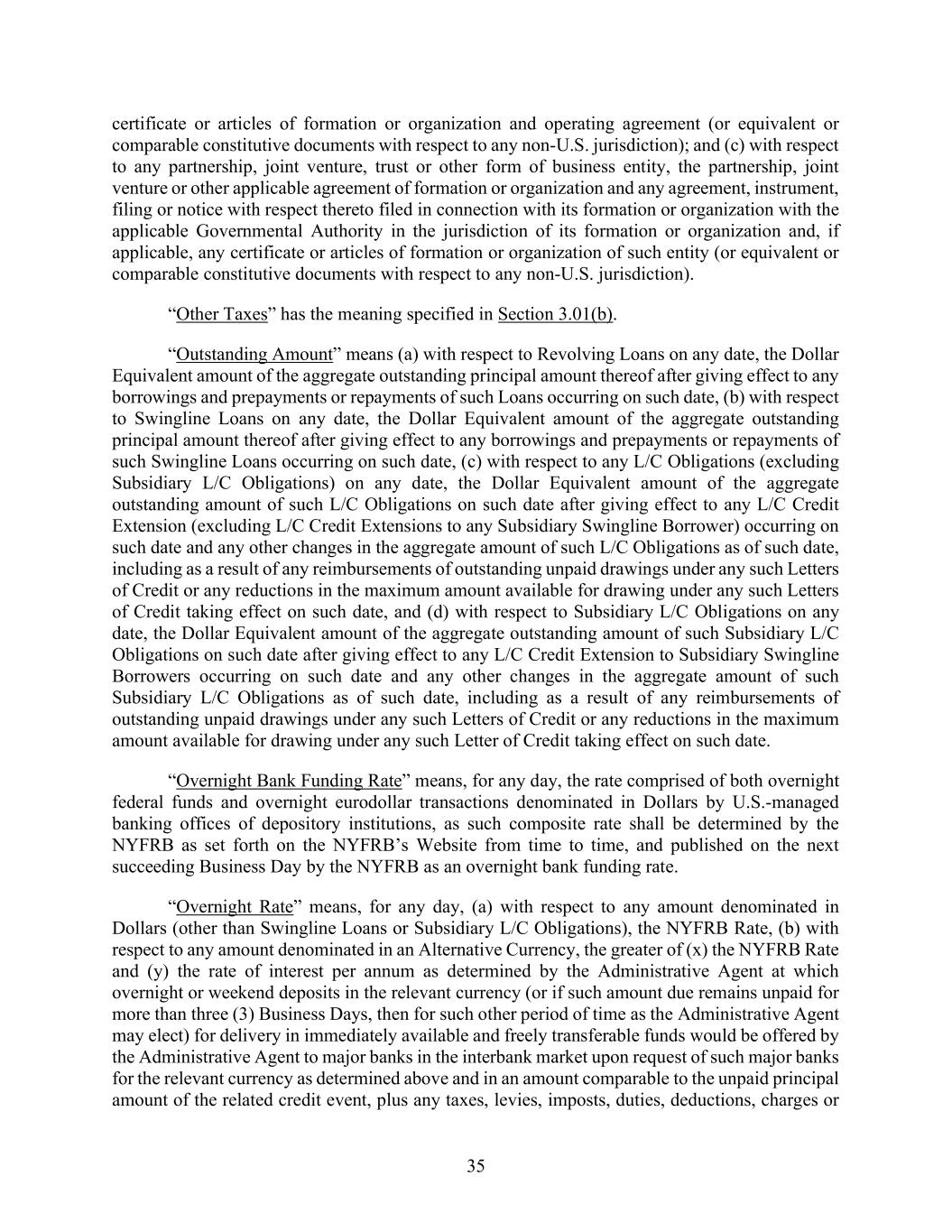 35 certificate or articles of formation or organization and operating agreement (or equivalent or comparable constitutive documents with respect to any non-U.S. jurisdiction); and (c) with respect to any partnership, joint venture, trust or other form of business entity, the partnership, joint venture or other applicable agreement of formation or organization and any agreement, instrument, filing or notice with respect thereto filed in connection with its formation or organization with the applicable Governmental Authority in the jurisdiction of its formation or organization and, if applicable, any certificate or articles of formation or organization of such entity (or equivalent or comparable constitutive documents with respect to any non-U.S. jurisdiction). “Other Taxes” has the meaning specified in Section 3.01(b). “Outstanding Amount” means (a) with respect to Revolving Loans on any date, the Dollar Equivalent amount of the aggregate outstanding principal amount thereof after giving effect to any borrowings and prepayments or repayments of such Loans occurring on such date, (b) with respect to Swingline Loans on any date, the Dollar Equivalent amount of the aggregate outstanding principal amount thereof after giving effect to any borrowings and prepayments or repayments of such Swingline Loans occurring on such date, (c) with respect to any L/C Obligations (excluding Subsidiary L/C Obligations) on any date, the Dollar Equivalent amount of the aggregate outstanding amount of such L/C Obligations on such date after giving effect to any L/C Credit Extension (excluding L/C Credit Extensions to any Subsidiary Swingline Borrower) occurring on such date and any other changes in the aggregate amount of such L/C Obligations as of such date, including as a result of any reimbursements of outstanding unpaid drawings under any such Letters of Credit or any reductions in the maximum amount available for drawing under any such Letters of Credit taking effect on such date, and (d) with respect to Subsidiary L/C Obligations on any date, the Dollar Equivalent amount of the aggregate outstanding amount of such Subsidiary L/C Obligations on such date after giving effect to any L/C Credit Extension to Subsidiary Swingline Borrowers occurring on such date and any other changes in the aggregate amount of such Subsidiary L/C Obligations as of such date, including as a result of any reimbursements of outstanding unpaid drawings under any such Letters of Credit or any reductions in the maximum amount available for drawing under any such Letter of Credit taking effect on such date. “Overnight Bank Funding Rate” means, for any day, the rate comprised of both overnight federal funds and overnight eurodollar transactions denominated in Dollars by U.S.-managed banking offices of depository institutions, as such composite rate shall be determined by the NYFRB as set forth on the NYFRB’s Website from time to time, and published on the next succeeding Business Day by the NYFRB as an overnight bank funding rate. “Overnight Rate” means, for any day, (a) with respect to any amount denominated in Dollars (other than Swingline Loans or Subsidiary L/C Obligations), the NYFRB Rate, (b) with respect to any amount denominated in an Alternative Currency, the greater of (x) the NYFRB Rate and (y) the rate of interest per annum as determined by the Administrative Agent at which overnight or weekend deposits in the relevant currency (or if such amount due remains unpaid for more than three (3) Business Days, then for such other period of time as the Administrative Agent may elect) for delivery in immediately available and freely transferable funds would be offered by the Administrative Agent to major banks in the interbank market upon request of such major banks for the relevant currency as determined above and in an amount comparable to the unpaid principal amount of the related credit event, plus any taxes, levies, imposts, duties, deductions, charges or