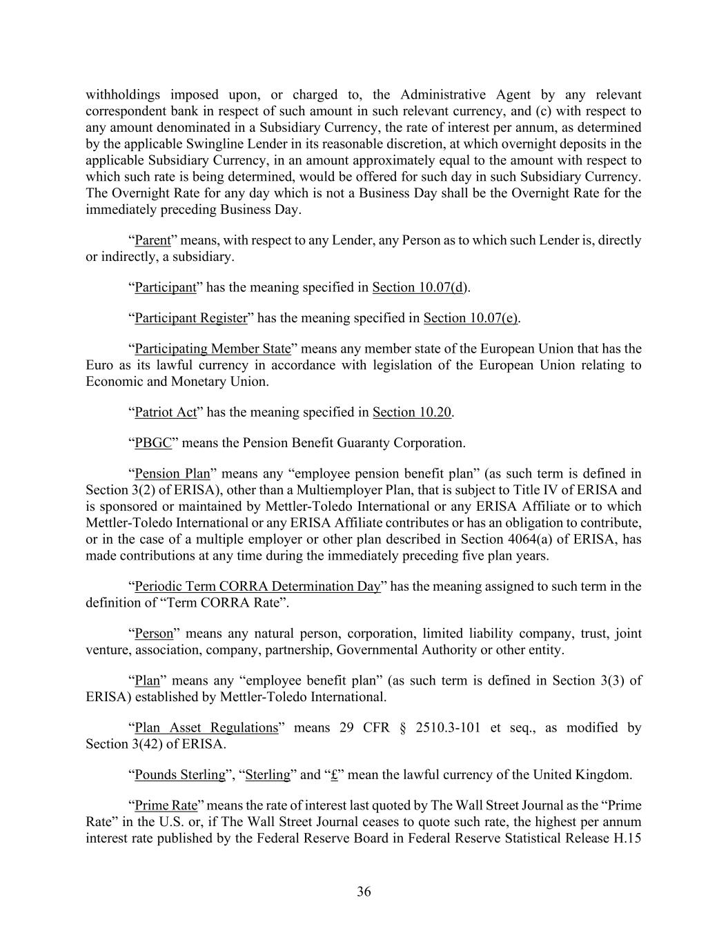 36 withholdings imposed upon, or charged to, the Administrative Agent by any relevant correspondent bank in respect of such amount in such relevant currency, and (c) with respect to any amount denominated in a Subsidiary Currency, the rate of interest per annum, as determined by the applicable Swingline Lender in its reasonable discretion, at which overnight deposits in the applicable Subsidiary Currency, in an amount approximately equal to the amount with respect to which such rate is being determined, would be offered for such day in such Subsidiary Currency. The Overnight Rate for any day which is not a Business Day shall be the Overnight Rate for the immediately preceding Business Day. “Parent” means, with respect to any Lender, any Person as to which such Lender is, directly or indirectly, a subsidiary. “Participant” has the meaning specified in Section 10.07(d). “Participant Register” has the meaning specified in Section 10.07(e). “Participating Member State” means any member state of the European Union that has the Euro as its lawful currency in accordance with legislation of the European Union relating to Economic and Monetary Union. “Patriot Act” has the meaning specified in Section 10.20. “PBGC” means the Pension Benefit Guaranty Corporation. “Pension Plan” means any “employee pension benefit plan” (as such term is defined in Section 3(2) of ERISA), other than a Multiemployer Plan, that is subject to Title IV of ERISA and is sponsored or maintained by Mettler-Toledo International or any ERISA Affiliate or to which Mettler-Toledo International or any ERISA Affiliate contributes or has an obligation to contribute, or in the case of a multiple employer or other plan described in Section 4064(a) of ERISA, has made contributions at any time during the immediately preceding five plan years. “Periodic Term CORRA Determination Day” has the meaning assigned to such term in the definition of “Term CORRA Rate”. “Person” means any natural person, corporation, limited liability company, trust, joint venture, association, company, partnership, Governmental Authority or other entity. “Plan” means any “employee benefit plan” (as such term is defined in Section 3(3) of ERISA) established by Mettler-Toledo International. “Plan Asset Regulations” means 29 CFR § 2510.3-101 et seq., as modified by Section 3(42) of ERISA. “Pounds Sterling”, “Sterling” and “£” mean the lawful currency of the United Kingdom. “Prime Rate” means the rate of interest last quoted by The Wall Street Journal as the “Prime Rate” in the U.S. or, if The Wall Street Journal ceases to quote such rate, the highest per annum interest rate published by the Federal Reserve Board in Federal Reserve Statistical Release H.15