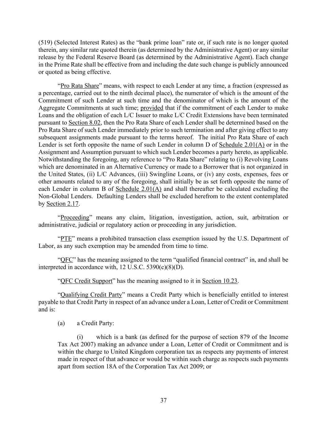 37 (519) (Selected Interest Rates) as the “bank prime loan” rate or, if such rate is no longer quoted therein, any similar rate quoted therein (as determined by the Administrative Agent) or any similar release by the Federal Reserve Board (as determined by the Administrative Agent). Each change in the Prime Rate shall be effective from and including the date such change is publicly announced or quoted as being effective. “Pro Rata Share” means, with respect to each Lender at any time, a fraction (expressed as a percentage, carried out to the ninth decimal place), the numerator of which is the amount of the Commitment of such Lender at such time and the denominator of which is the amount of the Aggregate Commitments at such time; provided that if the commitment of each Lender to make Loans and the obligation of each L/C Issuer to make L/C Credit Extensions have been terminated pursuant to Section 8.02, then the Pro Rata Share of each Lender shall be determined based on the Pro Rata Share of such Lender immediately prior to such termination and after giving effect to any subsequent assignments made pursuant to the terms hereof. The initial Pro Rata Share of each Lender is set forth opposite the name of such Lender in column D of Schedule 2.01(A) or in the Assignment and Assumption pursuant to which such Lender becomes a party hereto, as applicable. Notwithstanding the foregoing, any reference to “Pro Rata Share” relating to (i) Revolving Loans which are denominated in an Alternative Currency or made to a Borrower that is not organized in the United States, (ii) L/C Advances, (iii) Swingline Loans, or (iv) any costs, expenses, fees or other amounts related to any of the foregoing, shall initially be as set forth opposite the name of each Lender in column B of Schedule 2.01(A) and shall thereafter be calculated excluding the Non-Global Lenders. Defaulting Lenders shall be excluded herefrom to the extent contemplated by Section 2.17. “Proceeding” means any claim, litigation, investigation, action, suit, arbitration or administrative, judicial or regulatory action or proceeding in any jurisdiction. “PTE” means a prohibited transaction class exemption issued by the U.S. Department of Labor, as any such exemption may be amended from time to time. “QFC” has the meaning assigned to the term “qualified financial contract” in, and shall be interpreted in accordance with, 12 U.S.C. 5390(c)(8)(D). “QFC Credit Support” has the meaning assigned to it in Section 10.23. “Qualifying Credit Party” means a Credit Party which is beneficially entitled to interest payable to that Credit Party in respect of an advance under a Loan, Letter of Credit or Commitment and is: (a) a Credit Party: (i) which is a bank (as defined for the purpose of section 879 of the Income Tax Act 2007) making an advance under a Loan, Letter of Credit or Commitment and is within the charge to United Kingdom corporation tax as respects any payments of interest made in respect of that advance or would be within such charge as respects such payments apart from section 18A of the Corporation Tax Act 2009; or