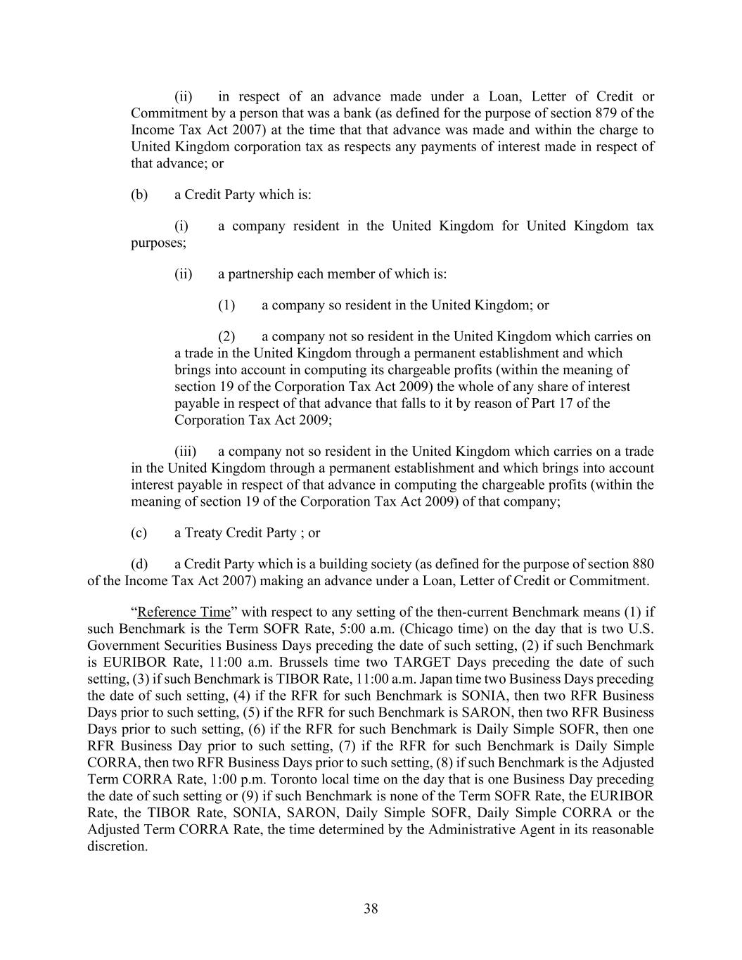 38 (ii) in respect of an advance made under a Loan, Letter of Credit or Commitment by a person that was a bank (as defined for the purpose of section 879 of the Income Tax Act 2007) at the time that that advance was made and within the charge to United Kingdom corporation tax as respects any payments of interest made in respect of that advance; or (b) a Credit Party which is: (i) a company resident in the United Kingdom for United Kingdom tax purposes; (ii) a partnership each member of which is: (1) a company so resident in the United Kingdom; or (2) a company not so resident in the United Kingdom which carries on a trade in the United Kingdom through a permanent establishment and which brings into account in computing its chargeable profits (within the meaning of section 19 of the Corporation Tax Act 2009) the whole of any share of interest payable in respect of that advance that falls to it by reason of Part 17 of the Corporation Tax Act 2009; (iii) a company not so resident in the United Kingdom which carries on a trade in the United Kingdom through a permanent establishment and which brings into account interest payable in respect of that advance in computing the chargeable profits (within the meaning of section 19 of the Corporation Tax Act 2009) of that company; (c) a Treaty Credit Party ; or (d) a Credit Party which is a building society (as defined for the purpose of section 880 of the Income Tax Act 2007) making an advance under a Loan, Letter of Credit or Commitment. “Reference Time” with respect to any setting of the then-current Benchmark means (1) if such Benchmark is the Term SOFR Rate, 5:00 a.m. (Chicago time) on the day that is two U.S. Government Securities Business Days preceding the date of such setting, (2) if such Benchmark is EURIBOR Rate, 11:00 a.m. Brussels time two TARGET Days preceding the date of such setting, (3) if such Benchmark is TIBOR Rate, 11:00 a.m. Japan time two Business Days preceding the date of such setting, (4) if the RFR for such Benchmark is SONIA, then two RFR Business Days prior to such setting, (5) if the RFR for such Benchmark is SARON, then two RFR Business Days prior to such setting, (6) if the RFR for such Benchmark is Daily Simple SOFR, then one RFR Business Day prior to such setting, (7) if the RFR for such Benchmark is Daily Simple CORRA, then two RFR Business Days prior to such setting, (8) if such Benchmark is the Adjusted Term CORRA Rate, 1:00 p.m. Toronto local time on the day that is one Business Day preceding the date of such setting or (9) if such Benchmark is none of the Term SOFR Rate, the EURIBOR Rate, the TIBOR Rate, SONIA, SARON, Daily Simple SOFR, Daily Simple CORRA or the Adjusted Term CORRA Rate, the time determined by the Administrative Agent in its reasonable discretion.