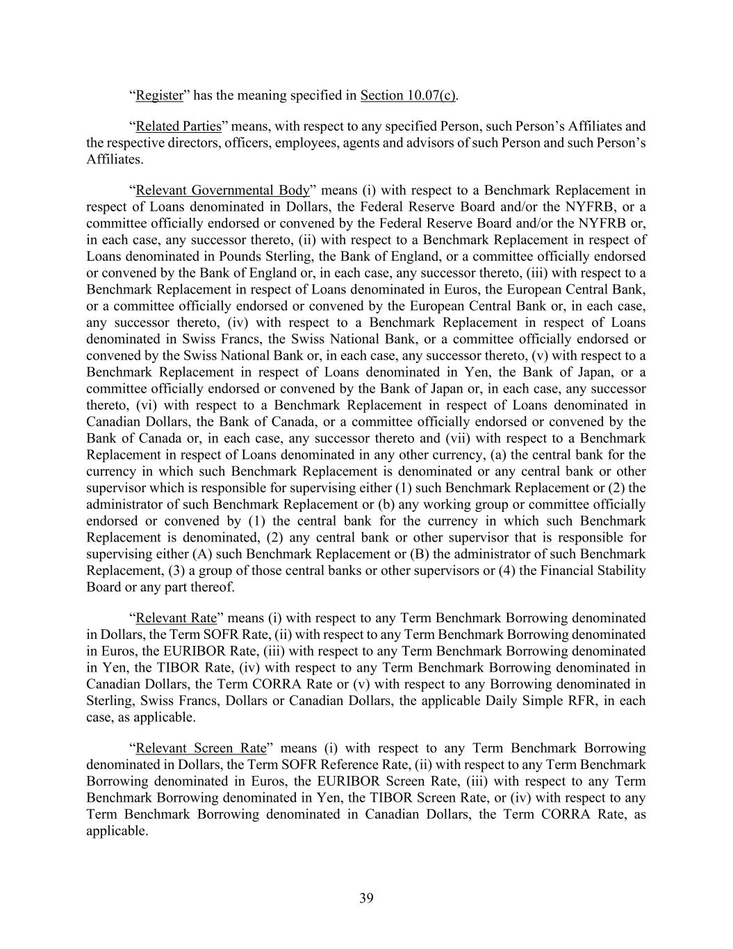 39 “Register” has the meaning specified in Section 10.07(c). “Related Parties” means, with respect to any specified Person, such Person’s Affiliates and the respective directors, officers, employees, agents and advisors of such Person and such Person’s Affiliates. “Relevant Governmental Body” means (i) with respect to a Benchmark Replacement in respect of Loans denominated in Dollars, the Federal Reserve Board and/or the NYFRB, or a committee officially endorsed or convened by the Federal Reserve Board and/or the NYFRB or, in each case, any successor thereto, (ii) with respect to a Benchmark Replacement in respect of Loans denominated in Pounds Sterling, the Bank of England, or a committee officially endorsed or convened by the Bank of England or, in each case, any successor thereto, (iii) with respect to a Benchmark Replacement in respect of Loans denominated in Euros, the European Central Bank, or a committee officially endorsed or convened by the European Central Bank or, in each case, any successor thereto, (iv) with respect to a Benchmark Replacement in respect of Loans denominated in Swiss Francs, the Swiss National Bank, or a committee officially endorsed or convened by the Swiss National Bank or, in each case, any successor thereto, (v) with respect to a Benchmark Replacement in respect of Loans denominated in Yen, the Bank of Japan, or a committee officially endorsed or convened by the Bank of Japan or, in each case, any successor thereto, (vi) with respect to a Benchmark Replacement in respect of Loans denominated in Canadian Dollars, the Bank of Canada, or a committee officially endorsed or convened by the Bank of Canada or, in each case, any successor thereto and (vii) with respect to a Benchmark Replacement in respect of Loans denominated in any other currency, (a) the central bank for the currency in which such Benchmark Replacement is denominated or any central bank or other supervisor which is responsible for supervising either (1) such Benchmark Replacement or (2) the administrator of such Benchmark Replacement or (b) any working group or committee officially endorsed or convened by (1) the central bank for the currency in which such Benchmark Replacement is denominated, (2) any central bank or other supervisor that is responsible for supervising either (A) such Benchmark Replacement or (B) the administrator of such Benchmark Replacement, (3) a group of those central banks or other supervisors or (4) the Financial Stability Board or any part thereof. “Relevant Rate” means (i) with respect to any Term Benchmark Borrowing denominated in Dollars, the Term SOFR Rate, (ii) with respect to any Term Benchmark Borrowing denominated in Euros, the EURIBOR Rate, (iii) with respect to any Term Benchmark Borrowing denominated in Yen, the TIBOR Rate, (iv) with respect to any Term Benchmark Borrowing denominated in Canadian Dollars, the Term CORRA Rate or (v) with respect to any Borrowing denominated in Sterling, Swiss Francs, Dollars or Canadian Dollars, the applicable Daily Simple RFR, in each case, as applicable. “Relevant Screen Rate” means (i) with respect to any Term Benchmark Borrowing denominated in Dollars, the Term SOFR Reference Rate, (ii) with respect to any Term Benchmark Borrowing denominated in Euros, the EURIBOR Screen Rate, (iii) with respect to any Term Benchmark Borrowing denominated in Yen, the TIBOR Screen Rate, or (iv) with respect to any Term Benchmark Borrowing denominated in Canadian Dollars, the Term CORRA Rate, as applicable.