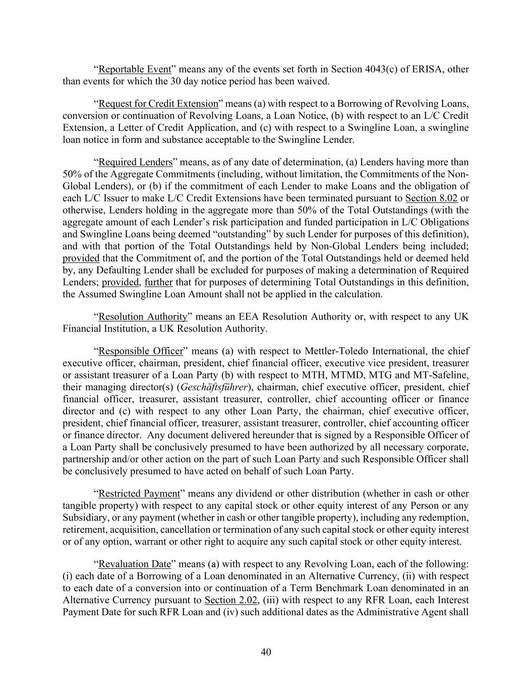 40 “Reportable Event” means any of the events set forth in Section 4043(c) of ERISA, other than events for which the 30 day notice period has been waived. “Request for Credit Extension” means (a) with respect to a Borrowing of Revolving Loans, conversion or continuation of Revolving Loans, a Loan Notice, (b) with respect to an L/C Credit Extension, a Letter of Credit Application, and (c) with respect to a Swingline Loan, a swingline loan notice in form and substance acceptable to the Swingline Lender. “Required Lenders” means, as of any date of determination, (a) Lenders having more than 50% of the Aggregate Commitments (including, without limitation, the Commitments of the Non- Global Lenders), or (b) if the commitment of each Lender to make Loans and the obligation of each L/C Issuer to make L/C Credit Extensions have been terminated pursuant to Section 8.02 or otherwise, Lenders holding in the aggregate more than 50% of the Total Outstandings (with the aggregate amount of each Lender’s risk participation and funded participation in L/C Obligations and Swingline Loans being deemed “outstanding” by such Lender for purposes of this definition), and with that portion of the Total Outstandings held by Non-Global Lenders being included; provided that the Commitment of, and the portion of the Total Outstandings held or deemed held by, any Defaulting Lender shall be excluded for purposes of making a determination of Required Lenders; provided, further that for purposes of determining Total Outstandings in this definition, the Assumed Swingline Loan Amount shall not be applied in the calculation. “Resolution Authority” means an EEA Resolution Authority or, with respect to any UK Financial Institution, a UK Resolution Authority. “Responsible Officer” means (a) with respect to Mettler-Toledo International, the chief executive officer, chairman, president, chief financial officer, executive vice president, treasurer or assistant treasurer of a Loan Party (b) with respect to MTH, MTMD, MTG and MT-Safeline, their managing director(s) (Geschäftsführer), chairman, chief executive officer, president, chief financial officer, treasurer, assistant treasurer, controller, chief accounting officer or finance director and (c) with respect to any other Loan Party, the chairman, chief executive officer, president, chief financial officer, treasurer, assistant treasurer, controller, chief accounting officer or finance director. Any document delivered hereunder that is signed by a Responsible Officer of a Loan Party shall be conclusively presumed to have been authorized by all necessary corporate, partnership and/or other action on the part of such Loan Party and such Responsible Officer shall be conclusively presumed to have acted on behalf of such Loan Party. “Restricted Payment” means any dividend or other distribution (whether in cash or other tangible property) with respect to any capital stock or other equity interest of any Person or any Subsidiary, or any payment (whether in cash or other tangible property), including any redemption, retirement, acquisition, cancellation or termination of any such capital stock or other equity interest or of any option, warrant or other right to acquire any such capital stock or other equity interest. “Revaluation Date” means (a) with respect to any Revolving Loan, each of the following: (i) each date of a Borrowing of a Loan denominated in an Alternative Currency, (ii) with respect to each date of a conversion into or continuation of a Term Benchmark Loan denominated in an Alternative Currency pursuant to Section 2.02, (iii) with respect to any RFR Loan, each Interest Payment Date for such RFR Loan and (iv) such additional dates as the Administrative Agent shall