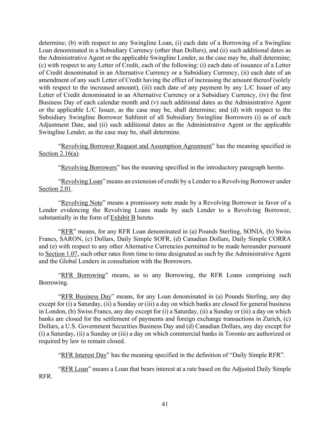 41 determine; (b) with respect to any Swingline Loan, (i) each date of a Borrowing of a Swingline Loan denominated in a Subsidiary Currency (other than Dollars), and (ii) such additional dates as the Administrative Agent or the applicable Swingline Lender, as the case may be, shall determine; (c) with respect to any Letter of Credit, each of the following: (i) each date of issuance of a Letter of Credit denominated in an Alternative Currency or a Subsidiary Currency, (ii) each date of an amendment of any such Letter of Credit having the effect of increasing the amount thereof (solely with respect to the increased amount), (iii) each date of any payment by any L/C Issuer of any Letter of Credit denominated in an Alternative Currency or a Subsidiary Currency, (iv) the first Business Day of each calendar month and (v) such additional dates as the Administrative Agent or the applicable L/C Issuer, as the case may be, shall determine; and (d) with respect to the Subsidiary Swingline Borrower Sublimit of all Subsidiary Swingline Borrowers (i) as of each Adjustment Date, and (ii) such additional dates as the Administrative Agent or the applicable Swingline Lender, as the case may be, shall determine. “Revolving Borrower Request and Assumption Agreement” has the meaning specified in Section 2.16(a). “Revolving Borrowers” has the meaning specified in the introductory paragraph hereto. “Revolving Loan” means an extension of credit by a Lender to a Revolving Borrower under Section 2.01. “Revolving Note” means a promissory note made by a Revolving Borrower in favor of a Lender evidencing the Revolving Loans made by such Lender to a Revolving Borrower, substantially in the form of Exhibit B hereto. “RFR” means, for any RFR Loan denominated in (a) Pounds Sterling, SONIA, (b) Swiss Francs, SARON, (c) Dollars, Daily Simple SOFR, (d) Canadian Dollars, Daily Simple CORRA and (e) with respect to any other Alternative Currencies permitted to be made hereunder pursuant to Section 1.07, such other rates from time to time designated as such by the Administrative Agent and the Global Lenders in consultation with the Borrowers. “RFR Borrowing” means, as to any Borrowing, the RFR Loans comprising such Borrowing. “RFR Business Day” means, for any Loan denominated in (a) Pounds Sterling, any day except for (i) a Saturday, (ii) a Sunday or (iii) a day on which banks are closed for general business in London, (b) Swiss Francs, any day except for (i) a Saturday, (ii) a Sunday or (iii) a day on which banks are closed for the settlement of payments and foreign exchange transactions in Zurich, (c) Dollars, a U.S. Government Securities Business Day and (d) Canadian Dollars, any day except for (i) a Saturday, (ii) a Sunday or (iii) a day on which commercial banks in Toronto are authorized or required by law to remain closed. “RFR Interest Day” has the meaning specified in the definition of “Daily Simple RFR”. “RFR Loan” means a Loan that bears interest at a rate based on the Adjusted Daily Simple RFR.