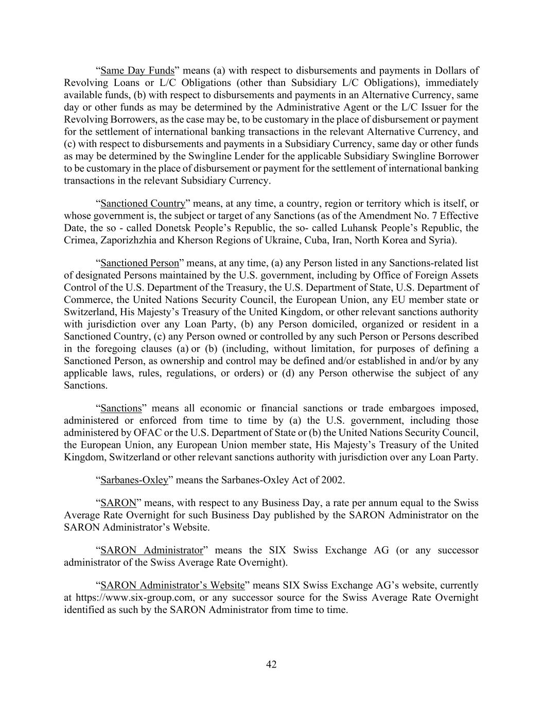 42 “Same Day Funds” means (a) with respect to disbursements and payments in Dollars of Revolving Loans or L/C Obligations (other than Subsidiary L/C Obligations), immediately available funds, (b) with respect to disbursements and payments in an Alternative Currency, same day or other funds as may be determined by the Administrative Agent or the L/C Issuer for the Revolving Borrowers, as the case may be, to be customary in the place of disbursement or payment for the settlement of international banking transactions in the relevant Alternative Currency, and (c) with respect to disbursements and payments in a Subsidiary Currency, same day or other funds as may be determined by the Swingline Lender for the applicable Subsidiary Swingline Borrower to be customary in the place of disbursement or payment for the settlement of international banking transactions in the relevant Subsidiary Currency. “Sanctioned Country” means, at any time, a country, region or territory which is itself, or whose government is, the subject or target of any Sanctions (as of the Amendment No. 7 Effective Date, the so - called Donetsk People’s Republic, the so- called Luhansk People’s Republic, the Crimea, Zaporizhzhia and Kherson Regions of Ukraine, Cuba, Iran, North Korea and Syria). “Sanctioned Person” means, at any time, (a) any Person listed in any Sanctions-related list of designated Persons maintained by the U.S. government, including by Office of Foreign Assets Control of the U.S. Department of the Treasury, the U.S. Department of State, U.S. Department of Commerce, the United Nations Security Council, the European Union, any EU member state or Switzerland, His Majesty’s Treasury of the United Kingdom, or other relevant sanctions authority with jurisdiction over any Loan Party, (b) any Person domiciled, organized or resident in a Sanctioned Country, (c) any Person owned or controlled by any such Person or Persons described in the foregoing clauses (a) or (b) (including, without limitation, for purposes of defining a Sanctioned Person, as ownership and control may be defined and/or established in and/or by any applicable laws, rules, regulations, or orders) or (d) any Person otherwise the subject of any Sanctions. “Sanctions” means all economic or financial sanctions or trade embargoes imposed, administered or enforced from time to time by (a) the U.S. government, including those administered by OFAC or the U.S. Department of State or (b) the United Nations Security Council, the European Union, any European Union member state, His Majesty’s Treasury of the United Kingdom, Switzerland or other relevant sanctions authority with jurisdiction over any Loan Party. “Sarbanes-Oxley” means the Sarbanes-Oxley Act of 2002. “SARON” means, with respect to any Business Day, a rate per annum equal to the Swiss Average Rate Overnight for such Business Day published by the SARON Administrator on the SARON Administrator’s Website. “SARON Administrator” means the SIX Swiss Exchange AG (or any successor administrator of the Swiss Average Rate Overnight). “SARON Administrator’s Website” means SIX Swiss Exchange AG’s website, currently at https://www.six-group.com, or any successor source for the Swiss Average Rate Overnight identified as such by the SARON Administrator from time to time.