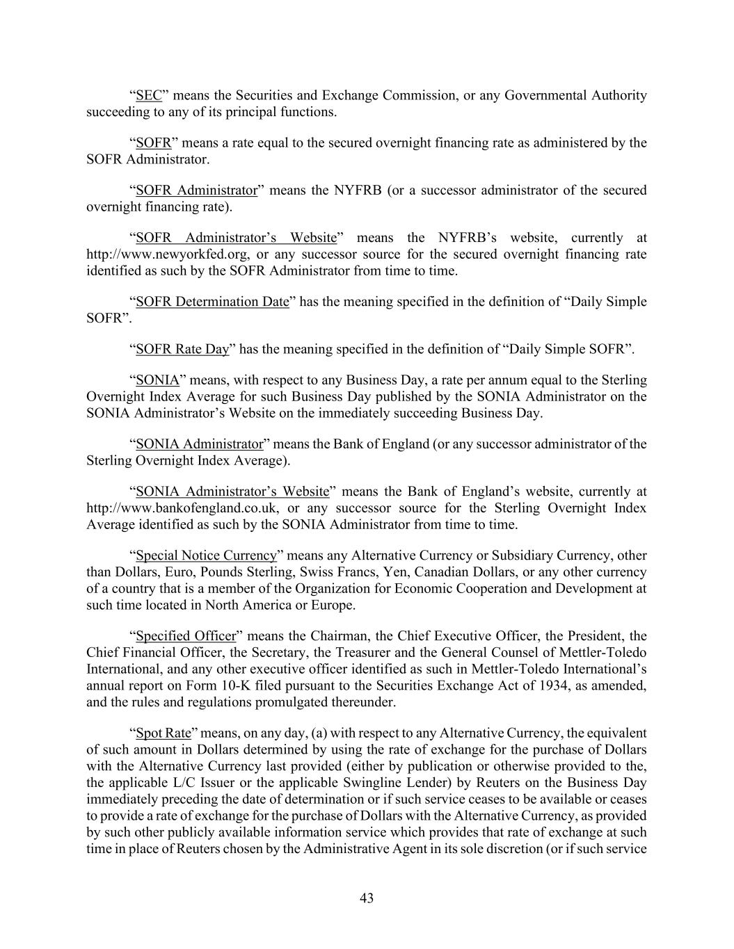 43 “SEC” means the Securities and Exchange Commission, or any Governmental Authority succeeding to any of its principal functions. “SOFR” means a rate equal to the secured overnight financing rate as administered by the SOFR Administrator. “SOFR Administrator” means the NYFRB (or a successor administrator of the secured overnight financing rate). “SOFR Administrator’s Website” means the NYFRB’s website, currently at http://www.newyorkfed.org, or any successor source for the secured overnight financing rate identified as such by the SOFR Administrator from time to time. “SOFR Determination Date” has the meaning specified in the definition of “Daily Simple SOFR”. “SOFR Rate Day” has the meaning specified in the definition of “Daily Simple SOFR”. “SONIA” means, with respect to any Business Day, a rate per annum equal to the Sterling Overnight Index Average for such Business Day published by the SONIA Administrator on the SONIA Administrator’s Website on the immediately succeeding Business Day. “SONIA Administrator” means the Bank of England (or any successor administrator of the Sterling Overnight Index Average). “SONIA Administrator’s Website” means the Bank of England’s website, currently at http://www.bankofengland.co.uk, or any successor source for the Sterling Overnight Index Average identified as such by the SONIA Administrator from time to time. “Special Notice Currency” means any Alternative Currency or Subsidiary Currency, other than Dollars, Euro, Pounds Sterling, Swiss Francs, Yen, Canadian Dollars, or any other currency of a country that is a member of the Organization for Economic Cooperation and Development at such time located in North America or Europe. “Specified Officer” means the Chairman, the Chief Executive Officer, the President, the Chief Financial Officer, the Secretary, the Treasurer and the General Counsel of Mettler-Toledo International, and any other executive officer identified as such in Mettler-Toledo International’s annual report on Form 10-K filed pursuant to the Securities Exchange Act of 1934, as amended, and the rules and regulations promulgated thereunder. “Spot Rate” means, on any day, (a) with respect to any Alternative Currency, the equivalent of such amount in Dollars determined by using the rate of exchange for the purchase of Dollars with the Alternative Currency last provided (either by publication or otherwise provided to the, the applicable L/C Issuer or the applicable Swingline Lender) by Reuters on the Business Day immediately preceding the date of determination or if such service ceases to be available or ceases to provide a rate of exchange for the purchase of Dollars with the Alternative Currency, as provided by such other publicly available information service which provides that rate of exchange at such time in place of Reuters chosen by the Administrative Agent in its sole discretion (or if such service