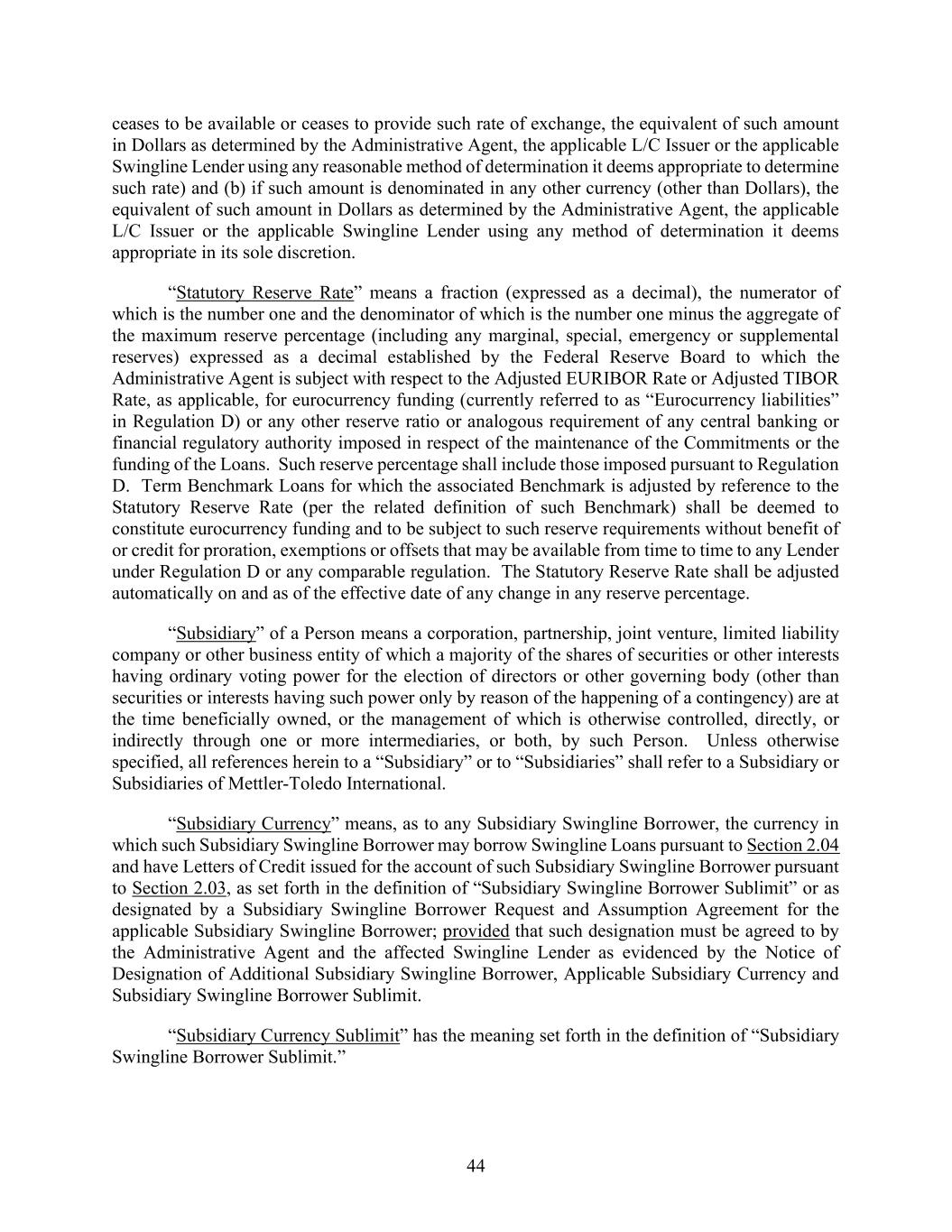 44 ceases to be available or ceases to provide such rate of exchange, the equivalent of such amount in Dollars as determined by the Administrative Agent, the applicable L/C Issuer or the applicable Swingline Lender using any reasonable method of determination it deems appropriate to determine such rate) and (b) if such amount is denominated in any other currency (other than Dollars), the equivalent of such amount in Dollars as determined by the Administrative Agent, the applicable L/C Issuer or the applicable Swingline Lender using any method of determination it deems appropriate in its sole discretion. “Statutory Reserve Rate” means a fraction (expressed as a decimal), the numerator of which is the number one and the denominator of which is the number one minus the aggregate of the maximum reserve percentage (including any marginal, special, emergency or supplemental reserves) expressed as a decimal established by the Federal Reserve Board to which the Administrative Agent is subject with respect to the Adjusted EURIBOR Rate or Adjusted TIBOR Rate, as applicable, for eurocurrency funding (currently referred to as “Eurocurrency liabilities” in Regulation D) or any other reserve ratio or analogous requirement of any central banking or financial regulatory authority imposed in respect of the maintenance of the Commitments or the funding of the Loans. Such reserve percentage shall include those imposed pursuant to Regulation D. Term Benchmark Loans for which the associated Benchmark is adjusted by reference to the Statutory Reserve Rate (per the related definition of such Benchmark) shall be deemed to constitute eurocurrency funding and to be subject to such reserve requirements without benefit of or credit for proration, exemptions or offsets that may be available from time to time to any Lender under Regulation D or any comparable regulation. The Statutory Reserve Rate shall be adjusted automatically on and as of the effective date of any change in any reserve percentage. “Subsidiary” of a Person means a corporation, partnership, joint venture, limited liability company or other business entity of which a majority of the shares of securities or other interests having ordinary voting power for the election of directors or other governing body (other than securities or interests having such power only by reason of the happening of a contingency) are at the time beneficially owned, or the management of which is otherwise controlled, directly, or indirectly through one or more intermediaries, or both, by such Person. Unless otherwise specified, all references herein to a “Subsidiary” or to “Subsidiaries” shall refer to a Subsidiary or Subsidiaries of Mettler-Toledo International. “Subsidiary Currency” means, as to any Subsidiary Swingline Borrower, the currency in which such Subsidiary Swingline Borrower may borrow Swingline Loans pursuant to Section 2.04 and have Letters of Credit issued for the account of such Subsidiary Swingline Borrower pursuant to Section 2.03, as set forth in the definition of “Subsidiary Swingline Borrower Sublimit” or as designated by a Subsidiary Swingline Borrower Request and Assumption Agreement for the applicable Subsidiary Swingline Borrower; provided that such designation must be agreed to by the Administrative Agent and the affected Swingline Lender as evidenced by the Notice of Designation of Additional Subsidiary Swingline Borrower, Applicable Subsidiary Currency and Subsidiary Swingline Borrower Sublimit. “Subsidiary Currency Sublimit” has the meaning set forth in the definition of “Subsidiary Swingline Borrower Sublimit.”