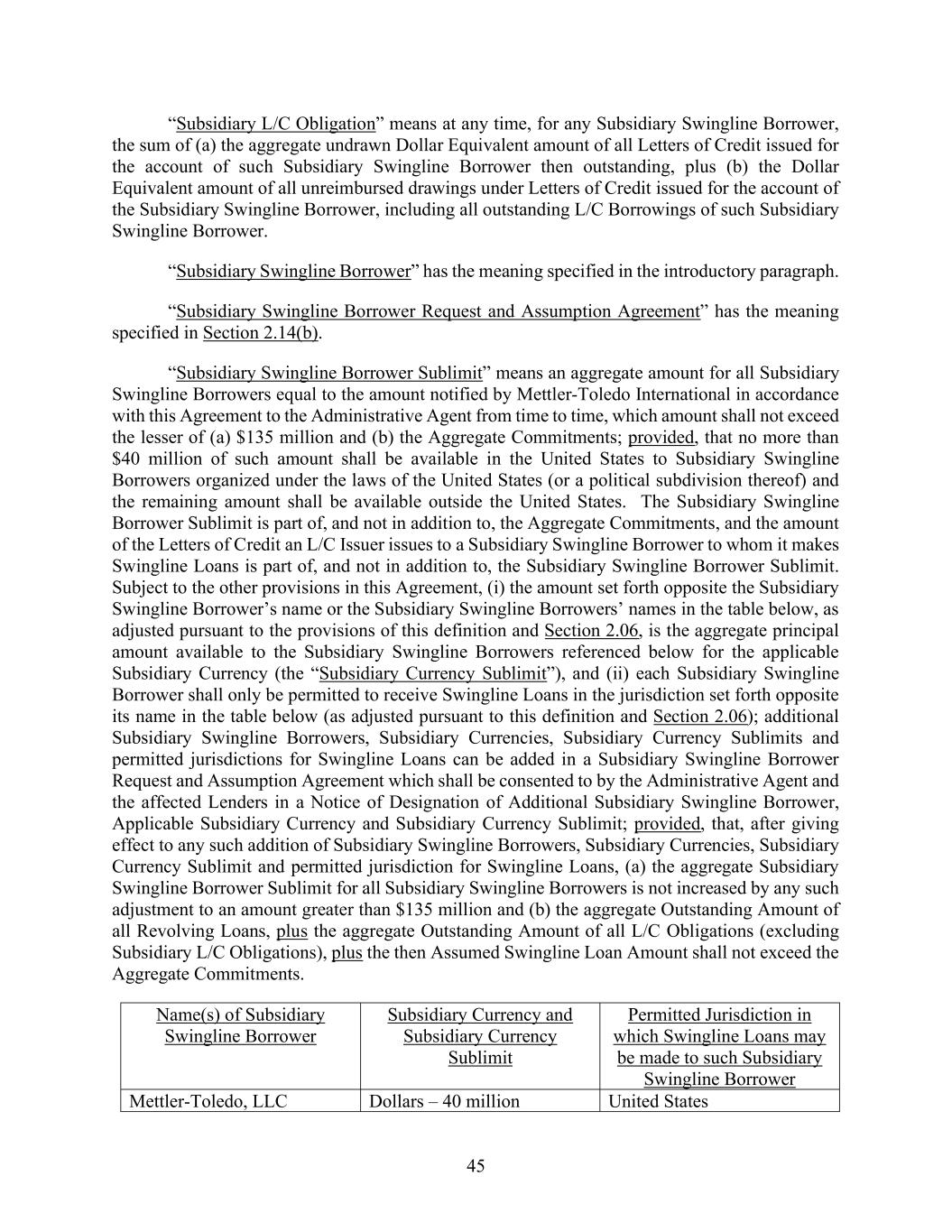 45 “Subsidiary L/C Obligation” means at any time, for any Subsidiary Swingline Borrower, the sum of (a) the aggregate undrawn Dollar Equivalent amount of all Letters of Credit issued for the account of such Subsidiary Swingline Borrower then outstanding, plus (b) the Dollar Equivalent amount of all unreimbursed drawings under Letters of Credit issued for the account of the Subsidiary Swingline Borrower, including all outstanding L/C Borrowings of such Subsidiary Swingline Borrower. “Subsidiary Swingline Borrower” has the meaning specified in the introductory paragraph. “Subsidiary Swingline Borrower Request and Assumption Agreement” has the meaning specified in Section 2.14(b). “Subsidiary Swingline Borrower Sublimit” means an aggregate amount for all Subsidiary Swingline Borrowers equal to the amount notified by Mettler-Toledo International in accordance with this Agreement to the Administrative Agent from time to time, which amount shall not exceed the lesser of (a) $135 million and (b) the Aggregate Commitments; provided, that no more than $40 million of such amount shall be available in the United States to Subsidiary Swingline Borrowers organized under the laws of the United States (or a political subdivision thereof) and the remaining amount shall be available outside the United States. The Subsidiary Swingline Borrower Sublimit is part of, and not in addition to, the Aggregate Commitments, and the amount of the Letters of Credit an L/C Issuer issues to a Subsidiary Swingline Borrower to whom it makes Swingline Loans is part of, and not in addition to, the Subsidiary Swingline Borrower Sublimit. Subject to the other provisions in this Agreement, (i) the amount set forth opposite the Subsidiary Swingline Borrower’s name or the Subsidiary Swingline Borrowers’ names in the table below, as adjusted pursuant to the provisions of this definition and Section 2.06, is the aggregate principal amount available to the Subsidiary Swingline Borrowers referenced below for the applicable Subsidiary Currency (the “Subsidiary Currency Sublimit”), and (ii) each Subsidiary Swingline Borrower shall only be permitted to receive Swingline Loans in the jurisdiction set forth opposite its name in the table below (as adjusted pursuant to this definition and Section 2.06); additional Subsidiary Swingline Borrowers, Subsidiary Currencies, Subsidiary Currency Sublimits and permitted jurisdictions for Swingline Loans can be added in a Subsidiary Swingline Borrower Request and Assumption Agreement which shall be consented to by the Administrative Agent and the affected Lenders in a Notice of Designation of Additional Subsidiary Swingline Borrower, Applicable Subsidiary Currency and Subsidiary Currency Sublimit; provided, that, after giving effect to any such addition of Subsidiary Swingline Borrowers, Subsidiary Currencies, Subsidiary Currency Sublimit and permitted jurisdiction for Swingline Loans, (a) the aggregate Subsidiary Swingline Borrower Sublimit for all Subsidiary Swingline Borrowers is not increased by any such adjustment to an amount greater than $135 million and (b) the aggregate Outstanding Amount of all Revolving Loans, plus the aggregate Outstanding Amount of all L/C Obligations (excluding Subsidiary L/C Obligations), plus the then Assumed Swingline Loan Amount shall not exceed the Aggregate Commitments. Name(s) of Subsidiary Swingline Borrower Subsidiary Currency and Subsidiary Currency Sublimit Permitted Jurisdiction in which Swingline Loans may be made to such Subsidiary Swingline Borrower Mettler-Toledo, LLC Dollars – 40 million United States
