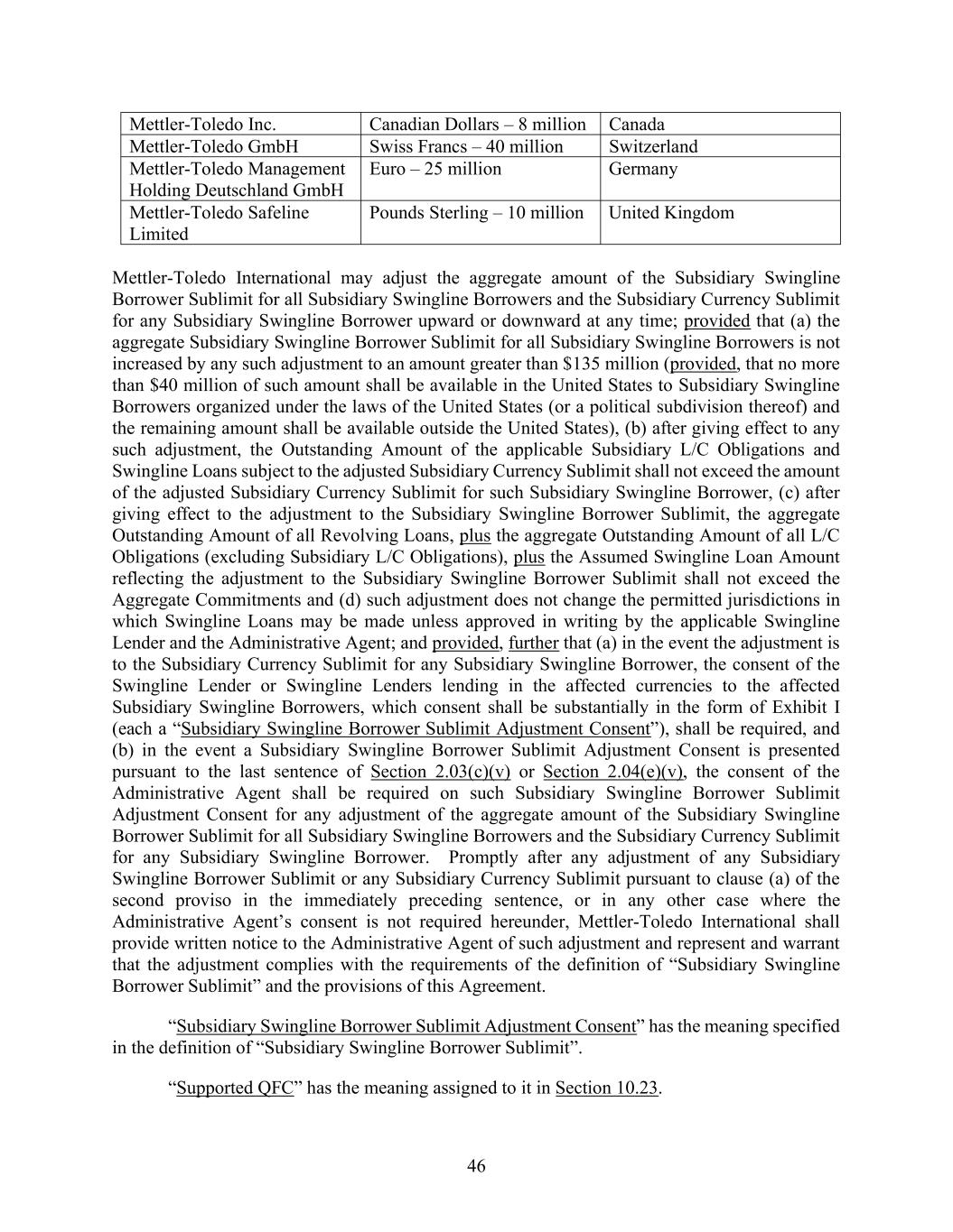 46 Mettler-Toledo Inc. Canadian Dollars – 8 million Canada Mettler-Toledo GmbH Swiss Francs – 40 million Switzerland Mettler-Toledo Management Holding Deutschland GmbH Euro – 25 million Germany Mettler-Toledo Safeline Limited Pounds Sterling – 10 million United Kingdom Mettler-Toledo International may adjust the aggregate amount of the Subsidiary Swingline Borrower Sublimit for all Subsidiary Swingline Borrowers and the Subsidiary Currency Sublimit for any Subsidiary Swingline Borrower upward or downward at any time; provided that (a) the aggregate Subsidiary Swingline Borrower Sublimit for all Subsidiary Swingline Borrowers is not increased by any such adjustment to an amount greater than $135 million (provided, that no more than $40 million of such amount shall be available in the United States to Subsidiary Swingline Borrowers organized under the laws of the United States (or a political subdivision thereof) and the remaining amount shall be available outside the United States), (b) after giving effect to any such adjustment, the Outstanding Amount of the applicable Subsidiary L/C Obligations and Swingline Loans subject to the adjusted Subsidiary Currency Sublimit shall not exceed the amount of the adjusted Subsidiary Currency Sublimit for such Subsidiary Swingline Borrower, (c) after giving effect to the adjustment to the Subsidiary Swingline Borrower Sublimit, the aggregate Outstanding Amount of all Revolving Loans, plus the aggregate Outstanding Amount of all L/C Obligations (excluding Subsidiary L/C Obligations), plus the Assumed Swingline Loan Amount reflecting the adjustment to the Subsidiary Swingline Borrower Sublimit shall not exceed the Aggregate Commitments and (d) such adjustment does not change the permitted jurisdictions in which Swingline Loans may be made unless approved in writing by the applicable Swingline Lender and the Administrative Agent; and provided, further that (a) in the event the adjustment is to the Subsidiary Currency Sublimit for any Subsidiary Swingline Borrower, the consent of the Swingline Lender or Swingline Lenders lending in the affected currencies to the affected Subsidiary Swingline Borrowers, which consent shall be substantially in the form of Exhibit I (each a “Subsidiary Swingline Borrower Sublimit Adjustment Consent”), shall be required, and (b) in the event a Subsidiary Swingline Borrower Sublimit Adjustment Consent is presented pursuant to the last sentence of Section 2.03(c)(v) or Section 2.04(e)(v), the consent of the Administrative Agent shall be required on such Subsidiary Swingline Borrower Sublimit Adjustment Consent for any adjustment of the aggregate amount of the Subsidiary Swingline Borrower Sublimit for all Subsidiary Swingline Borrowers and the Subsidiary Currency Sublimit for any Subsidiary Swingline Borrower. Promptly after any adjustment of any Subsidiary Swingline Borrower Sublimit or any Subsidiary Currency Sublimit pursuant to clause (a) of the second proviso in the immediately preceding sentence, or in any other case where the Administrative Agent’s consent is not required hereunder, Mettler-Toledo International shall provide written notice to the Administrative Agent of such adjustment and represent and warrant that the adjustment complies with the requirements of the definition of “Subsidiary Swingline Borrower Sublimit” and the provisions of this Agreement. “Subsidiary Swingline Borrower Sublimit Adjustment Consent” has the meaning specified in the definition of “Subsidiary Swingline Borrower Sublimit”. “Supported QFC” has the meaning assigned to it in Section 10.23.
