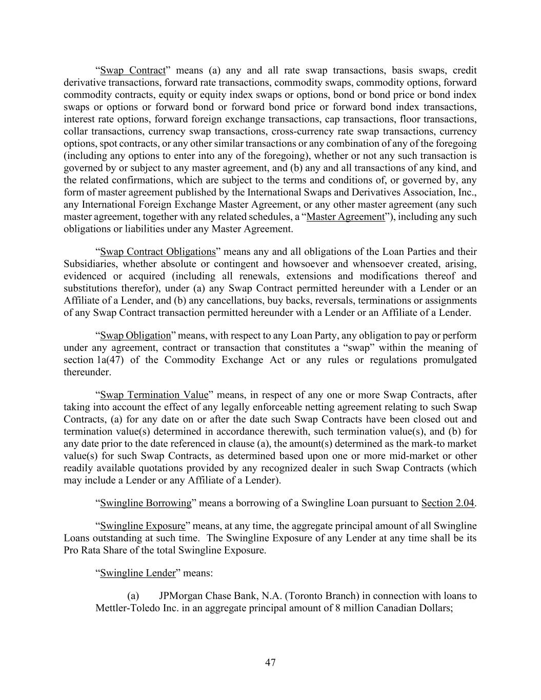 47 “Swap Contract” means (a) any and all rate swap transactions, basis swaps, credit derivative transactions, forward rate transactions, commodity swaps, commodity options, forward commodity contracts, equity or equity index swaps or options, bond or bond price or bond index swaps or options or forward bond or forward bond price or forward bond index transactions, interest rate options, forward foreign exchange transactions, cap transactions, floor transactions, collar transactions, currency swap transactions, cross-currency rate swap transactions, currency options, spot contracts, or any other similar transactions or any combination of any of the foregoing (including any options to enter into any of the foregoing), whether or not any such transaction is governed by or subject to any master agreement, and (b) any and all transactions of any kind, and the related confirmations, which are subject to the terms and conditions of, or governed by, any form of master agreement published by the International Swaps and Derivatives Association, Inc., any International Foreign Exchange Master Agreement, or any other master agreement (any such master agreement, together with any related schedules, a “Master Agreement”), including any such obligations or liabilities under any Master Agreement. “Swap Contract Obligations” means any and all obligations of the Loan Parties and their Subsidiaries, whether absolute or contingent and howsoever and whensoever created, arising, evidenced or acquired (including all renewals, extensions and modifications thereof and substitutions therefor), under (a) any Swap Contract permitted hereunder with a Lender or an Affiliate of a Lender, and (b) any cancellations, buy backs, reversals, terminations or assignments of any Swap Contract transaction permitted hereunder with a Lender or an Affiliate of a Lender. “Swap Obligation” means, with respect to any Loan Party, any obligation to pay or perform under any agreement, contract or transaction that constitutes a “swap” within the meaning of section 1a(47) of the Commodity Exchange Act or any rules or regulations promulgated thereunder. “Swap Termination Value” means, in respect of any one or more Swap Contracts, after taking into account the effect of any legally enforceable netting agreement relating to such Swap Contracts, (a) for any date on or after the date such Swap Contracts have been closed out and termination value(s) determined in accordance therewith, such termination value(s), and (b) for any date prior to the date referenced in clause (a), the amount(s) determined as the mark-to market value(s) for such Swap Contracts, as determined based upon one or more mid-market or other readily available quotations provided by any recognized dealer in such Swap Contracts (which may include a Lender or any Affiliate of a Lender). “Swingline Borrowing” means a borrowing of a Swingline Loan pursuant to Section 2.04. “Swingline Exposure” means, at any time, the aggregate principal amount of all Swingline Loans outstanding at such time. The Swingline Exposure of any Lender at any time shall be its Pro Rata Share of the total Swingline Exposure. “Swingline Lender” means: (a) JPMorgan Chase Bank, N.A. (Toronto Branch) in connection with loans to Mettler-Toledo Inc. in an aggregate principal amount of 8 million Canadian Dollars;