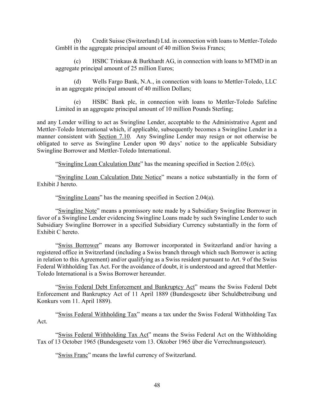48 (b) Credit Suisse (Switzerland) Ltd. in connection with loans to Mettler-Toledo GmbH in the aggregate principal amount of 40 million Swiss Francs; (c) HSBC Trinkaus & Burkhardt AG, in connection with loans to MTMD in an aggregate principal amount of 25 million Euros; (d) Wells Fargo Bank, N.A., in connection with loans to Mettler-Toledo, LLC in an aggregate principal amount of 40 million Dollars; (e) HSBC Bank plc, in connection with loans to Mettler-Toledo Safeline Limited in an aggregate principal amount of 10 million Pounds Sterling; and any Lender willing to act as Swingline Lender, acceptable to the Administrative Agent and Mettler-Toledo International which, if applicable, subsequently becomes a Swingline Lender in a manner consistent with Section 7.10. Any Swingline Lender may resign or not otherwise be obligated to serve as Swingline Lender upon 90 days’ notice to the applicable Subsidiary Swingline Borrower and Mettler-Toledo International. “Swingline Loan Calculation Date” has the meaning specified in Section 2.05(c). “Swingline Loan Calculation Date Notice” means a notice substantially in the form of Exhibit J hereto. “Swingline Loans” has the meaning specified in Section 2.04(a). “Swingline Note” means a promissory note made by a Subsidiary Swingline Borrower in favor of a Swingline Lender evidencing Swingline Loans made by such Swingline Lender to such Subsidiary Swingline Borrower in a specified Subsidiary Currency substantially in the form of Exhibit C hereto. “Swiss Borrower” means any Borrower incorporated in Switzerland and/or having a registered office in Switzerland (including a Swiss branch through which such Borrower is acting in relation to this Agreement) and/or qualifying as a Swiss resident pursuant to Art. 9 of the Swiss Federal Withholding Tax Act. For the avoidance of doubt, it is understood and agreed that Mettler- Toledo International is a Swiss Borrower hereunder. “Swiss Federal Debt Enforcement and Bankruptcy Act” means the Swiss Federal Debt Enforcement and Bankruptcy Act of 11 April 1889 (Bundesgesetz über Schuldbetreibung und Konkurs vom 11. April 1889). “Swiss Federal Withholding Tax” means a tax under the Swiss Federal Withholding Tax Act. “Swiss Federal Withholding Tax Act” means the Swiss Federal Act on the Withholding Tax of 13 October 1965 (Bundesgesetz vom 13. Oktober 1965 über die Verrechnungssteuer). “Swiss Franc” means the lawful currency of Switzerland.
