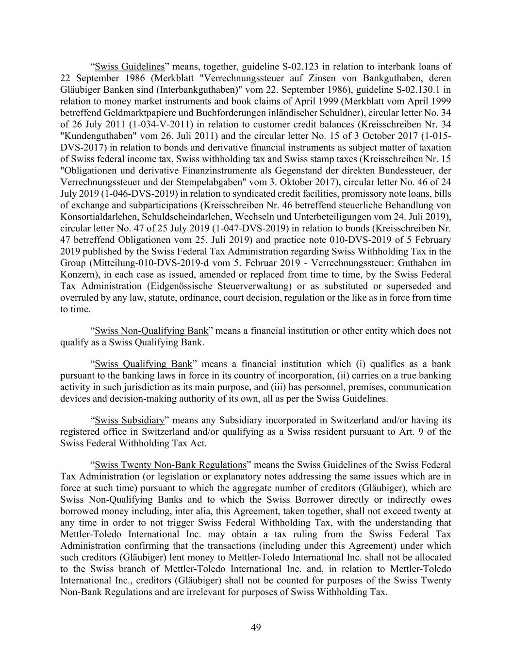 49 “Swiss Guidelines” means, together, guideline S-02.123 in relation to interbank loans of 22 September 1986 (Merkblatt "Verrechnungssteuer auf Zinsen von Bankguthaben, deren Gläubiger Banken sind (Interbankguthaben)" vom 22. September 1986), guideline S-02.130.1 in relation to money market instruments and book claims of April 1999 (Merkblatt vom April 1999 betreffend Geldmarktpapiere und Buchforderungen inländischer Schuldner), circular letter No. 34 of 26 July 2011 (1-034-V-2011) in relation to customer credit balances (Kreisschreiben Nr. 34 "Kundenguthaben" vom 26. Juli 2011) and the circular letter No. 15 of 3 October 2017 (1-015- DVS-2017) in relation to bonds and derivative financial instruments as subject matter of taxation of Swiss federal income tax, Swiss withholding tax and Swiss stamp taxes (Kreisschreiben Nr. 15 "Obligationen und derivative Finanzinstrumente als Gegenstand der direkten Bundessteuer, der Verrechnungssteuer und der Stempelabgaben" vom 3. Oktober 2017), circular letter No. 46 of 24 July 2019 (1-046-DVS-2019) in relation to syndicated credit facilities, promissory note loans, bills of exchange and subparticipations (Kreisschreiben Nr. 46 betreffend steuerliche Behandlung von Konsortialdarlehen, Schuldscheindarlehen, Wechseln und Unterbeteiligungen vom 24. Juli 2019), circular letter No. 47 of 25 July 2019 (1-047-DVS-2019) in relation to bonds (Kreisschreiben Nr. 47 betreffend Obligationen vom 25. Juli 2019) and practice note 010-DVS-2019 of 5 February 2019 published by the Swiss Federal Tax Administration regarding Swiss Withholding Tax in the Group (Mitteilung-010-DVS-2019-d vom 5. Februar 2019 - Verrechnungssteuer: Guthaben im Konzern), in each case as issued, amended or replaced from time to time, by the Swiss Federal Tax Administration (Eidgenössische Steuerverwaltung) or as substituted or superseded and overruled by any law, statute, ordinance, court decision, regulation or the like as in force from time to time. “Swiss Non-Qualifying Bank” means a financial institution or other entity which does not qualify as a Swiss Qualifying Bank. “Swiss Qualifying Bank” means a financial institution which (i) qualifies as a bank pursuant to the banking laws in force in its country of incorporation, (ii) carries on a true banking activity in such jurisdiction as its main purpose, and (iii) has personnel, premises, communication devices and decision-making authority of its own, all as per the Swiss Guidelines. “Swiss Subsidiary” means any Subsidiary incorporated in Switzerland and/or having its registered office in Switzerland and/or qualifying as a Swiss resident pursuant to Art. 9 of the Swiss Federal Withholding Tax Act. “Swiss Twenty Non-Bank Regulations” means the Swiss Guidelines of the Swiss Federal Tax Administration (or legislation or explanatory notes addressing the same issues which are in force at such time) pursuant to which the aggregate number of creditors (Gläubiger), which are Swiss Non-Qualifying Banks and to which the Swiss Borrower directly or indirectly owes borrowed money including, inter alia, this Agreement, taken together, shall not exceed twenty at any time in order to not trigger Swiss Federal Withholding Tax, with the understanding that Mettler-Toledo International Inc. may obtain a tax ruling from the Swiss Federal Tax Administration confirming that the transactions (including under this Agreement) under which such creditors (Gläubiger) lent money to Mettler-Toledo International Inc. shall not be allocated to the Swiss branch of Mettler-Toledo International Inc. and, in relation to Mettler-Toledo International Inc., creditors (Gläubiger) shall not be counted for purposes of the Swiss Twenty Non-Bank Regulations and are irrelevant for purposes of Swiss Withholding Tax.