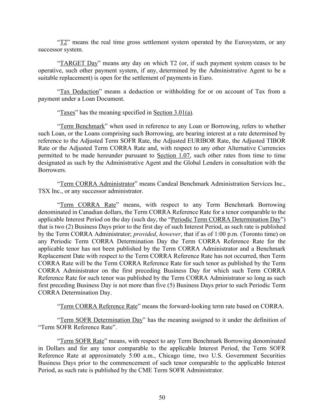 50 “T2” means the real time gross settlement system operated by the Eurosystem, or any successor system. “TARGET Day” means any day on which T2 (or, if such payment system ceases to be operative, such other payment system, if any, determined by the Administrative Agent to be a suitable replacement) is open for the settlement of payments in Euro. “Tax Deduction” means a deduction or withholding for or on account of Tax from a payment under a Loan Document. “Taxes” has the meaning specified in Section 3.01(a). “Term Benchmark” when used in reference to any Loan or Borrowing, refers to whether such Loan, or the Loans comprising such Borrowing, are bearing interest at a rate determined by reference to the Adjusted Term SOFR Rate, the Adjusted EURIBOR Rate, the Adjusted TIBOR Rate or the Adjusted Term CORRA Rate and, with respect to any other Alternative Currencies permitted to be made hereunder pursuant to Section 1.07, such other rates from time to time designated as such by the Administrative Agent and the Global Lenders in consultation with the Borrowers. “Term CORRA Administrator” means Candeal Benchmark Administration Services Inc., TSX Inc., or any successor administrator. “Term CORRA Rate” means, with respect to any Term Benchmark Borrowing denominated in Canadian dollars, the Term CORRA Reference Rate for a tenor comparable to the applicable Interest Period on the day (such day, the “Periodic Term CORRA Determination Day”) that is two (2) Business Days prior to the first day of such Interest Period, as such rate is published by the Term CORRA Administrator; provided, however, that if as of 1:00 p.m. (Toronto time) on any Periodic Term CORRA Determination Day the Term CORRA Reference Rate for the applicable tenor has not been published by the Term CORRA Administrator and a Benchmark Replacement Date with respect to the Term CORRA Reference Rate has not occurred, then Term CORRA Rate will be the Term CORRA Reference Rate for such tenor as published by the Term CORRA Administrator on the first preceding Business Day for which such Term CORRA Reference Rate for such tenor was published by the Term CORRA Administrator so long as such first preceding Business Day is not more than five (5) Business Days prior to such Periodic Term CORRA Determination Day. “Term CORRA Reference Rate” means the forward-looking term rate based on CORRA. “Term SOFR Determination Day” has the meaning assigned to it under the definition of “Term SOFR Reference Rate”. “Term SOFR Rate” means, with respect to any Term Benchmark Borrowing denominated in Dollars and for any tenor comparable to the applicable Interest Period, the Term SOFR Reference Rate at approximately 5:00 a.m., Chicago time, two U.S. Government Securities Business Days prior to the commencement of such tenor comparable to the applicable Interest Period, as such rate is published by the CME Term SOFR Administrator.
