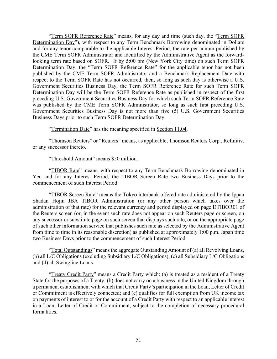 51 “Term SOFR Reference Rate” means, for any day and time (such day, the “Term SOFR Determination Day”), with respect to any Term Benchmark Borrowing denominated in Dollars and for any tenor comparable to the applicable Interest Period, the rate per annum published by the CME Term SOFR Administrator and identified by the Administrative Agent as the forward- looking term rate based on SOFR. If by 5:00 pm (New York City time) on such Term SOFR Determination Day, the “Term SOFR Reference Rate” for the applicable tenor has not been published by the CME Term SOFR Administrator and a Benchmark Replacement Date with respect to the Term SOFR Rate has not occurred, then, so long as such day is otherwise a U.S. Government Securities Business Day, the Term SOFR Reference Rate for such Term SOFR Determination Day will be the Term SOFR Reference Rate as published in respect of the first preceding U.S. Government Securities Business Day for which such Term SOFR Reference Rate was published by the CME Term SOFR Administrator, so long as such first preceding U.S. Government Securities Business Day is not more than five (5) U.S. Government Securities Business Days prior to such Term SOFR Determination Day. “Termination Date” has the meaning specified in Section 11.04. “Thomson Reuters” or “Reuters” means, as applicable, Thomson Reuters Corp., Refinitiv, or any successor thereto. “Threshold Amount” means $50 million. “TIBOR Rate” means, with respect to any Term Benchmark Borrowing denominated in Yen and for any Interest Period, the TIBOR Screen Rate two Business Days prior to the commencement of such Interest Period. “TIBOR Screen Rate” means the Tokyo interbank offered rate administered by the Ippan Shadan Hojin JBA TIBOR Administration (or any other person which takes over the administration of that rate) for the relevant currency and period displayed on page DTIBOR01 of the Reuters screen (or, in the event such rate does not appear on such Reuters page or screen, on any successor or substitute page on such screen that displays such rate, or on the appropriate page of such other information service that publishes such rate as selected by the Administrative Agent from time to time in its reasonable discretion) as published at approximately 1:00 p.m. Japan time two Business Days prior to the commencement of such Interest Period. “Total Outstandings” means the aggregate Outstanding Amount of (a) all Revolving Loans, (b) all L/C Obligations (excluding Subsidiary L/C Obligations), (c) all Subsidiary L/C Obligations and (d) all Swingline Loans. “Treaty Credit Party” means a Credit Party which: (a) is treated as a resident of a Treaty State for the purposes of a Treaty; (b) does not carry on a business in the United Kingdom through a permanent establishment with which that Credit Party’s participation in the Loan, Letter of Credit or Commitment is effectively connected; and (c) qualifies for full exemption from UK income tax on payments of interest to or for the account of a Credit Party with respect to an applicable interest in a Loan, Letter of Credit or Commitment, subject to the completion of necessary procedural formalities.