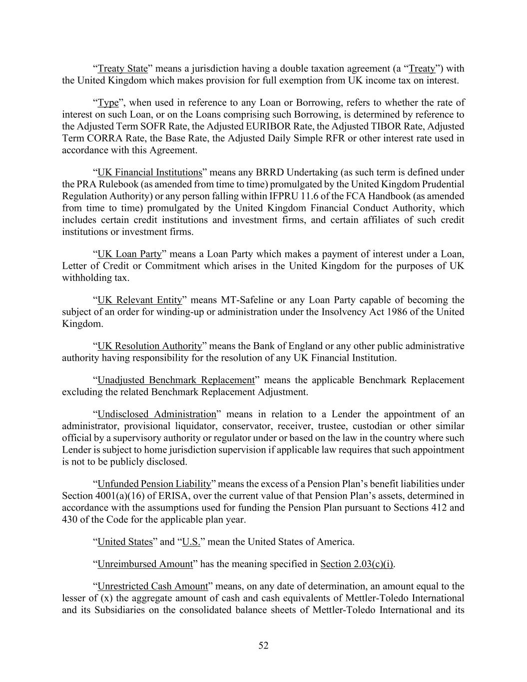 52 “Treaty State” means a jurisdiction having a double taxation agreement (a “Treaty”) with the United Kingdom which makes provision for full exemption from UK income tax on interest. “Type”, when used in reference to any Loan or Borrowing, refers to whether the rate of interest on such Loan, or on the Loans comprising such Borrowing, is determined by reference to the Adjusted Term SOFR Rate, the Adjusted EURIBOR Rate, the Adjusted TIBOR Rate, Adjusted Term CORRA Rate, the Base Rate, the Adjusted Daily Simple RFR or other interest rate used in accordance with this Agreement. “UK Financial Institutions” means any BRRD Undertaking (as such term is defined under the PRA Rulebook (as amended from time to time) promulgated by the United Kingdom Prudential Regulation Authority) or any person falling within IFPRU 11.6 of the FCA Handbook (as amended from time to time) promulgated by the United Kingdom Financial Conduct Authority, which includes certain credit institutions and investment firms, and certain affiliates of such credit institutions or investment firms. “UK Loan Party” means a Loan Party which makes a payment of interest under a Loan, Letter of Credit or Commitment which arises in the United Kingdom for the purposes of UK withholding tax. “UK Relevant Entity” means MT-Safeline or any Loan Party capable of becoming the subject of an order for winding-up or administration under the Insolvency Act 1986 of the United Kingdom. “UK Resolution Authority” means the Bank of England or any other public administrative authority having responsibility for the resolution of any UK Financial Institution. “Unadjusted Benchmark Replacement” means the applicable Benchmark Replacement excluding the related Benchmark Replacement Adjustment. “Undisclosed Administration” means in relation to a Lender the appointment of an administrator, provisional liquidator, conservator, receiver, trustee, custodian or other similar official by a supervisory authority or regulator under or based on the law in the country where such Lender is subject to home jurisdiction supervision if applicable law requires that such appointment is not to be publicly disclosed. “Unfunded Pension Liability” means the excess of a Pension Plan’s benefit liabilities under Section 4001(a)(16) of ERISA, over the current value of that Pension Plan’s assets, determined in accordance with the assumptions used for funding the Pension Plan pursuant to Sections 412 and 430 of the Code for the applicable plan year. “United States” and “U.S.” mean the United States of America. “Unreimbursed Amount” has the meaning specified in Section 2.03(c)(i). “Unrestricted Cash Amount” means, on any date of determination, an amount equal to the lesser of (x) the aggregate amount of cash and cash equivalents of Mettler-Toledo International and its Subsidiaries on the consolidated balance sheets of Mettler-Toledo International and its