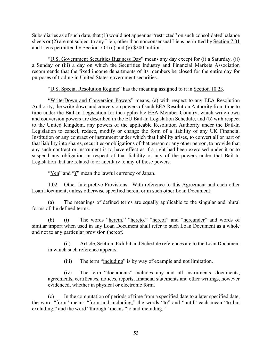 53 Subsidiaries as of such date, that (1) would not appear as “restricted” on such consolidated balance sheets or (2) are not subject to any Lien, other than nonconsensual Liens permitted by Section 7.01 and Liens permitted by Section 7.01(n) and (y) $200 million. “U.S. Government Securities Business Day” means any day except for (i) a Saturday, (ii) a Sunday or (iii) a day on which the Securities Industry and Financial Markets Association recommends that the fixed income departments of its members be closed for the entire day for purposes of trading in United States government securities. “U.S. Special Resolution Regime” has the meaning assigned to it in Section 10.23. “Write-Down and Conversion Powers” means, (a) with respect to any EEA Resolution Authority, the write-down and conversion powers of such EEA Resolution Authority from time to time under the Bail-In Legislation for the applicable EEA Member Country, which write-down and conversion powers are described in the EU Bail-In Legislation Schedule, and (b) with respect to the United Kingdom, any powers of the applicable Resolution Authority under the Bail-In Legislation to cancel, reduce, modify or change the form of a liability of any UK Financial Institution or any contract or instrument under which that liability arises, to convert all or part of that liability into shares, securities or obligations of that person or any other person, to provide that any such contract or instrument is to have effect as if a right had been exercised under it or to suspend any obligation in respect of that liability or any of the powers under that Bail-In Legislation that are related to or ancillary to any of those powers. “Yen” and “¥” mean the lawful currency of Japan. 1.02 Other Interpretive Provisions. With reference to this Agreement and each other Loan Document, unless otherwise specified herein or in such other Loan Document: (a) The meanings of defined terms are equally applicable to the singular and plural forms of the defined terms. (b) (i) The words “herein,” “hereto,” “hereof” and “hereunder” and words of similar import when used in any Loan Document shall refer to such Loan Document as a whole and not to any particular provision thereof. (ii) Article, Section, Exhibit and Schedule references are to the Loan Document in which such reference appears. (iii) The term “including” is by way of example and not limitation. (iv) The term “documents” includes any and all instruments, documents, agreements, certificates, notices, reports, financial statements and other writings, however evidenced, whether in physical or electronic form. (c) In the computation of periods of time from a specified date to a later specified date, the word “from” means “from and including;” the words “to” and “until” each mean “to but excluding;” and the word “through” means “to and including.”