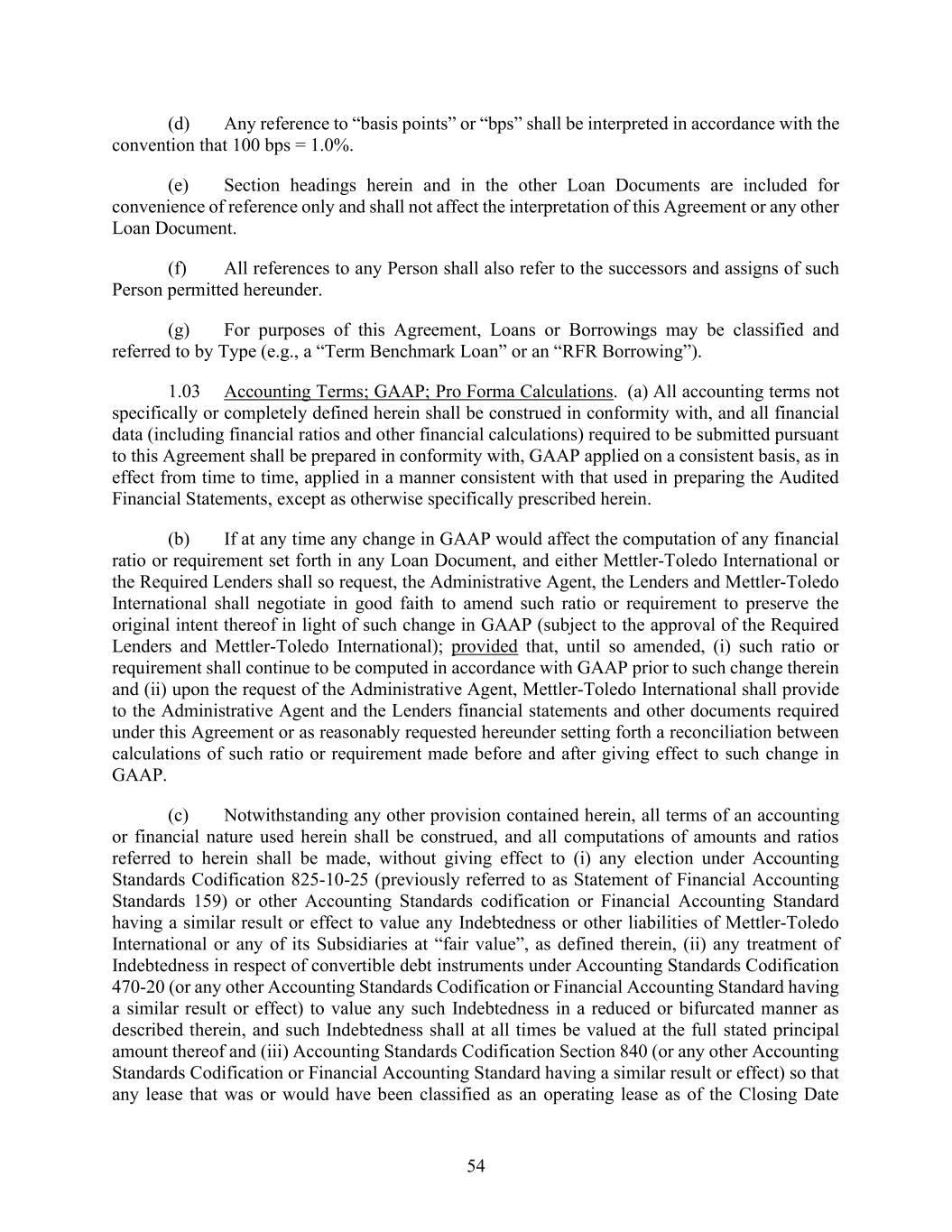 54 (d) Any reference to “basis points” or “bps” shall be interpreted in accordance with the convention that 100 bps = 1.0%. (e) Section headings herein and in the other Loan Documents are included for convenience of reference only and shall not affect the interpretation of this Agreement or any other Loan Document. (f) All references to any Person shall also refer to the successors and assigns of such Person permitted hereunder. (g) For purposes of this Agreement, Loans or Borrowings may be classified and referred to by Type (e.g., a “Term Benchmark Loan” or an “RFR Borrowing”). 1.03 Accounting Terms; GAAP; Pro Forma Calculations. (a) All accounting terms not specifically or completely defined herein shall be construed in conformity with, and all financial data (including financial ratios and other financial calculations) required to be submitted pursuant to this Agreement shall be prepared in conformity with, GAAP applied on a consistent basis, as in effect from time to time, applied in a manner consistent with that used in preparing the Audited Financial Statements, except as otherwise specifically prescribed herein. (b) If at any time any change in GAAP would affect the computation of any financial ratio or requirement set forth in any Loan Document, and either Mettler-Toledo International or the Required Lenders shall so request, the Administrative Agent, the Lenders and Mettler-Toledo International shall negotiate in good faith to amend such ratio or requirement to preserve the original intent thereof in light of such change in GAAP (subject to the approval of the Required Lenders and Mettler-Toledo International); provided that, until so amended, (i) such ratio or requirement shall continue to be computed in accordance with GAAP prior to such change therein and (ii) upon the request of the Administrative Agent, Mettler-Toledo International shall provide to the Administrative Agent and the Lenders financial statements and other documents required under this Agreement or as reasonably requested hereunder setting forth a reconciliation between calculations of such ratio or requirement made before and after giving effect to such change in GAAP. (c) Notwithstanding any other provision contained herein, all terms of an accounting or financial nature used herein shall be construed, and all computations of amounts and ratios referred to herein shall be made, without giving effect to (i) any election under Accounting Standards Codification 825-10-25 (previously referred to as Statement of Financial Accounting Standards 159) or other Accounting Standards codification or Financial Accounting Standard having a similar result or effect to value any Indebtedness or other liabilities of Mettler-Toledo International or any of its Subsidiaries at “fair value”, as defined therein, (ii) any treatment of Indebtedness in respect of convertible debt instruments under Accounting Standards Codification 470-20 (or any other Accounting Standards Codification or Financial Accounting Standard having a similar result or effect) to value any such Indebtedness in a reduced or bifurcated manner as described therein, and such Indebtedness shall at all times be valued at the full stated principal amount thereof and (iii) Accounting Standards Codification Section 840 (or any other Accounting Standards Codification or Financial Accounting Standard having a similar result or effect) so that any lease that was or would have been classified as an operating lease as of the Closing Date