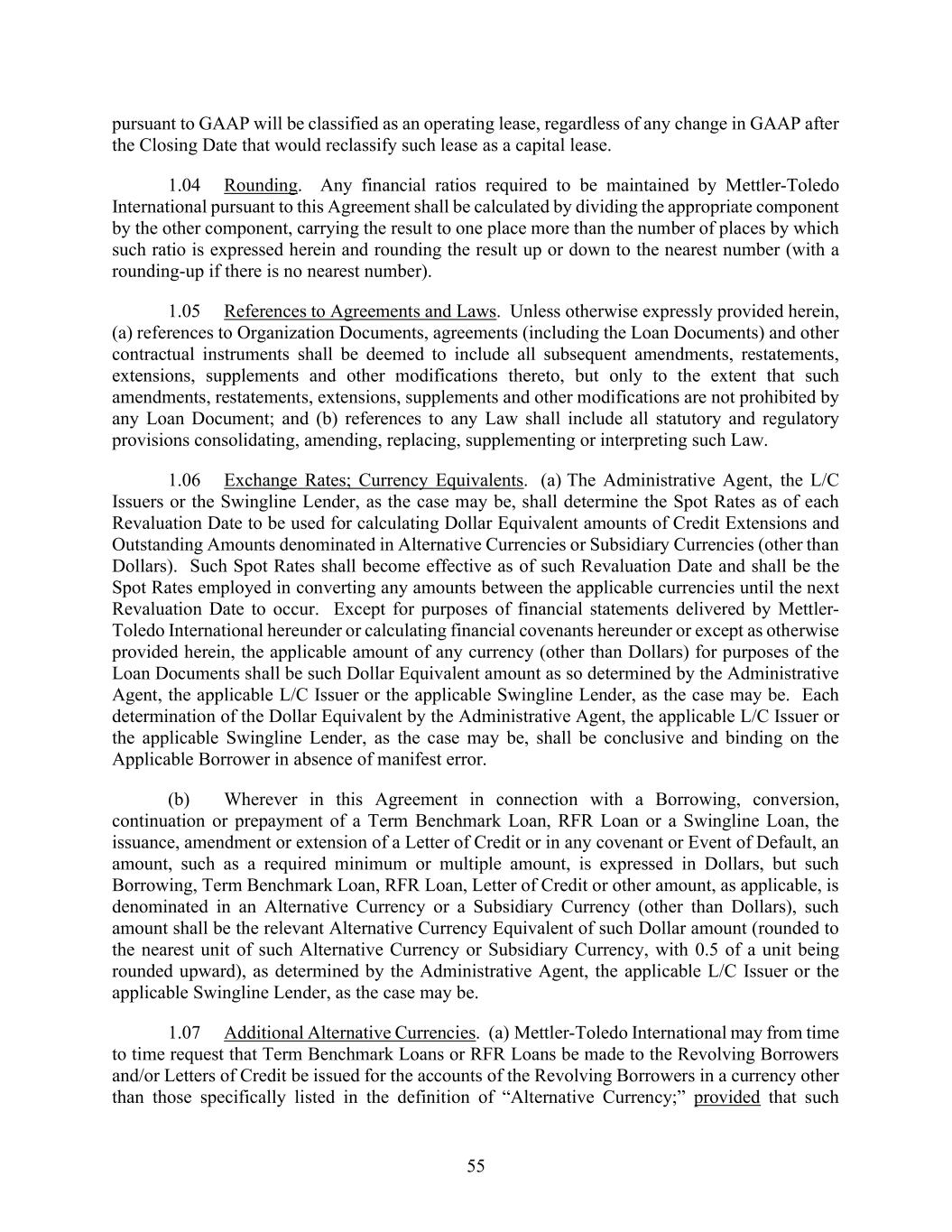 55 pursuant to GAAP will be classified as an operating lease, regardless of any change in GAAP after the Closing Date that would reclassify such lease as a capital lease. 1.04 Rounding. Any financial ratios required to be maintained by Mettler-Toledo International pursuant to this Agreement shall be calculated by dividing the appropriate component by the other component, carrying the result to one place more than the number of places by which such ratio is expressed herein and rounding the result up or down to the nearest number (with a rounding-up if there is no nearest number). 1.05 References to Agreements and Laws. Unless otherwise expressly provided herein, (a) references to Organization Documents, agreements (including the Loan Documents) and other contractual instruments shall be deemed to include all subsequent amendments, restatements, extensions, supplements and other modifications thereto, but only to the extent that such amendments, restatements, extensions, supplements and other modifications are not prohibited by any Loan Document; and (b) references to any Law shall include all statutory and regulatory provisions consolidating, amending, replacing, supplementing or interpreting such Law. 1.06 Exchange Rates; Currency Equivalents. (a) The Administrative Agent, the L/C Issuers or the Swingline Lender, as the case may be, shall determine the Spot Rates as of each Revaluation Date to be used for calculating Dollar Equivalent amounts of Credit Extensions and Outstanding Amounts denominated in Alternative Currencies or Subsidiary Currencies (other than Dollars). Such Spot Rates shall become effective as of such Revaluation Date and shall be the Spot Rates employed in converting any amounts between the applicable currencies until the next Revaluation Date to occur. Except for purposes of financial statements delivered by Mettler- Toledo International hereunder or calculating financial covenants hereunder or except as otherwise provided herein, the applicable amount of any currency (other than Dollars) for purposes of the Loan Documents shall be such Dollar Equivalent amount as so determined by the Administrative Agent, the applicable L/C Issuer or the applicable Swingline Lender, as the case may be. Each determination of the Dollar Equivalent by the Administrative Agent, the applicable L/C Issuer or the applicable Swingline Lender, as the case may be, shall be conclusive and binding on the Applicable Borrower in absence of manifest error. (b) Wherever in this Agreement in connection with a Borrowing, conversion, continuation or prepayment of a Term Benchmark Loan, RFR Loan or a Swingline Loan, the issuance, amendment or extension of a Letter of Credit or in any covenant or Event of Default, an amount, such as a required minimum or multiple amount, is expressed in Dollars, but such Borrowing, Term Benchmark Loan, RFR Loan, Letter of Credit or other amount, as applicable, is denominated in an Alternative Currency or a Subsidiary Currency (other than Dollars), such amount shall be the relevant Alternative Currency Equivalent of such Dollar amount (rounded to the nearest unit of such Alternative Currency or Subsidiary Currency, with 0.5 of a unit being rounded upward), as determined by the Administrative Agent, the applicable L/C Issuer or the applicable Swingline Lender, as the case may be. 1.07 Additional Alternative Currencies. (a) Mettler-Toledo International may from time to time request that Term Benchmark Loans or RFR Loans be made to the Revolving Borrowers and/or Letters of Credit be issued for the accounts of the Revolving Borrowers in a currency other than those specifically listed in the definition of “Alternative Currency;” provided that such