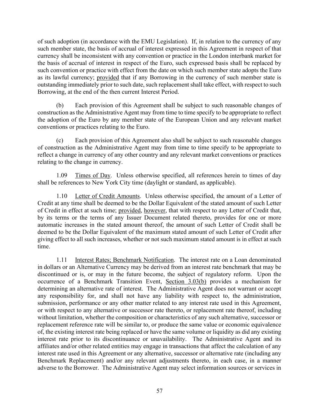 57 of such adoption (in accordance with the EMU Legislation). If, in relation to the currency of any such member state, the basis of accrual of interest expressed in this Agreement in respect of that currency shall be inconsistent with any convention or practice in the London interbank market for the basis of accrual of interest in respect of the Euro, such expressed basis shall be replaced by such convention or practice with effect from the date on which such member state adopts the Euro as its lawful currency; provided that if any Borrowing in the currency of such member state is outstanding immediately prior to such date, such replacement shall take effect, with respect to such Borrowing, at the end of the then current Interest Period. (b) Each provision of this Agreement shall be subject to such reasonable changes of construction as the Administrative Agent may from time to time specify to be appropriate to reflect the adoption of the Euro by any member state of the European Union and any relevant market conventions or practices relating to the Euro. (c) Each provision of this Agreement also shall be subject to such reasonable changes of construction as the Administrative Agent may from time to time specify to be appropriate to reflect a change in currency of any other country and any relevant market conventions or practices relating to the change in currency. 1.09 Times of Day. Unless otherwise specified, all references herein to times of day shall be references to New York City time (daylight or standard, as applicable). 1.10 Letter of Credit Amounts. Unless otherwise specified, the amount of a Letter of Credit at any time shall be deemed to be the Dollar Equivalent of the stated amount of such Letter of Credit in effect at such time; provided, however, that with respect to any Letter of Credit that, by its terms or the terms of any Issuer Document related thereto, provides for one or more automatic increases in the stated amount thereof, the amount of such Letter of Credit shall be deemed to be the Dollar Equivalent of the maximum stated amount of such Letter of Credit after giving effect to all such increases, whether or not such maximum stated amount is in effect at such time. 1.11 Interest Rates; Benchmark Notification. The interest rate on a Loan denominated in dollars or an Alternative Currency may be derived from an interest rate benchmark that may be discontinued or is, or may in the future become, the subject of regulatory reform. Upon the occurrence of a Benchmark Transition Event, Section 3.03(b) provides a mechanism for determining an alternative rate of interest. The Administrative Agent does not warrant or accept any responsibility for, and shall not have any liability with respect to, the administration, submission, performance or any other matter related to any interest rate used in this Agreement, or with respect to any alternative or successor rate thereto, or replacement rate thereof, including without limitation, whether the composition or characteristics of any such alternative, successor or replacement reference rate will be similar to, or produce the same value or economic equivalence of, the existing interest rate being replaced or have the same volume or liquidity as did any existing interest rate prior to its discontinuance or unavailability. The Administrative Agent and its affiliates and/or other related entities may engage in transactions that affect the calculation of any interest rate used in this Agreement or any alternative, successor or alternative rate (including any Benchmark Replacement) and/or any relevant adjustments thereto, in each case, in a manner adverse to the Borrower. The Administrative Agent may select information sources or services in