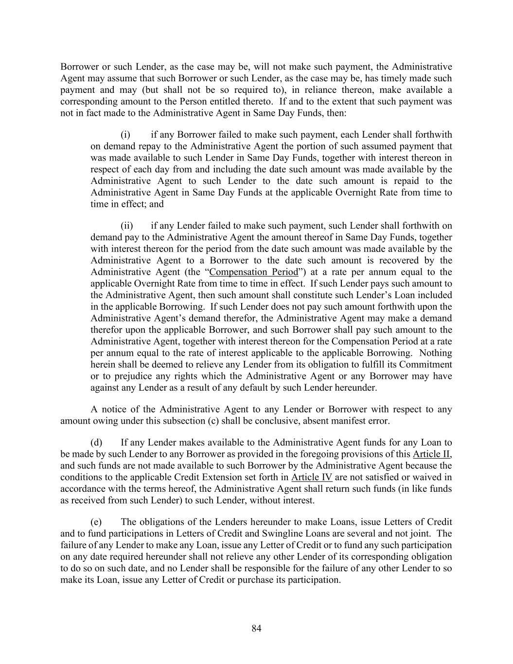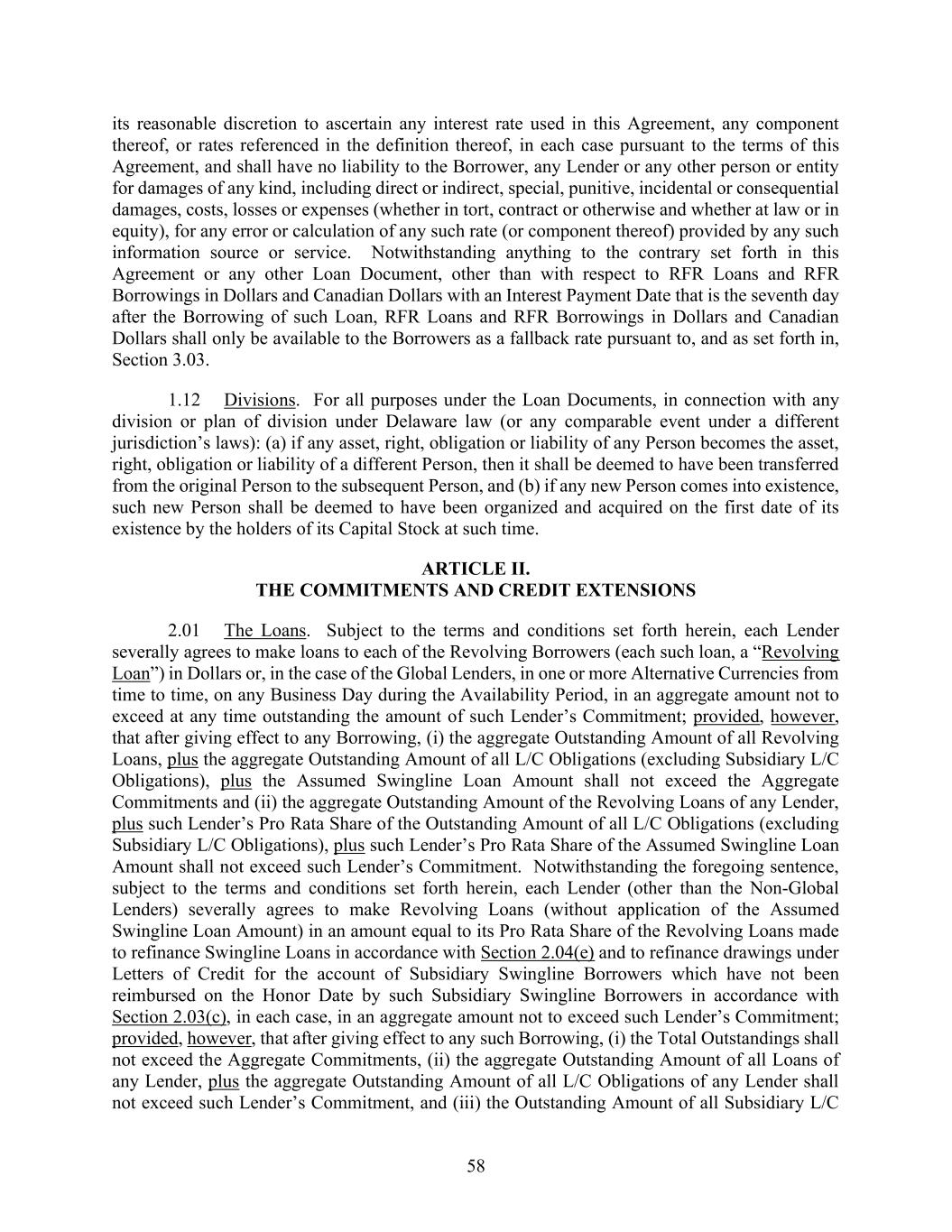 58 its reasonable discretion to ascertain any interest rate used in this Agreement, any component thereof, or rates referenced in the definition thereof, in each case pursuant to the terms of this Agreement, and shall have no liability to the Borrower, any Lender or any other person or entity for damages of any kind, including direct or indirect, special, punitive, incidental or consequential damages, costs, losses or expenses (whether in tort, contract or otherwise and whether at law or in equity), for any error or calculation of any such rate (or component thereof) provided by any such information source or service. Notwithstanding anything to the contrary set forth in this Agreement or any other Loan Document, other than with respect to RFR Loans and RFR Borrowings in Dollars and Canadian Dollars with an Interest Payment Date that is the seventh day after the Borrowing of such Loan, RFR Loans and RFR Borrowings in Dollars and Canadian Dollars shall only be available to the Borrowers as a fallback rate pursuant to, and as set forth in, Section 3.03. 1.12 Divisions. For all purposes under the Loan Documents, in connection with any division or plan of division under Delaware law (or any comparable event under a different jurisdiction’s laws): (a) if any asset, right, obligation or liability of any Person becomes the asset, right, obligation or liability of a different Person, then it shall be deemed to have been transferred from the original Person to the subsequent Person, and (b) if any new Person comes into existence, such new Person shall be deemed to have been organized and acquired on the first date of its existence by the holders of its Capital Stock at such time. ARTICLE II. THE COMMITMENTS AND CREDIT EXTENSIONS 2.01 The Loans. Subject to the terms and conditions set forth herein, each Lender severally agrees to make loans to each of the Revolving Borrowers (each such loan, a “Revolving Loan”) in Dollars or, in the case of the Global Lenders, in one or more Alternative Currencies from time to time, on any Business Day during the Availability Period, in an aggregate amount not to exceed at any time outstanding the amount of such Lender’s Commitment; provided, however, that after giving effect to any Borrowing, (i) the aggregate Outstanding Amount of all Revolving Loans, plus the aggregate Outstanding Amount of all L/C Obligations (excluding Subsidiary L/C Obligations), plus the Assumed Swingline Loan Amount shall not exceed the Aggregate Commitments and (ii) the aggregate Outstanding Amount of the Revolving Loans of any Lender, plus such Lender’s Pro Rata Share of the Outstanding Amount of all L/C Obligations (excluding Subsidiary L/C Obligations), plus such Lender’s Pro Rata Share of the Assumed Swingline Loan Amount shall not exceed such Lender’s Commitment. Notwithstanding the foregoing sentence, subject to the terms and conditions set forth herein, each Lender (other than the Non-Global Lenders) severally agrees to make Revolving Loans (without application of the Assumed Swingline Loan Amount) in an amount equal to its Pro Rata Share of the Revolving Loans made to refinance Swingline Loans in accordance with Section 2.04(e) and to refinance drawings under Letters of Credit for the account of Subsidiary Swingline Borrowers which have not been reimbursed on the Honor Date by such Subsidiary Swingline Borrowers in accordance with Section 2.03(c), in each case, in an aggregate amount not to exceed such Lender’s Commitment; provided, however, that after giving effect to any such Borrowing, (i) the Total Outstandings shall not exceed the Aggregate Commitments, (ii) the aggregate Outstanding Amount of all Loans of any Lender, plus the aggregate Outstanding Amount of all L/C Obligations of any Lender shall not exceed such Lender’s Commitment, and (iii) the Outstanding Amount of all Subsidiary L/C