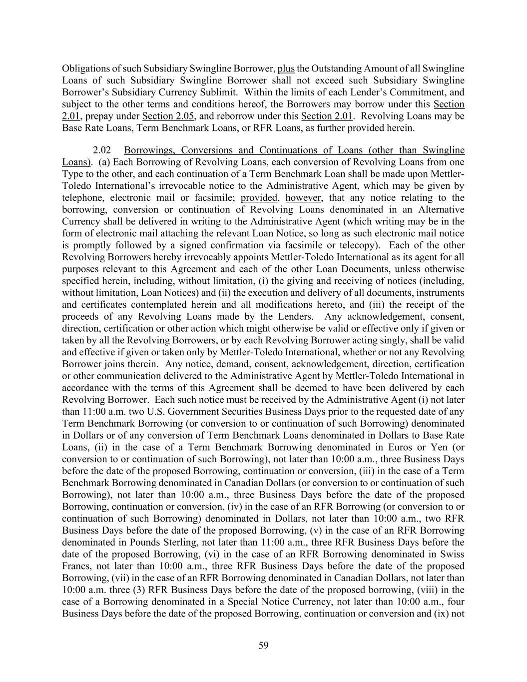 59 Obligations of such Subsidiary Swingline Borrower, plus the Outstanding Amount of all Swingline Loans of such Subsidiary Swingline Borrower shall not exceed such Subsidiary Swingline Borrower’s Subsidiary Currency Sublimit. Within the limits of each Lender’s Commitment, and subject to the other terms and conditions hereof, the Borrowers may borrow under this Section 2.01, prepay under Section 2.05, and reborrow under this Section 2.01. Revolving Loans may be Base Rate Loans, Term Benchmark Loans, or RFR Loans, as further provided herein. 2.02 Borrowings, Conversions and Continuations of Loans (other than Swingline Loans). (a) Each Borrowing of Revolving Loans, each conversion of Revolving Loans from one Type to the other, and each continuation of a Term Benchmark Loan shall be made upon Mettler- Toledo International’s irrevocable notice to the Administrative Agent, which may be given by telephone, electronic mail or facsimile; provided, however, that any notice relating to the borrowing, conversion or continuation of Revolving Loans denominated in an Alternative Currency shall be delivered in writing to the Administrative Agent (which writing may be in the form of electronic mail attaching the relevant Loan Notice, so long as such electronic mail notice is promptly followed by a signed confirmation via facsimile or telecopy). Each of the other Revolving Borrowers hereby irrevocably appoints Mettler-Toledo International as its agent for all purposes relevant to this Agreement and each of the other Loan Documents, unless otherwise specified herein, including, without limitation, (i) the giving and receiving of notices (including, without limitation, Loan Notices) and (ii) the execution and delivery of all documents, instruments and certificates contemplated herein and all modifications hereto, and (iii) the receipt of the proceeds of any Revolving Loans made by the Lenders. Any acknowledgement, consent, direction, certification or other action which might otherwise be valid or effective only if given or taken by all the Revolving Borrowers, or by each Revolving Borrower acting singly, shall be valid and effective if given or taken only by Mettler-Toledo International, whether or not any Revolving Borrower joins therein. Any notice, demand, consent, acknowledgement, direction, certification or other communication delivered to the Administrative Agent by Mettler-Toledo International in accordance with the terms of this Agreement shall be deemed to have been delivered by each Revolving Borrower. Each such notice must be received by the Administrative Agent (i) not later than 11:00 a.m. two U.S. Government Securities Business Days prior to the requested date of any Term Benchmark Borrowing (or conversion to or continuation of such Borrowing) denominated in Dollars or of any conversion of Term Benchmark Loans denominated in Dollars to Base Rate Loans, (ii) in the case of a Term Benchmark Borrowing denominated in Euros or Yen (or conversion to or continuation of such Borrowing), not later than 10:00 a.m., three Business Days before the date of the proposed Borrowing, continuation or conversion, (iii) in the case of a Term Benchmark Borrowing denominated in Canadian Dollars (or conversion to or continuation of such Borrowing), not later than 10:00 a.m., three Business Days before the date of the proposed Borrowing, continuation or conversion, (iv) in the case of an RFR Borrowing (or conversion to or continuation of such Borrowing) denominated in Dollars, not later than 10:00 a.m., two RFR Business Days before the date of the proposed Borrowing, (v) in the case of an RFR Borrowing denominated in Pounds Sterling, not later than 11:00 a.m., three RFR Business Days before the date of the proposed Borrowing, (vi) in the case of an RFR Borrowing denominated in Swiss Francs, not later than 10:00 a.m., three RFR Business Days before the date of the proposed Borrowing, (vii) in the case of an RFR Borrowing denominated in Canadian Dollars, not later than 10:00 a.m. three (3) RFR Business Days before the date of the proposed borrowing, (viii) in the case of a Borrowing denominated in a Special Notice Currency, not later than 10:00 a.m., four Business Days before the date of the proposed Borrowing, continuation or conversion and (ix) not