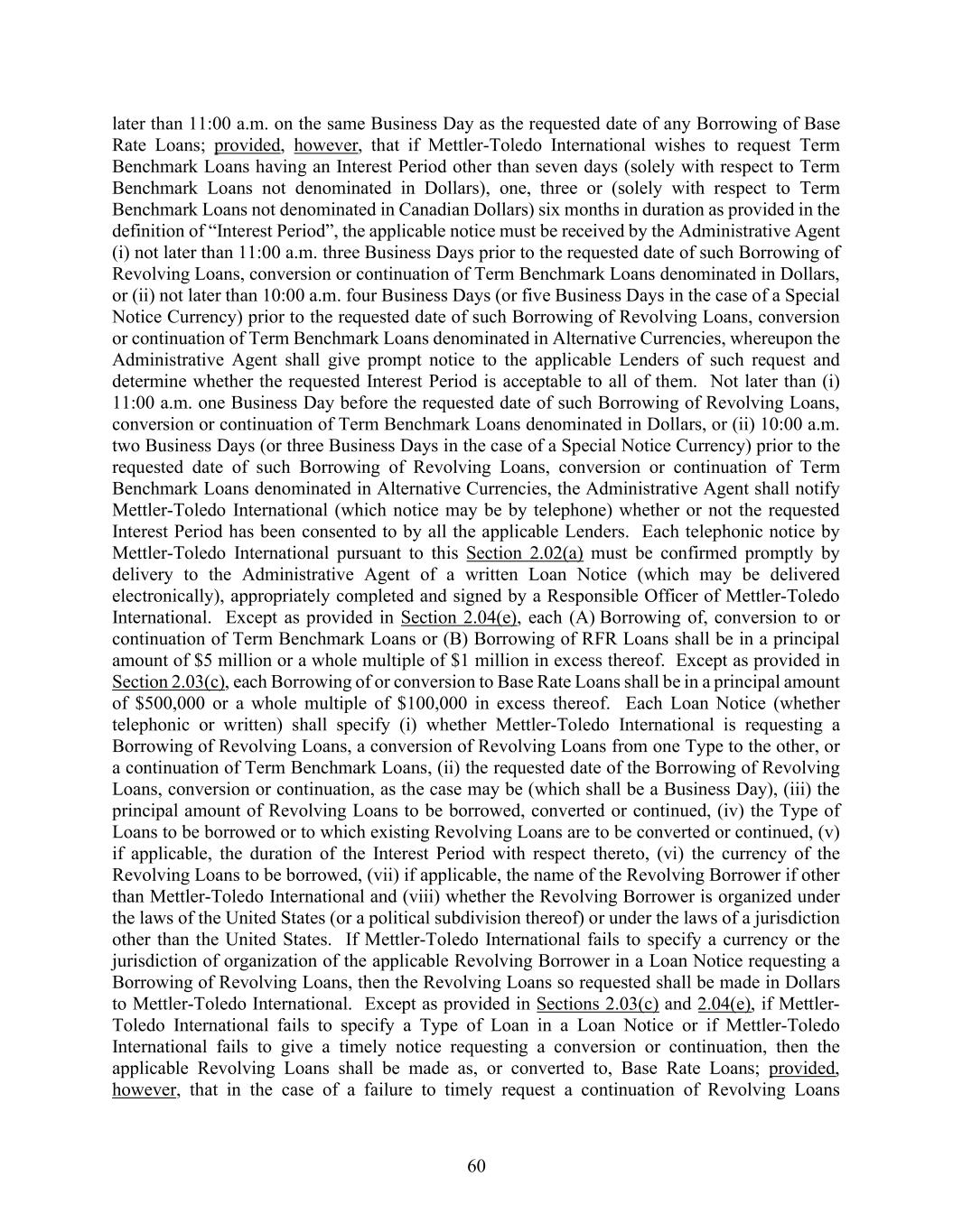 60 later than 11:00 a.m. on the same Business Day as the requested date of any Borrowing of Base Rate Loans; provided, however, that if Mettler-Toledo International wishes to request Term Benchmark Loans having an Interest Period other than seven days (solely with respect to Term Benchmark Loans not denominated in Dollars), one, three or (solely with respect to Term Benchmark Loans not denominated in Canadian Dollars) six months in duration as provided in the definition of “Interest Period”, the applicable notice must be received by the Administrative Agent (i) not later than 11:00 a.m. three Business Days prior to the requested date of such Borrowing of Revolving Loans, conversion or continuation of Term Benchmark Loans denominated in Dollars, or (ii) not later than 10:00 a.m. four Business Days (or five Business Days in the case of a Special Notice Currency) prior to the requested date of such Borrowing of Revolving Loans, conversion or continuation of Term Benchmark Loans denominated in Alternative Currencies, whereupon the Administrative Agent shall give prompt notice to the applicable Lenders of such request and determine whether the requested Interest Period is acceptable to all of them. Not later than (i) 11:00 a.m. one Business Day before the requested date of such Borrowing of Revolving Loans, conversion or continuation of Term Benchmark Loans denominated in Dollars, or (ii) 10:00 a.m. two Business Days (or three Business Days in the case of a Special Notice Currency) prior to the requested date of such Borrowing of Revolving Loans, conversion or continuation of Term Benchmark Loans denominated in Alternative Currencies, the Administrative Agent shall notify Mettler-Toledo International (which notice may be by telephone) whether or not the requested Interest Period has been consented to by all the applicable Lenders. Each telephonic notice by Mettler-Toledo International pursuant to this Section 2.02(a) must be confirmed promptly by delivery to the Administrative Agent of a written Loan Notice (which may be delivered electronically), appropriately completed and signed by a Responsible Officer of Mettler-Toledo International. Except as provided in Section 2.04(e), each (A) Borrowing of, conversion to or continuation of Term Benchmark Loans or (B) Borrowing of RFR Loans shall be in a principal amount of $5 million or a whole multiple of $1 million in excess thereof. Except as provided in Section 2.03(c), each Borrowing of or conversion to Base Rate Loans shall be in a principal amount of $500,000 or a whole multiple of $100,000 in excess thereof. Each Loan Notice (whether telephonic or written) shall specify (i) whether Mettler-Toledo International is requesting a Borrowing of Revolving Loans, a conversion of Revolving Loans from one Type to the other, or a continuation of Term Benchmark Loans, (ii) the requested date of the Borrowing of Revolving Loans, conversion or continuation, as the case may be (which shall be a Business Day), (iii) the principal amount of Revolving Loans to be borrowed, converted or continued, (iv) the Type of Loans to be borrowed or to which existing Revolving Loans are to be converted or continued, (v) if applicable, the duration of the Interest Period with respect thereto, (vi) the currency of the Revolving Loans to be borrowed, (vii) if applicable, the name of the Revolving Borrower if other than Mettler-Toledo International and (viii) whether the Revolving Borrower is organized under the laws of the United States (or a political subdivision thereof) or under the laws of a jurisdiction other than the United States. If Mettler-Toledo International fails to specify a currency or the jurisdiction of organization of the applicable Revolving Borrower in a Loan Notice requesting a Borrowing of Revolving Loans, then the Revolving Loans so requested shall be made in Dollars to Mettler-Toledo International. Except as provided in Sections 2.03(c) and 2.04(e), if Mettler- Toledo International fails to specify a Type of Loan in a Loan Notice or if Mettler-Toledo International fails to give a timely notice requesting a conversion or continuation, then the applicable Revolving Loans shall be made as, or converted to, Base Rate Loans; provided, however, that in the case of a failure to timely request a continuation of Revolving Loans