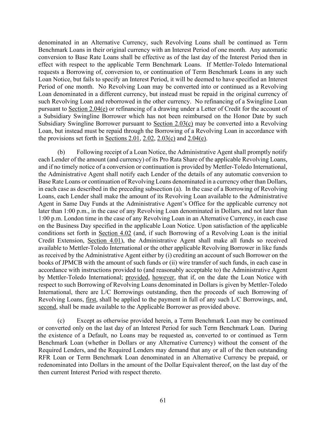 61 denominated in an Alternative Currency, such Revolving Loans shall be continued as Term Benchmark Loans in their original currency with an Interest Period of one month. Any automatic conversion to Base Rate Loans shall be effective as of the last day of the Interest Period then in effect with respect to the applicable Term Benchmark Loans. If Mettler-Toledo International requests a Borrowing of, conversion to, or continuation of Term Benchmark Loans in any such Loan Notice, but fails to specify an Interest Period, it will be deemed to have specified an Interest Period of one month. No Revolving Loan may be converted into or continued as a Revolving Loan denominated in a different currency, but instead must be repaid in the original currency of such Revolving Loan and reborrowed in the other currency. No refinancing of a Swingline Loan pursuant to Section 2.04(e) or refinancing of a drawing under a Letter of Credit for the account of a Subsidiary Swingline Borrower which has not been reimbursed on the Honor Date by such Subsidiary Swingline Borrower pursuant to Section 2.03(c) may be converted into a Revolving Loan, but instead must be repaid through the Borrowing of a Revolving Loan in accordance with the provisions set forth in Sections 2.01, 2.02, 2.03(c) and 2.04(e). (b) Following receipt of a Loan Notice, the Administrative Agent shall promptly notify each Lender of the amount (and currency) of its Pro Rata Share of the applicable Revolving Loans, and if no timely notice of a conversion or continuation is provided by Mettler-Toledo International, the Administrative Agent shall notify each Lender of the details of any automatic conversion to Base Rate Loans or continuation of Revolving Loans denominated in a currency other than Dollars, in each case as described in the preceding subsection (a). In the case of a Borrowing of Revolving Loans, each Lender shall make the amount of its Revolving Loan available to the Administrative Agent in Same Day Funds at the Administrative Agent’s Office for the applicable currency not later than 1:00 p.m., in the case of any Revolving Loan denominated in Dollars, and not later than 1:00 p.m. London time in the case of any Revolving Loan in an Alternative Currency, in each case on the Business Day specified in the applicable Loan Notice. Upon satisfaction of the applicable conditions set forth in Section 4.02 (and, if such Borrowing of a Revolving Loan is the initial Credit Extension, Section 4.01), the Administrative Agent shall make all funds so received available to Mettler-Toledo International or the other applicable Revolving Borrower in like funds as received by the Administrative Agent either by (i) crediting an account of such Borrower on the books of JPMCB with the amount of such funds or (ii) wire transfer of such funds, in each case in accordance with instructions provided to (and reasonably acceptable to) the Administrative Agent by Mettler-Toledo International; provided, however, that if, on the date the Loan Notice with respect to such Borrowing of Revolving Loans denominated in Dollars is given by Mettler-Toledo International, there are L/C Borrowings outstanding, then the proceeds of such Borrowing of Revolving Loans, first, shall be applied to the payment in full of any such L/C Borrowings, and, second, shall be made available to the Applicable Borrower as provided above. (c) Except as otherwise provided herein, a Term Benchmark Loan may be continued or converted only on the last day of an Interest Period for such Term Benchmark Loan. During the existence of a Default, no Loans may be requested as, converted to or continued as Term Benchmark Loan (whether in Dollars or any Alternative Currency) without the consent of the Required Lenders, and the Required Lenders may demand that any or all of the then outstanding RFR Loan or Term Benchmark Loan denominated in an Alternative Currency be prepaid, or redenominated into Dollars in the amount of the Dollar Equivalent thereof, on the last day of the then current Interest Period with respect thereto.