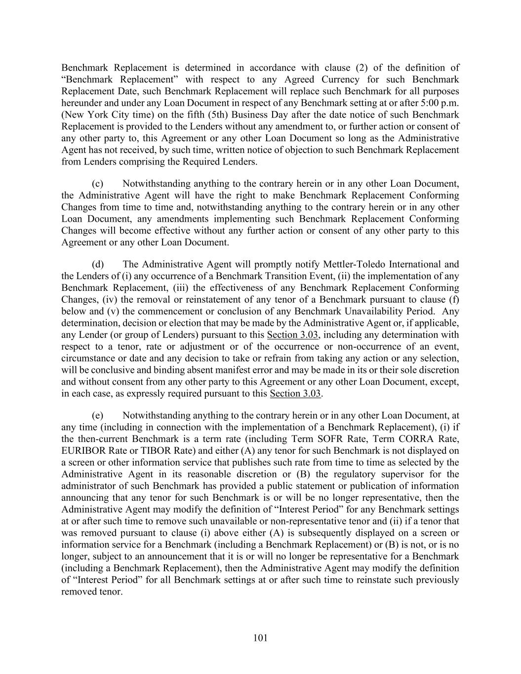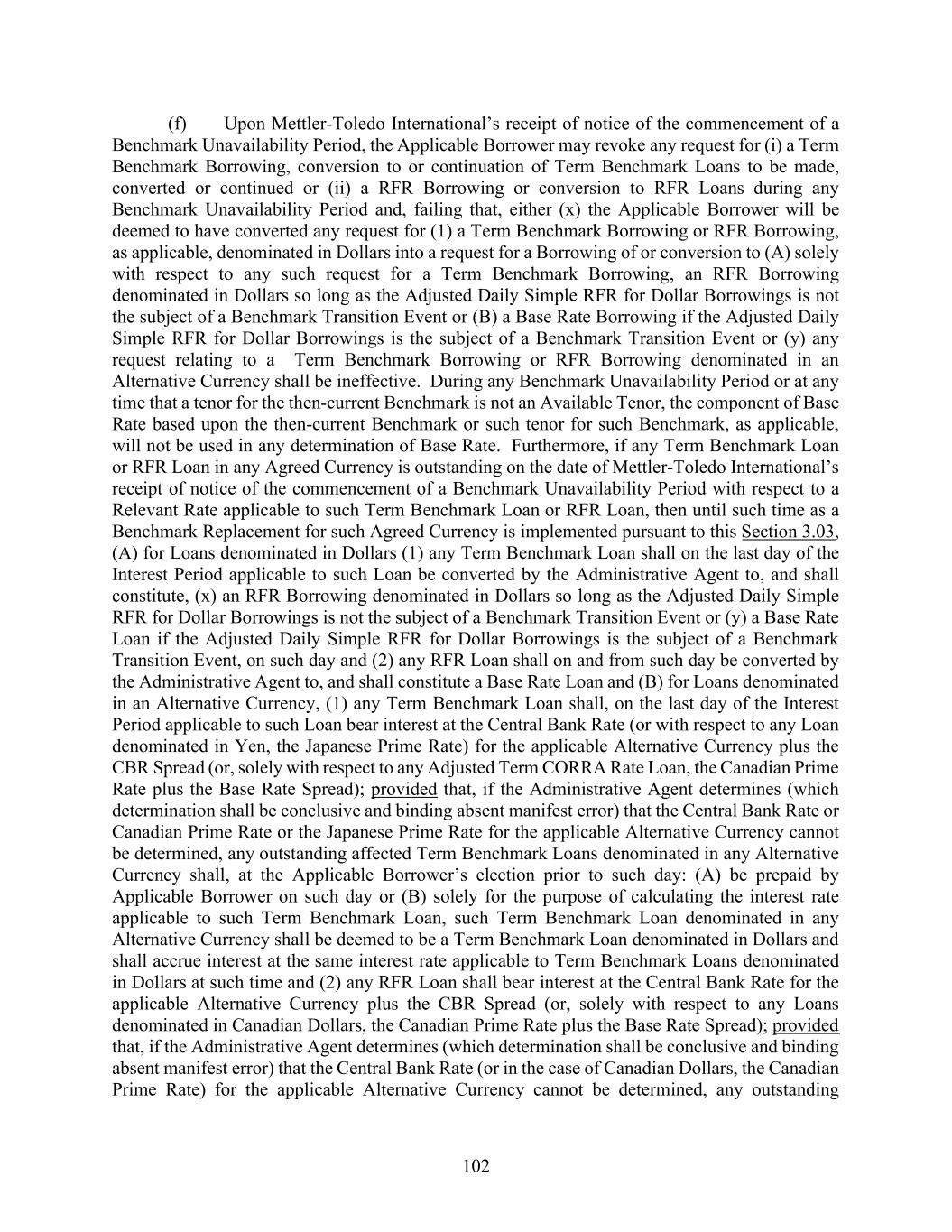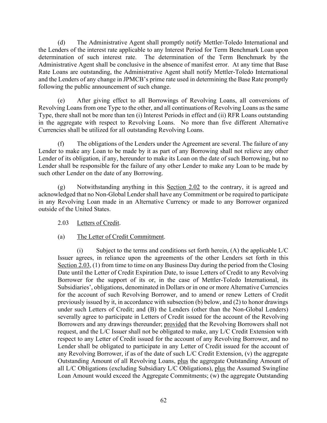 62 (d) The Administrative Agent shall promptly notify Mettler-Toledo International and the Lenders of the interest rate applicable to any Interest Period for Term Benchmark Loan upon determination of such interest rate. The determination of the Term Benchmark by the Administrative Agent shall be conclusive in the absence of manifest error. At any time that Base Rate Loans are outstanding, the Administrative Agent shall notify Mettler-Toledo International and the Lenders of any change in JPMCB’s prime rate used in determining the Base Rate promptly following the public announcement of such change. (e) After giving effect to all Borrowings of Revolving Loans, all conversions of Revolving Loans from one Type to the other, and all continuations of Revolving Loans as the same Type, there shall not be more than ten (i) Interest Periods in effect and (ii) RFR Loans outstanding in the aggregate with respect to Revolving Loans. No more than five different Alternative Currencies shall be utilized for all outstanding Revolving Loans. (f) The obligations of the Lenders under the Agreement are several. The failure of any Lender to make any Loan to be made by it as part of any Borrowing shall not relieve any other Lender of its obligation, if any, hereunder to make its Loan on the date of such Borrowing, but no Lender shall be responsible for the failure of any other Lender to make any Loan to be made by such other Lender on the date of any Borrowing. (g) Notwithstanding anything in this Section 2.02 to the contrary, it is agreed and acknowledged that no Non-Global Lender shall have any Commitment or be required to participate in any Revolving Loan made in an Alternative Currency or made to any Borrower organized outside of the United States. 2.03 Letters of Credit. (a) The Letter of Credit Commitment. (i) Subject to the terms and conditions set forth herein, (A) the applicable L/C Issuer agrees, in reliance upon the agreements of the other Lenders set forth in this Section 2.03, (1) from time to time on any Business Day during the period from the Closing Date until the Letter of Credit Expiration Date, to issue Letters of Credit to any Revolving Borrower for the support of its or, in the case of Mettler-Toledo International, its Subsidiaries’, obligations, denominated in Dollars or in one or more Alternative Currencies for the account of such Revolving Borrower, and to amend or renew Letters of Credit previously issued by it, in accordance with subsection (b) below, and (2) to honor drawings under such Letters of Credit; and (B) the Lenders (other than the Non-Global Lenders) severally agree to participate in Letters of Credit issued for the account of the Revolving Borrowers and any drawings thereunder; provided that the Revolving Borrowers shall not request, and the L/C Issuer shall not be obligated to make, any L/C Credit Extension with respect to any Letter of Credit issued for the account of any Revolving Borrower, and no Lender shall be obligated to participate in any Letter of Credit issued for the account of any Revolving Borrower, if as of the date of such L/C Credit Extension, (v) the aggregate Outstanding Amount of all Revolving Loans, plus the aggregate Outstanding Amount of all L/C Obligations (excluding Subsidiary L/C Obligations), plus the Assumed Swingline Loan Amount would exceed the Aggregate Commitments; (w) the aggregate Outstanding