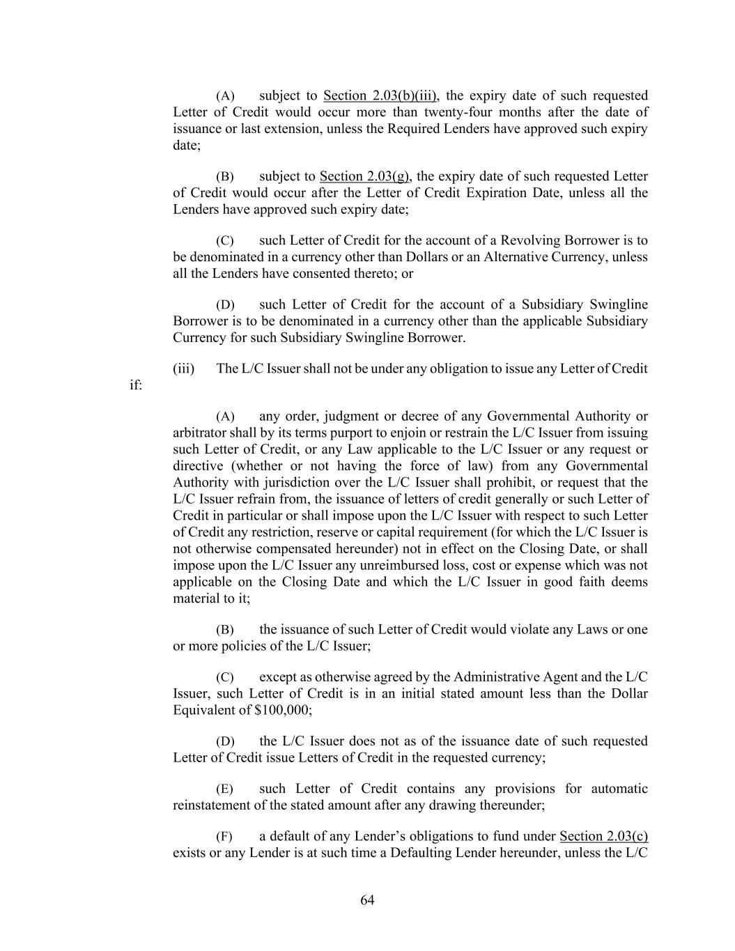 64 (A) subject to Section 2.03(b)(iii), the expiry date of such requested Letter of Credit would occur more than twenty-four months after the date of issuance or last extension, unless the Required Lenders have approved such expiry date; (B) subject to Section 2.03(g), the expiry date of such requested Letter of Credit would occur after the Letter of Credit Expiration Date, unless all the Lenders have approved such expiry date; (C) such Letter of Credit for the account of a Revolving Borrower is to be denominated in a currency other than Dollars or an Alternative Currency, unless all the Lenders have consented thereto; or (D) such Letter of Credit for the account of a Subsidiary Swingline Borrower is to be denominated in a currency other than the applicable Subsidiary Currency for such Subsidiary Swingline Borrower. (iii) The L/C Issuer shall not be under any obligation to issue any Letter of Credit if: (A) any order, judgment or decree of any Governmental Authority or arbitrator shall by its terms purport to enjoin or restrain the L/C Issuer from issuing such Letter of Credit, or any Law applicable to the L/C Issuer or any request or directive (whether or not having the force of law) from any Governmental Authority with jurisdiction over the L/C Issuer shall prohibit, or request that the L/C Issuer refrain from, the issuance of letters of credit generally or such Letter of Credit in particular or shall impose upon the L/C Issuer with respect to such Letter of Credit any restriction, reserve or capital requirement (for which the L/C Issuer is not otherwise compensated hereunder) not in effect on the Closing Date, or shall impose upon the L/C Issuer any unreimbursed loss, cost or expense which was not applicable on the Closing Date and which the L/C Issuer in good faith deems material to it; (B) the issuance of such Letter of Credit would violate any Laws or one or more policies of the L/C Issuer; (C) except as otherwise agreed by the Administrative Agent and the L/C Issuer, such Letter of Credit is in an initial stated amount less than the Dollar Equivalent of $100,000; (D) the L/C Issuer does not as of the issuance date of such requested Letter of Credit issue Letters of Credit in the requested currency; (E) such Letter of Credit contains any provisions for automatic reinstatement of the stated amount after any drawing thereunder; (F) a default of any Lender’s obligations to fund under Section 2.03(c) exists or any Lender is at such time a Defaulting Lender hereunder, unless the L/C
