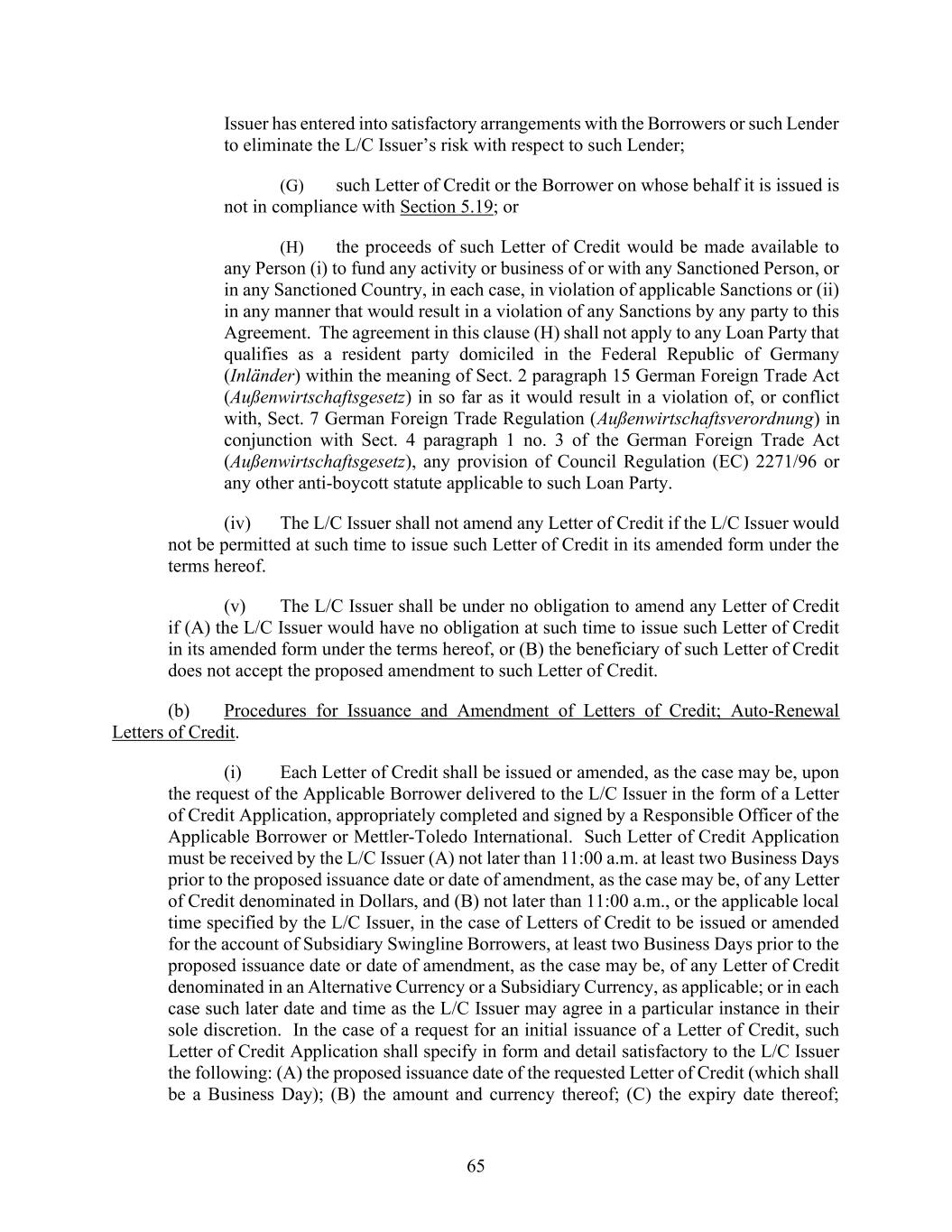 65 Issuer has entered into satisfactory arrangements with the Borrowers or such Lender to eliminate the L/C Issuer’s risk with respect to such Lender; (G) such Letter of Credit or the Borrower on whose behalf it is issued is not in compliance with Section 5.19; or (H) the proceeds of such Letter of Credit would be made available to any Person (i) to fund any activity or business of or with any Sanctioned Person, or in any Sanctioned Country, in each case, in violation of applicable Sanctions or (ii) in any manner that would result in a violation of any Sanctions by any party to this Agreement. The agreement in this clause (H) shall not apply to any Loan Party that qualifies as a resident party domiciled in the Federal Republic of Germany (Inländer) within the meaning of Sect. 2 paragraph 15 German Foreign Trade Act (Außenwirtschaftsgesetz) in so far as it would result in a violation of, or conflict with, Sect. 7 German Foreign Trade Regulation (Außenwirtschaftsverordnung) in conjunction with Sect. 4 paragraph 1 no. 3 of the German Foreign Trade Act (Außenwirtschaftsgesetz), any provision of Council Regulation (EC) 2271/96 or any other anti-boycott statute applicable to such Loan Party. (iv) The L/C Issuer shall not amend any Letter of Credit if the L/C Issuer would not be permitted at such time to issue such Letter of Credit in its amended form under the terms hereof. (v) The L/C Issuer shall be under no obligation to amend any Letter of Credit if (A) the L/C Issuer would have no obligation at such time to issue such Letter of Credit in its amended form under the terms hereof, or (B) the beneficiary of such Letter of Credit does not accept the proposed amendment to such Letter of Credit. (b) Procedures for Issuance and Amendment of Letters of Credit; Auto-Renewal Letters of Credit. (i) Each Letter of Credit shall be issued or amended, as the case may be, upon the request of the Applicable Borrower delivered to the L/C Issuer in the form of a Letter of Credit Application, appropriately completed and signed by a Responsible Officer of the Applicable Borrower or Mettler-Toledo International. Such Letter of Credit Application must be received by the L/C Issuer (A) not later than 11:00 a.m. at least two Business Days prior to the proposed issuance date or date of amendment, as the case may be, of any Letter of Credit denominated in Dollars, and (B) not later than 11:00 a.m., or the applicable local time specified by the L/C Issuer, in the case of Letters of Credit to be issued or amended for the account of Subsidiary Swingline Borrowers, at least two Business Days prior to the proposed issuance date or date of amendment, as the case may be, of any Letter of Credit denominated in an Alternative Currency or a Subsidiary Currency, as applicable; or in each case such later date and time as the L/C Issuer may agree in a particular instance in their sole discretion. In the case of a request for an initial issuance of a Letter of Credit, such Letter of Credit Application shall specify in form and detail satisfactory to the L/C Issuer the following: (A) the proposed issuance date of the requested Letter of Credit (which shall be a Business Day); (B) the amount and currency thereof; (C) the expiry date thereof;