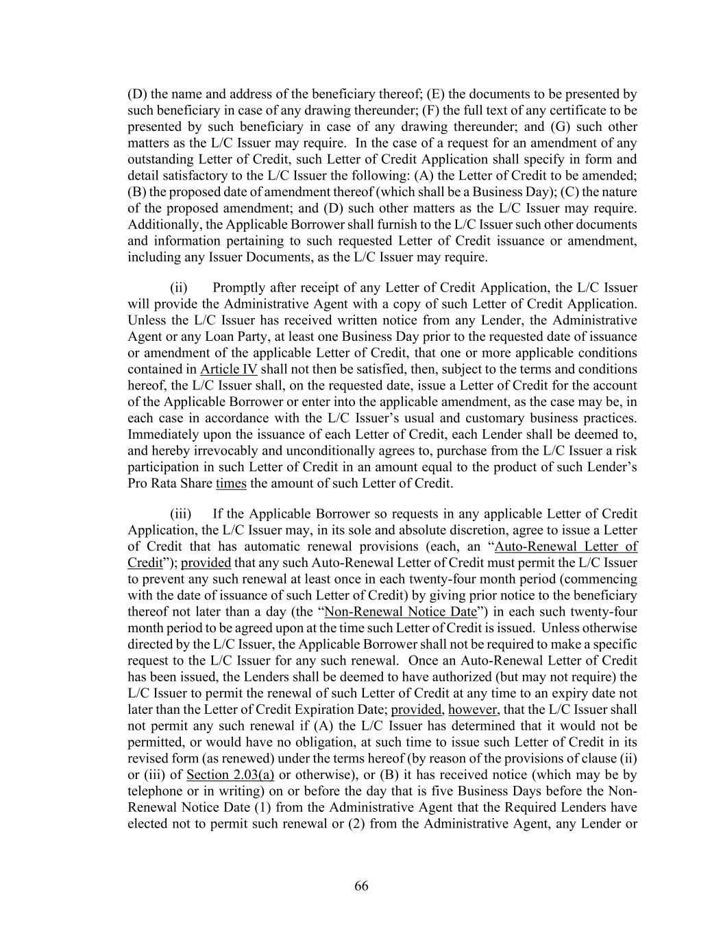 66 (D) the name and address of the beneficiary thereof; (E) the documents to be presented by such beneficiary in case of any drawing thereunder; (F) the full text of any certificate to be presented by such beneficiary in case of any drawing thereunder; and (G) such other matters as the L/C Issuer may require. In the case of a request for an amendment of any outstanding Letter of Credit, such Letter of Credit Application shall specify in form and detail satisfactory to the L/C Issuer the following: (A) the Letter of Credit to be amended; (B) the proposed date of amendment thereof (which shall be a Business Day); (C) the nature of the proposed amendment; and (D) such other matters as the L/C Issuer may require. Additionally, the Applicable Borrower shall furnish to the L/C Issuer such other documents and information pertaining to such requested Letter of Credit issuance or amendment, including any Issuer Documents, as the L/C Issuer may require. (ii) Promptly after receipt of any Letter of Credit Application, the L/C Issuer will provide the Administrative Agent with a copy of such Letter of Credit Application. Unless the L/C Issuer has received written notice from any Lender, the Administrative Agent or any Loan Party, at least one Business Day prior to the requested date of issuance or amendment of the applicable Letter of Credit, that one or more applicable conditions contained in Article IV shall not then be satisfied, then, subject to the terms and conditions hereof, the L/C Issuer shall, on the requested date, issue a Letter of Credit for the account of the Applicable Borrower or enter into the applicable amendment, as the case may be, in each case in accordance with the L/C Issuer’s usual and customary business practices. Immediately upon the issuance of each Letter of Credit, each Lender shall be deemed to, and hereby irrevocably and unconditionally agrees to, purchase from the L/C Issuer a risk participation in such Letter of Credit in an amount equal to the product of such Lender’s Pro Rata Share times the amount of such Letter of Credit. (iii) If the Applicable Borrower so requests in any applicable Letter of Credit Application, the L/C Issuer may, in its sole and absolute discretion, agree to issue a Letter of Credit that has automatic renewal provisions (each, an “Auto-Renewal Letter of Credit”); provided that any such Auto-Renewal Letter of Credit must permit the L/C Issuer to prevent any such renewal at least once in each twenty-four month period (commencing with the date of issuance of such Letter of Credit) by giving prior notice to the beneficiary thereof not later than a day (the “Non-Renewal Notice Date”) in each such twenty-four month period to be agreed upon at the time such Letter of Credit is issued. Unless otherwise directed by the L/C Issuer, the Applicable Borrower shall not be required to make a specific request to the L/C Issuer for any such renewal. Once an Auto-Renewal Letter of Credit has been issued, the Lenders shall be deemed to have authorized (but may not require) the L/C Issuer to permit the renewal of such Letter of Credit at any time to an expiry date not later than the Letter of Credit Expiration Date; provided, however, that the L/C Issuer shall not permit any such renewal if (A) the L/C Issuer has determined that it would not be permitted, or would have no obligation, at such time to issue such Letter of Credit in its revised form (as renewed) under the terms hereof (by reason of the provisions of clause (ii) or (iii) of Section 2.03(a) or otherwise), or (B) it has received notice (which may be by telephone or in writing) on or before the day that is five Business Days before the Non- Renewal Notice Date (1) from the Administrative Agent that the Required Lenders have elected not to permit such renewal or (2) from the Administrative Agent, any Lender or